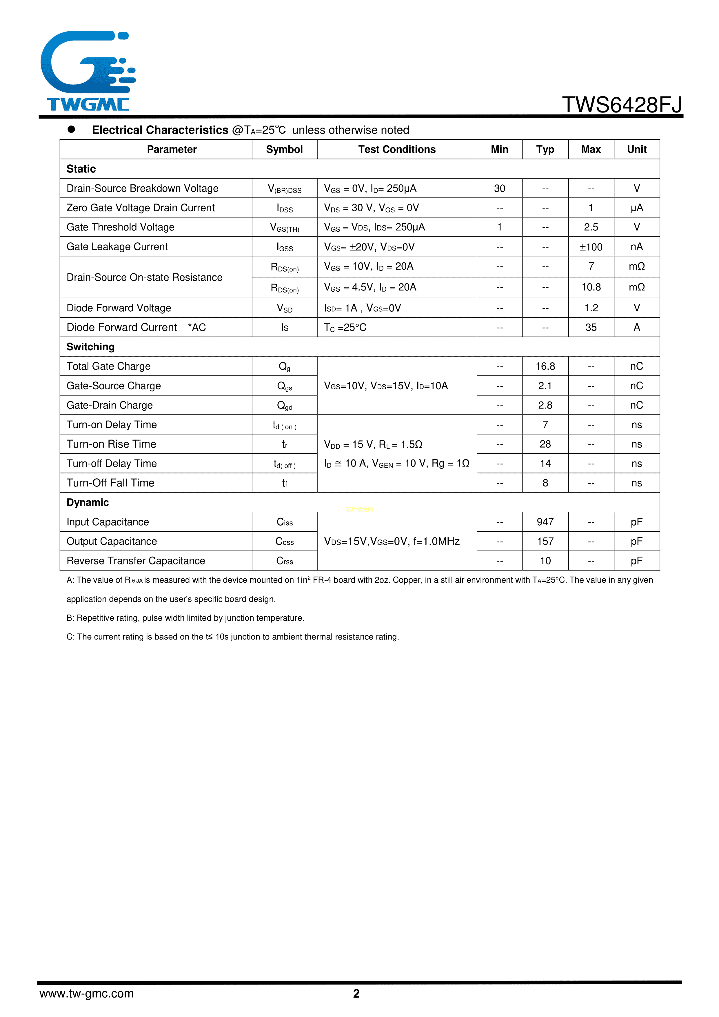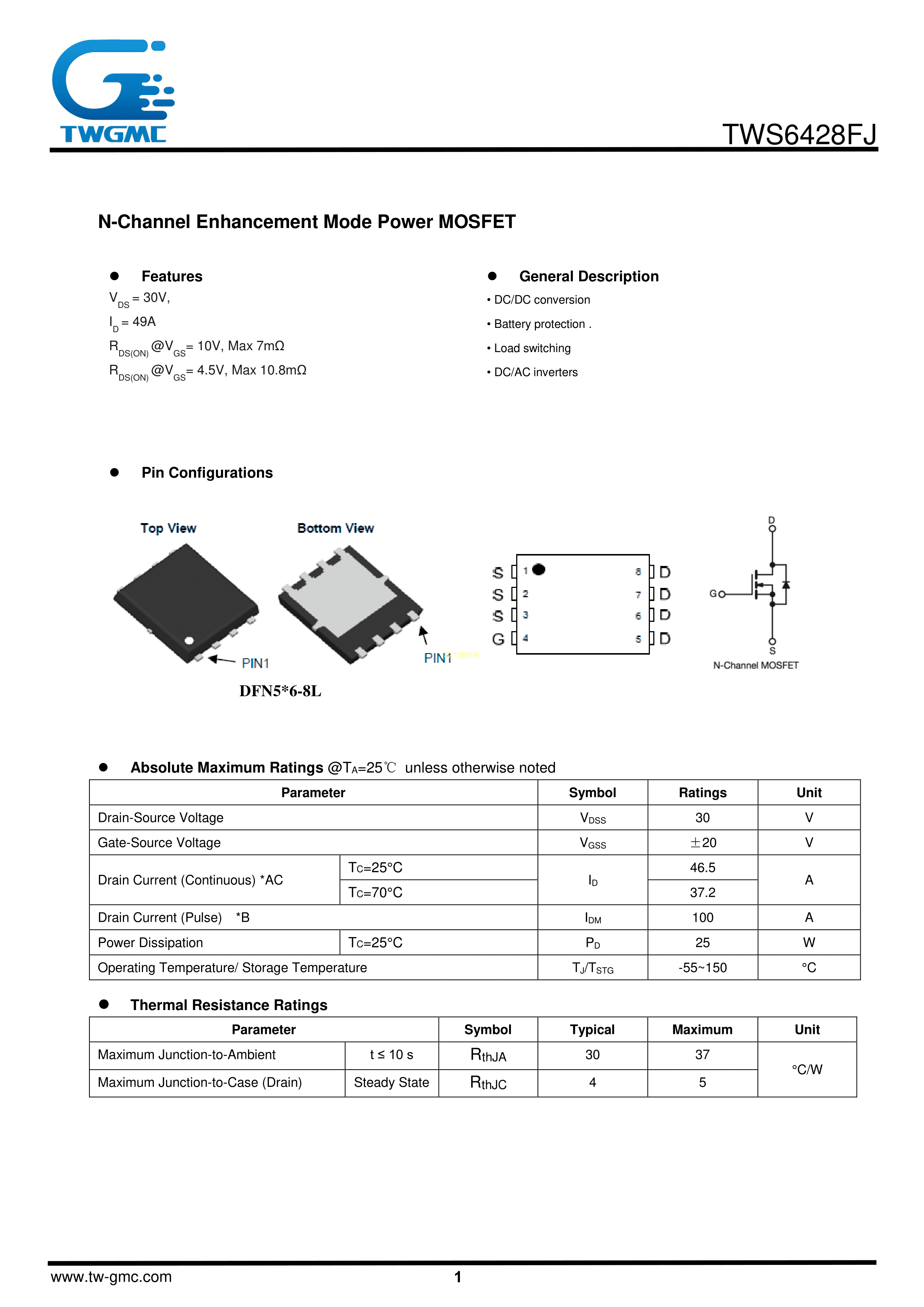 TWS6428FJ数据手册DFN5x6-8L封装TWGMC(台湾迪嘉)PDF规格书,中英文下载