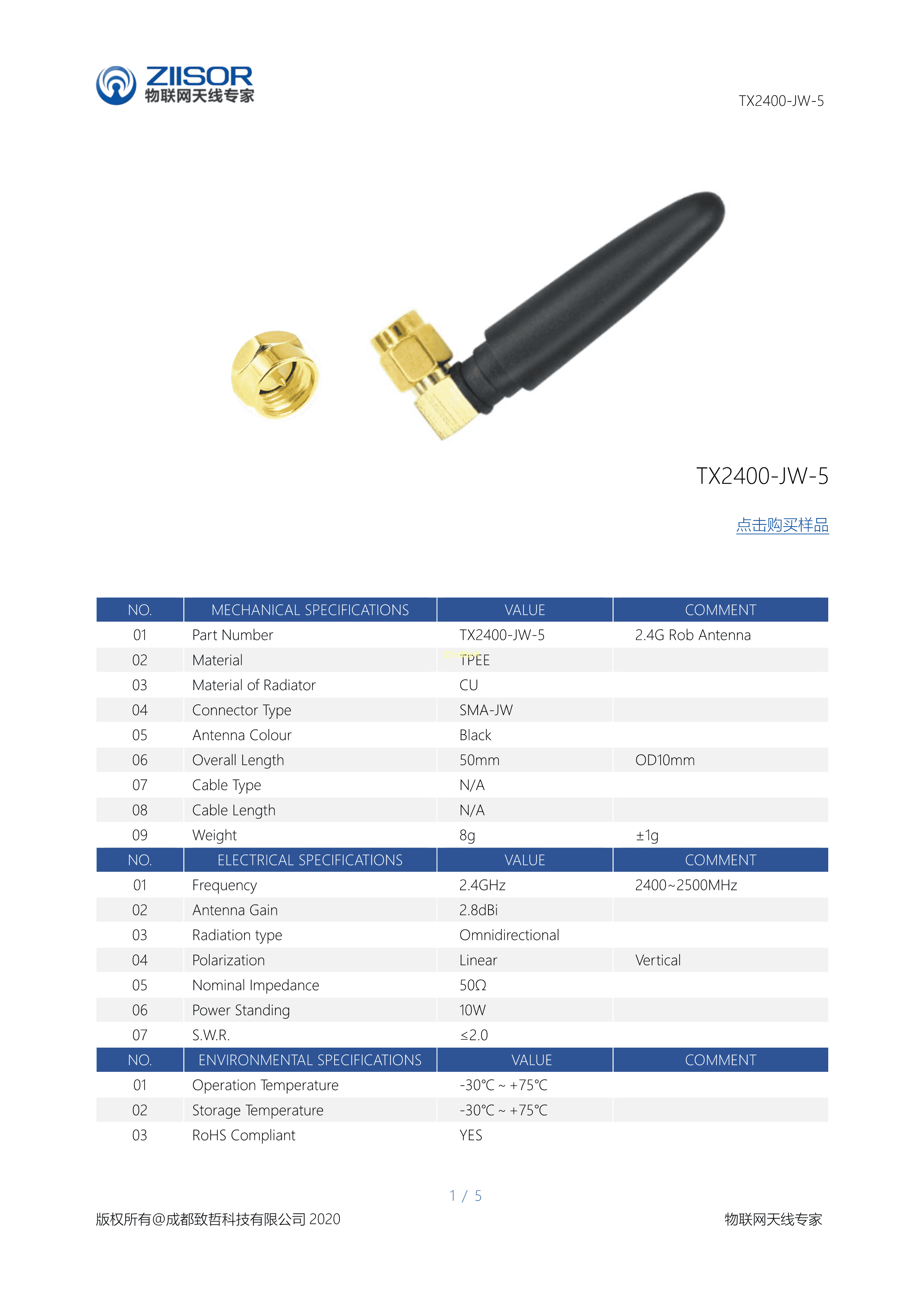 TX2400-JW-5数据手册50mmx10mm封装Ziisor(致哲)PDF规格书,中英文下载