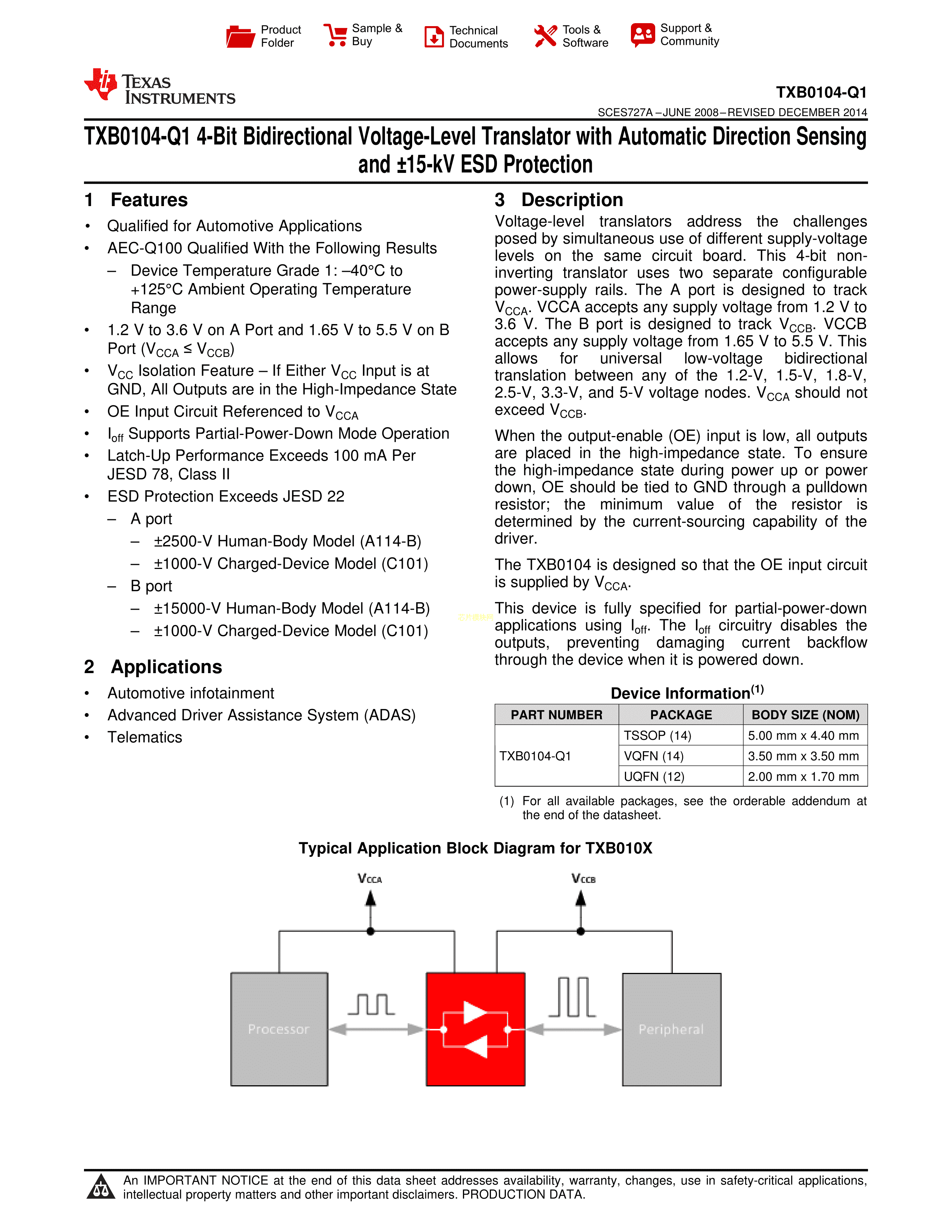 TXB0104QRGYRQ1数据手册VQFN-14_3.6x3.6x05P封装TI(德州仪器)PDF