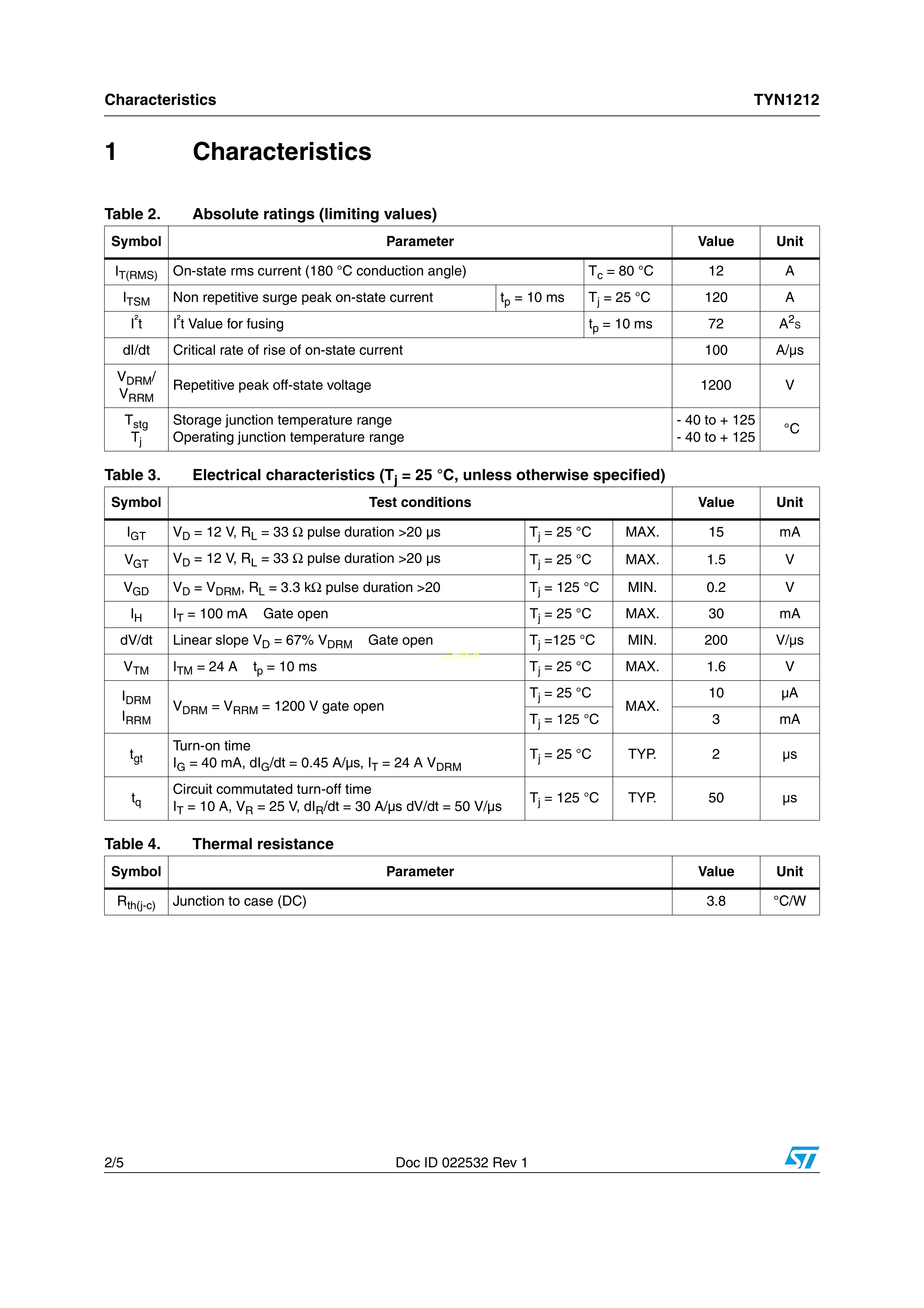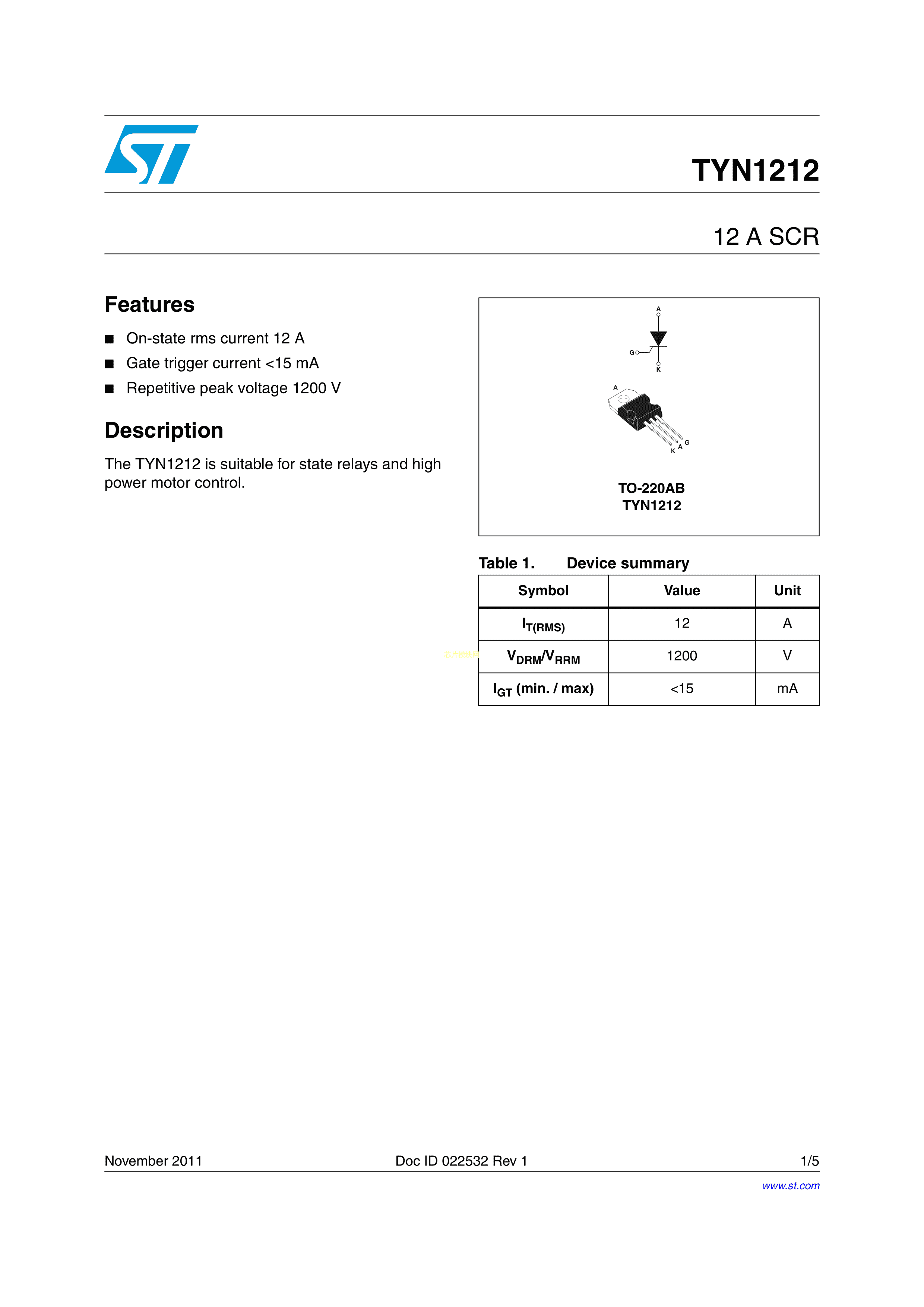 TYN1212RG数据手册TO-220AB封装ST(意法半导体)PDF规格书,中英文下载