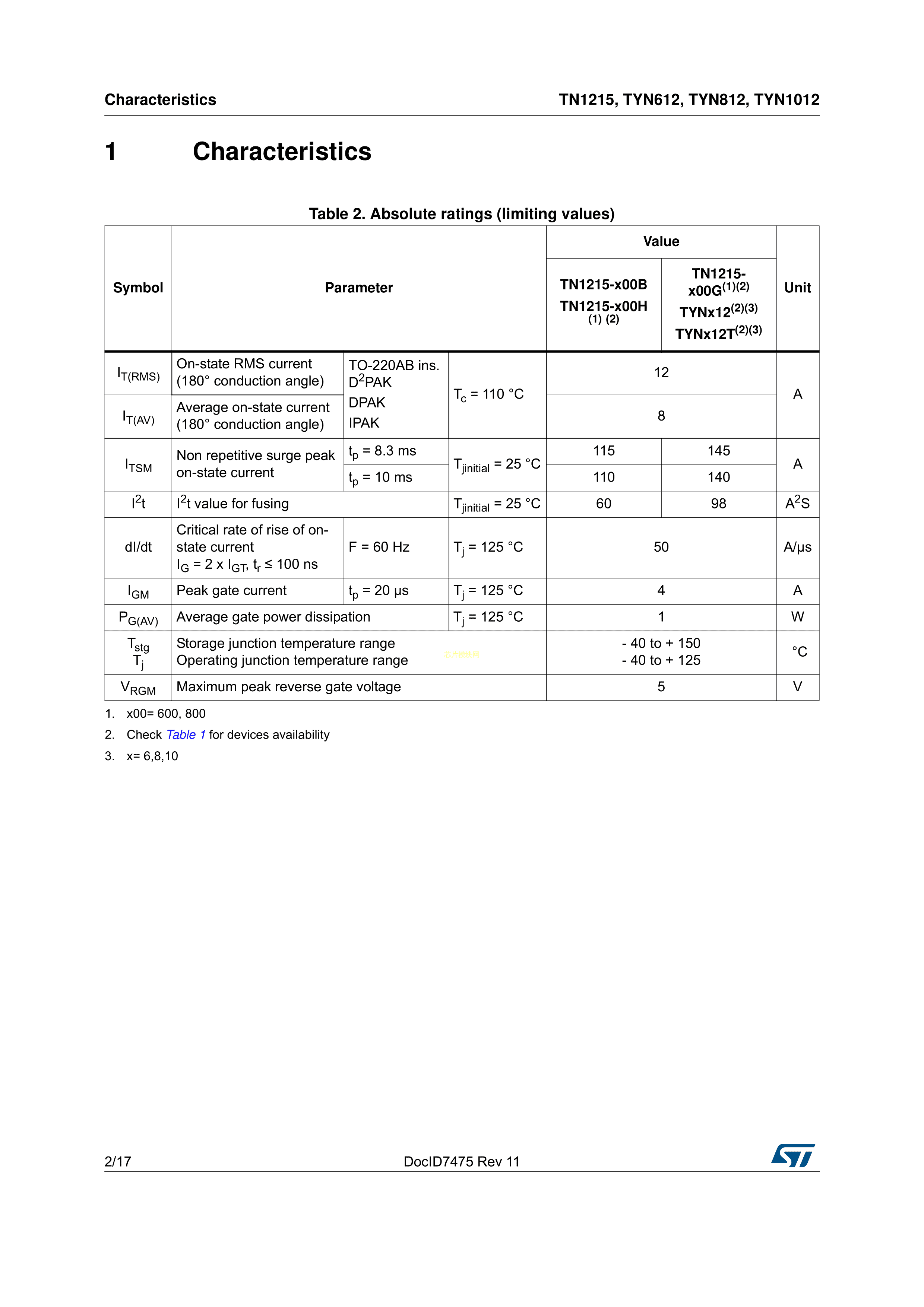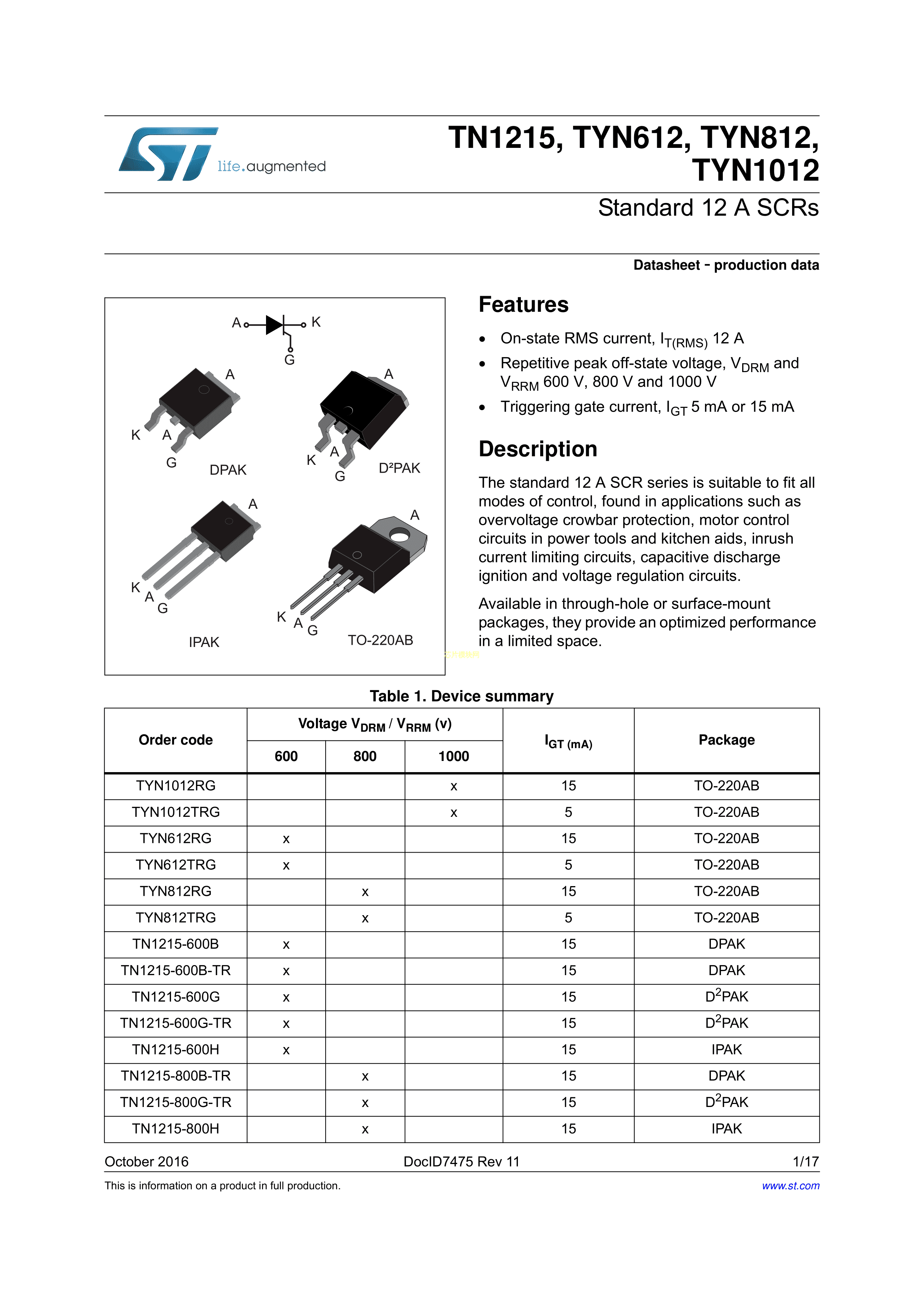 TYN812RG数据手册TO-220AB封装ST(意法半导体)PDF规格书,中英文下载