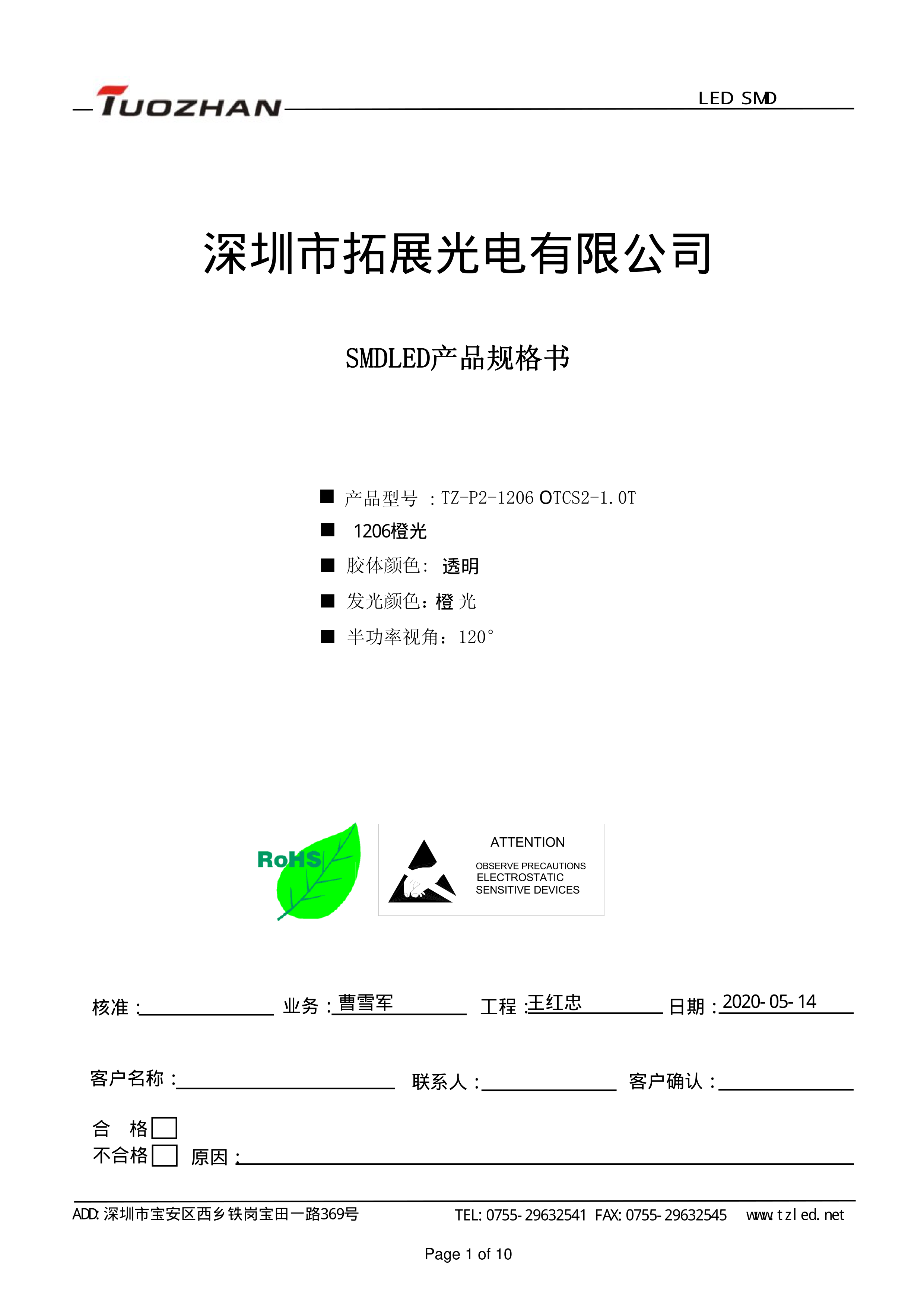 TZ-P2-1206 0 TCS2-1.0T数据手册1206封装TUOZHAN(拓展光电)PDF规格