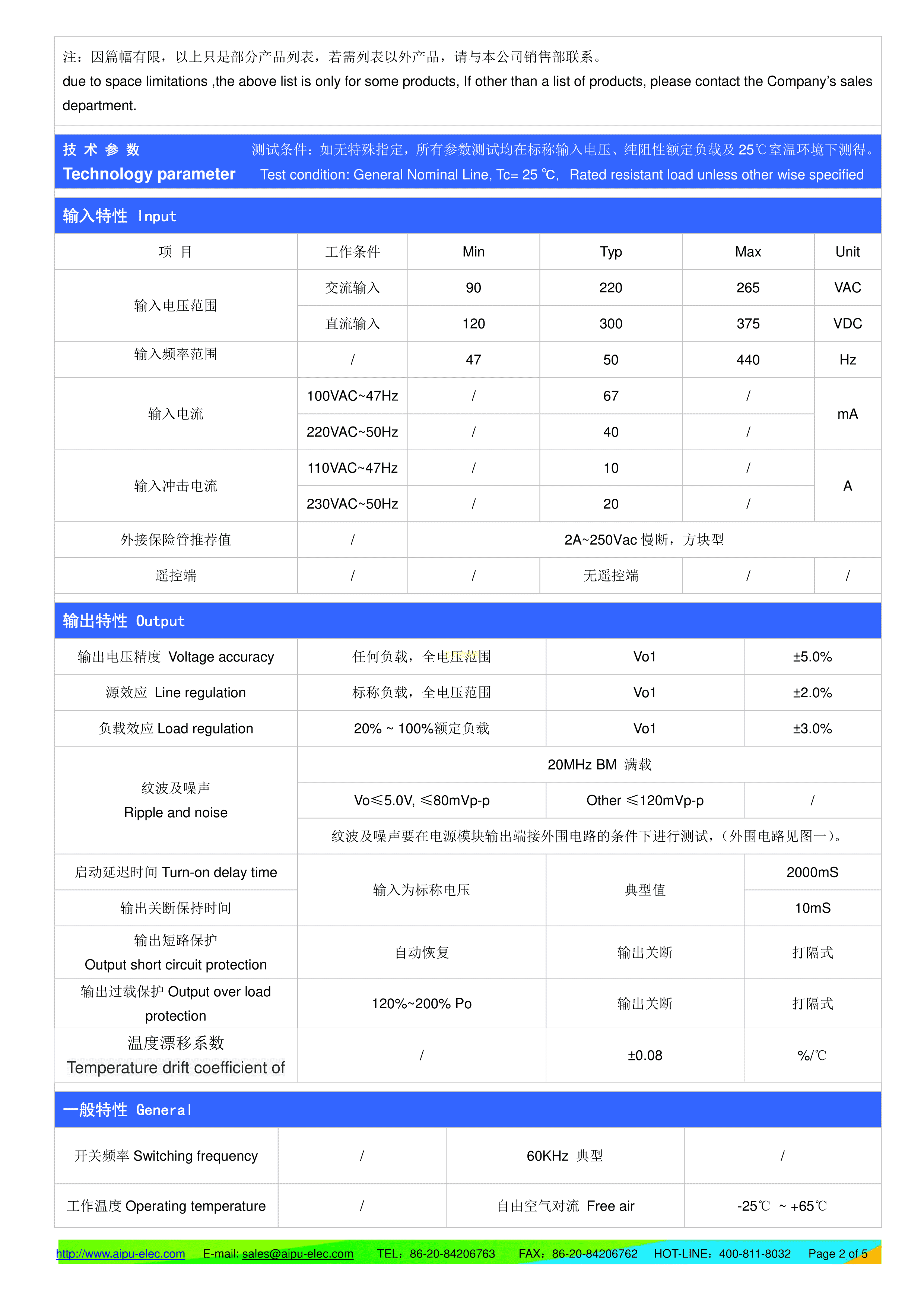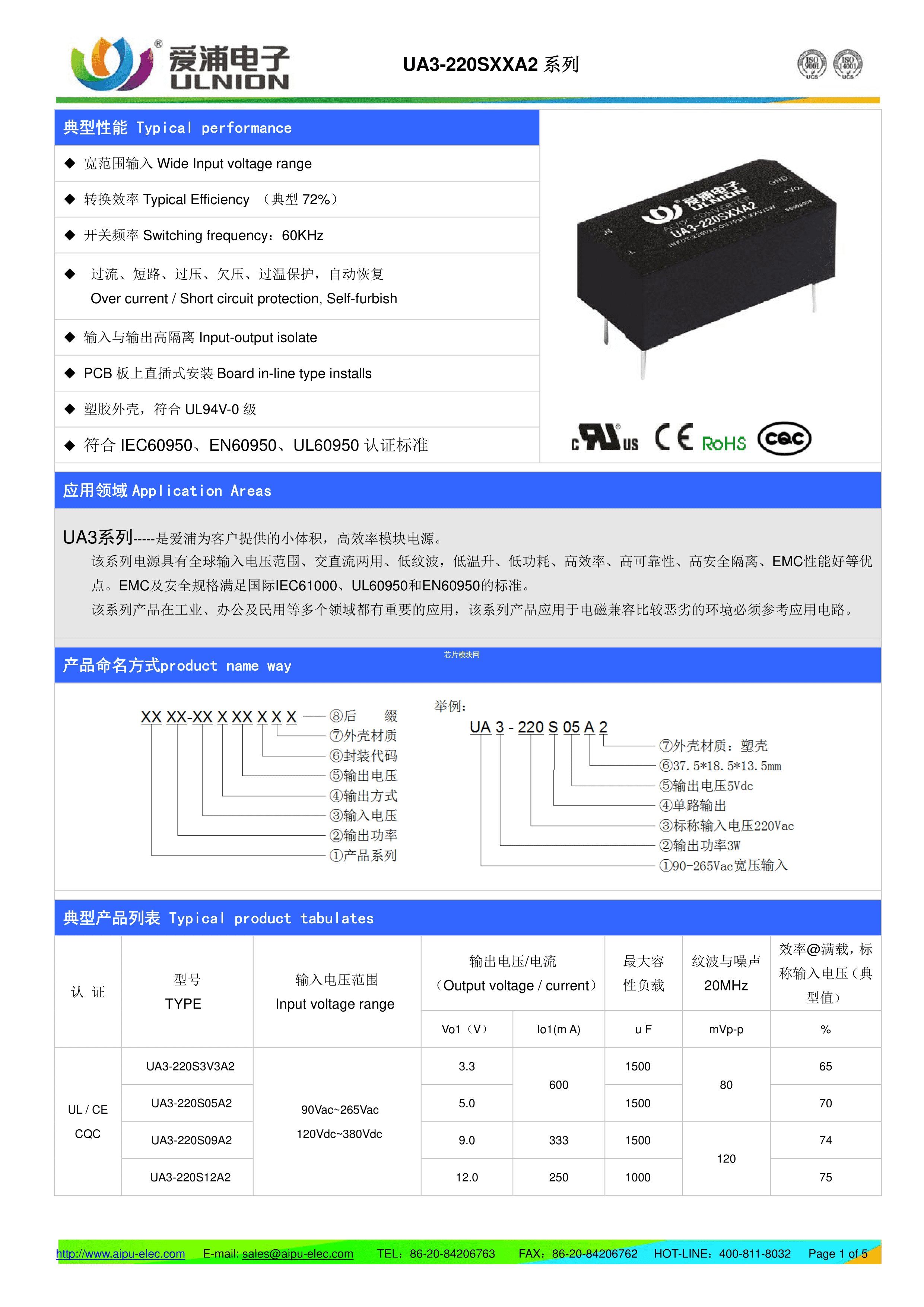 UA3-220S05A2数据手册插件封装AIPULNION(爱浦电子)PDF规格书,中英文下载