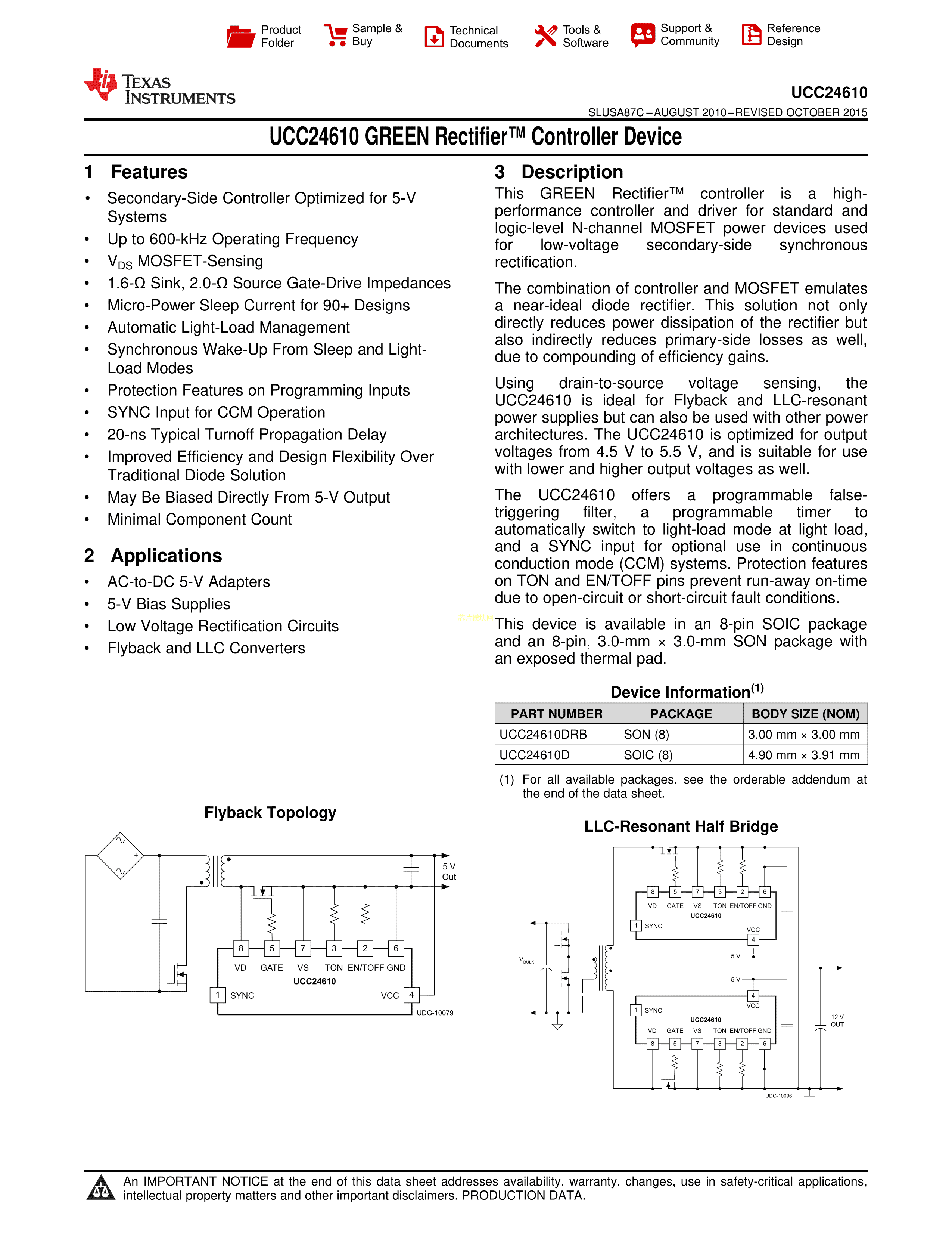 UCC24610DR数据手册SOIC-8_150mil封装TI(德州仪器)PDF规格书,中英文下载