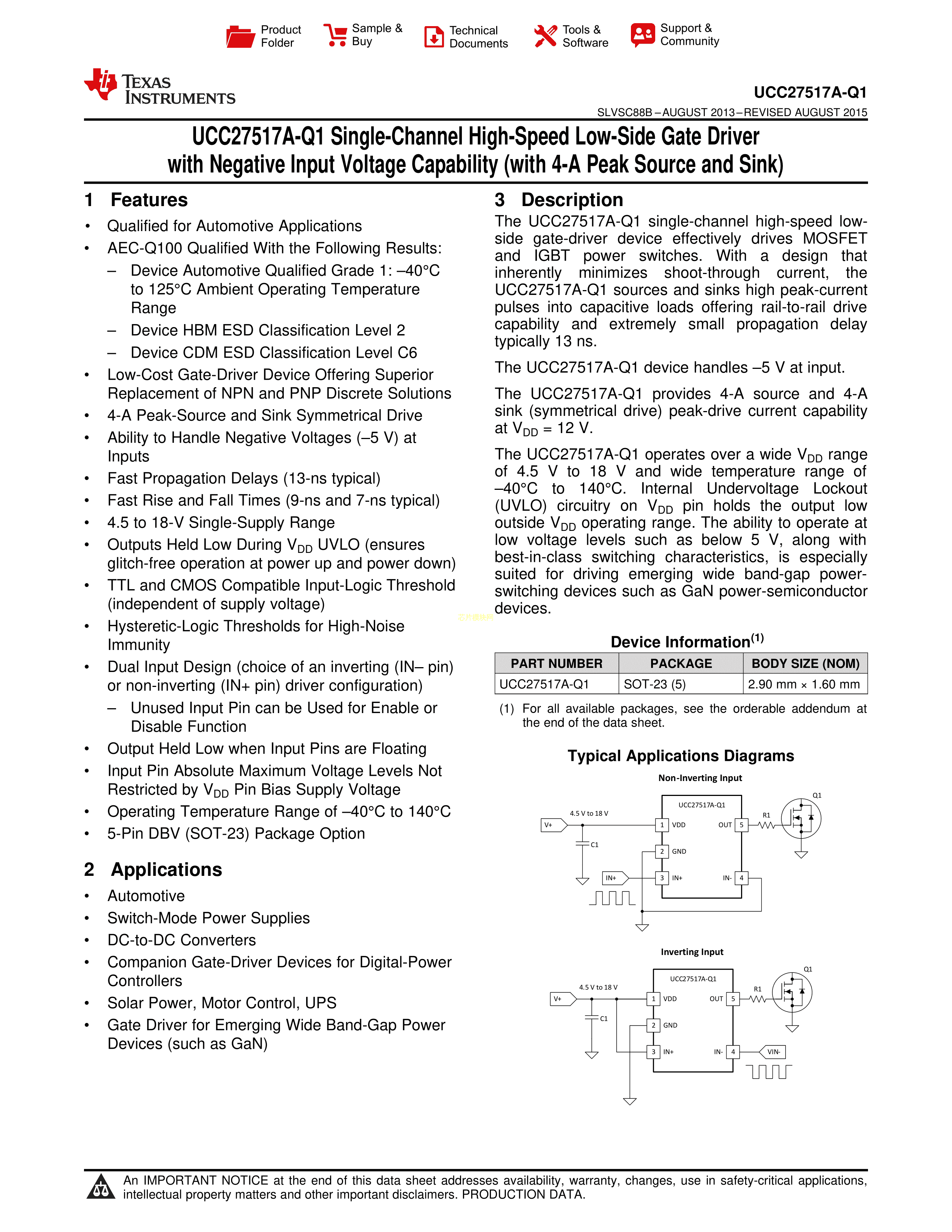 UCC27517AQDBVRQ1数据手册SOT-23-5封装TI(德州仪器)PDF规格书,中英文下载
