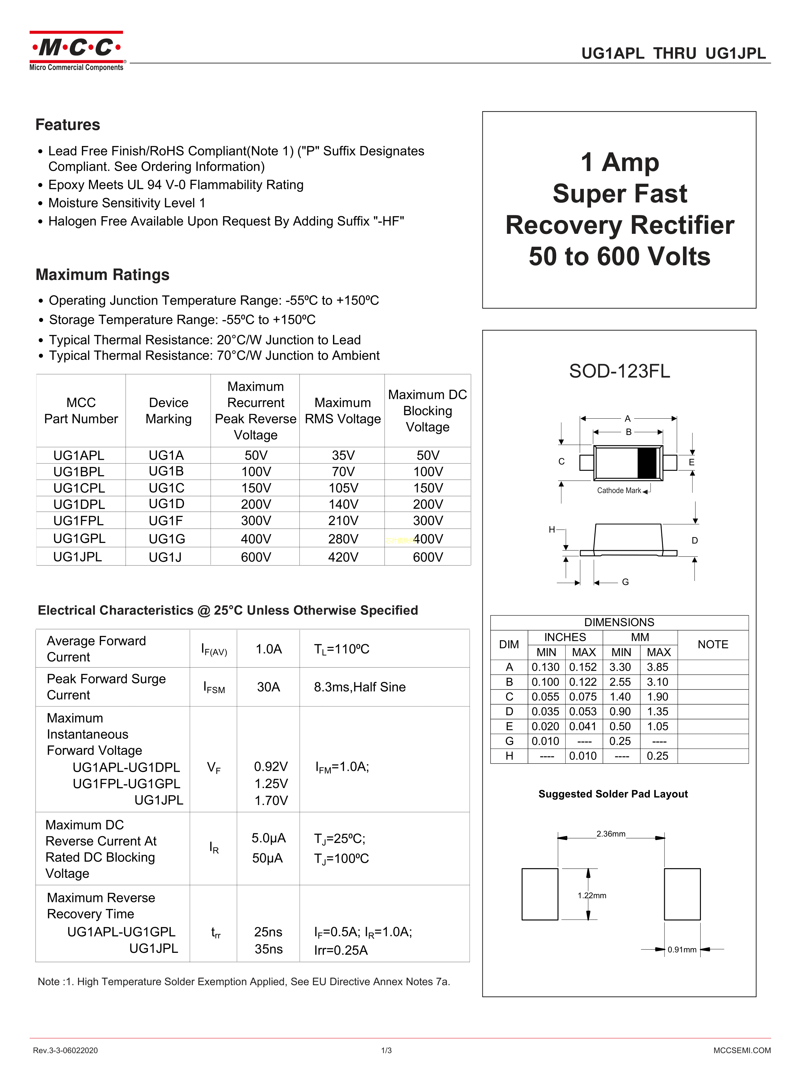 UG1JPL-TP数据手册SOD-123FL封装MCC(美微科)PDF规格书,中英文下载