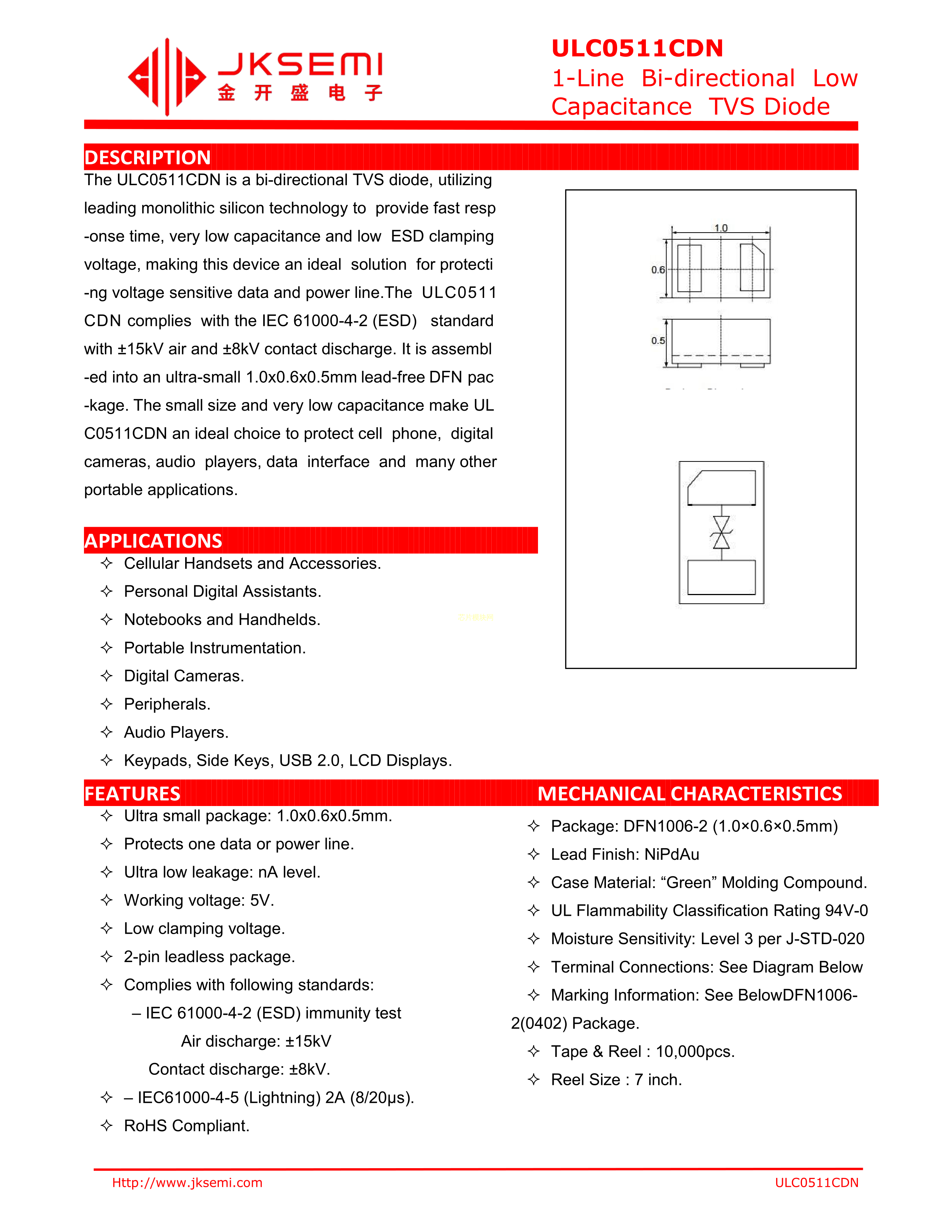 ULC0511CDN数据手册DFN1006-2(1x0.6x0.5mm)封装JKSEMI(金开盛)P