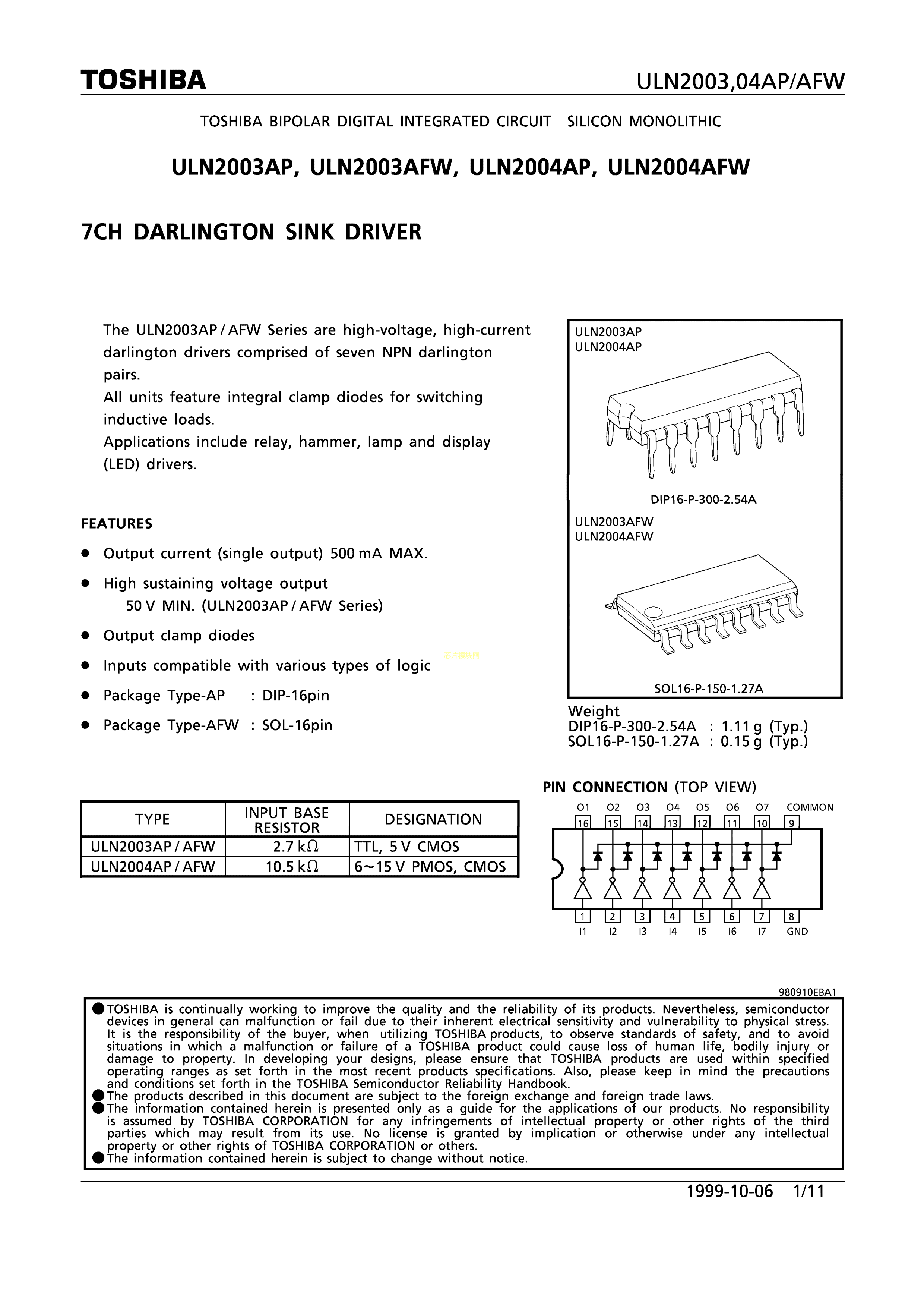 ULN2003AFWG数据手册SOIC-16_150mil封装TOSHIBA(东芝)PDF规格书,中
