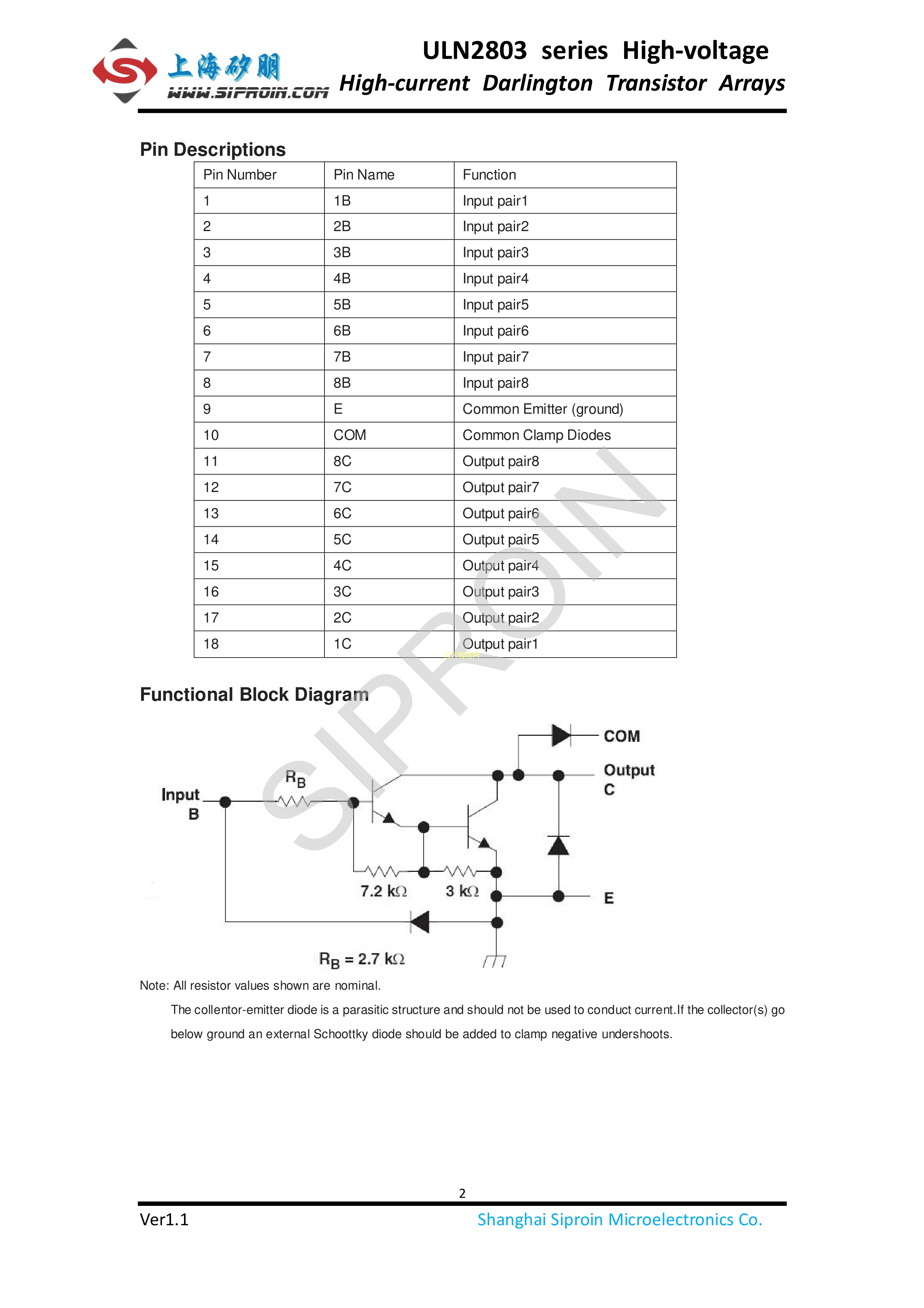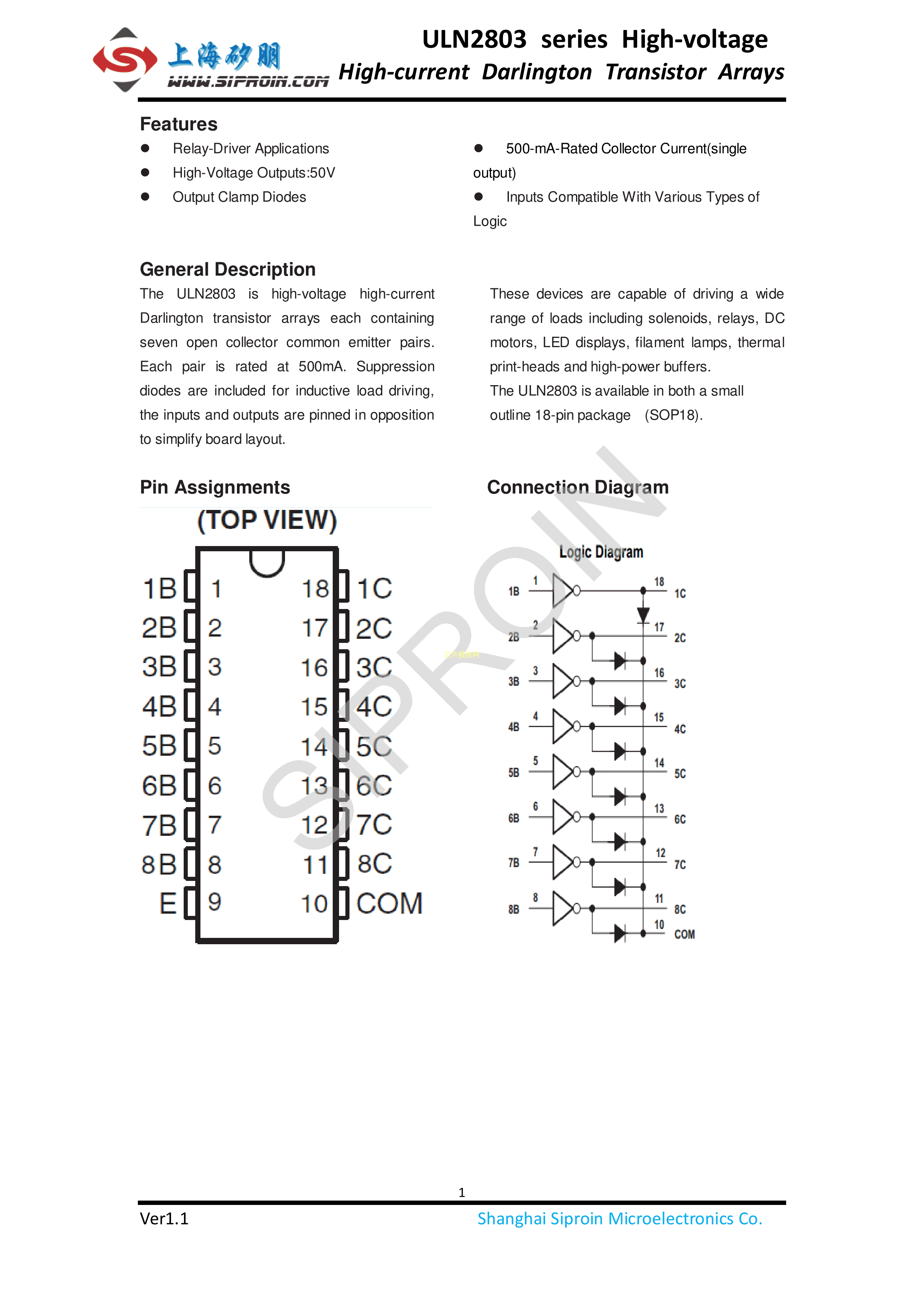 ULN2803数据手册SOP-18封装Siproin(上海矽朋)PDF规格书,中英文下载