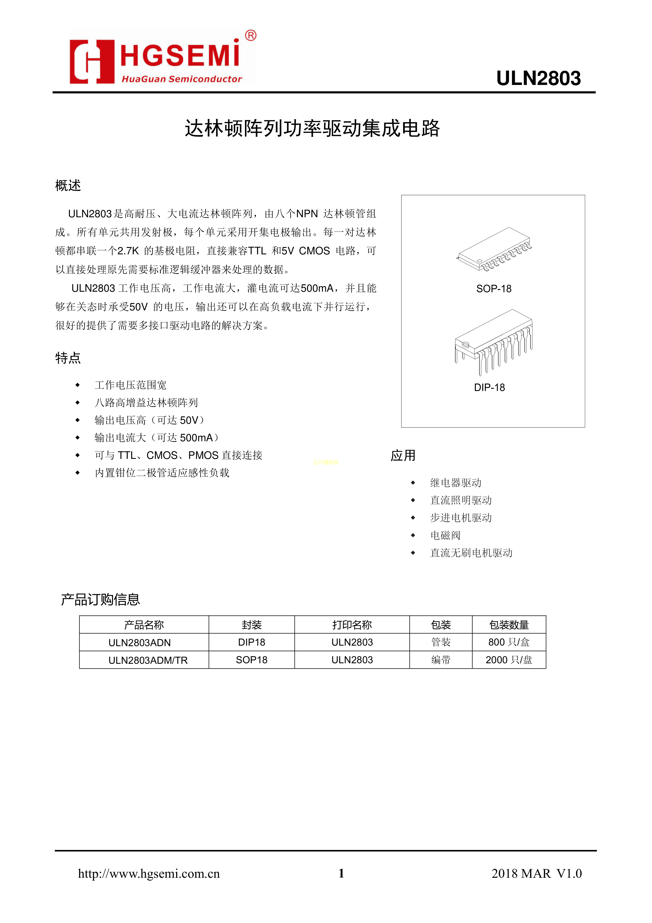 ULN2803ADM-TR数据手册SOP-18封装HGSEMI(华冠)PDF规格书,中英文下载