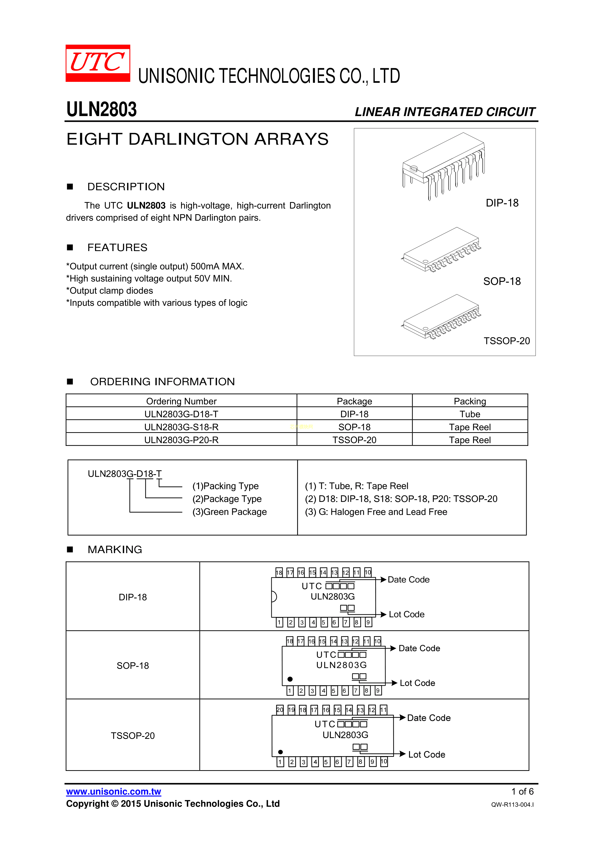 ULN2803G-D18-T数据手册DIP-18封装UTC(友顺)PDF规格书,中英文下载