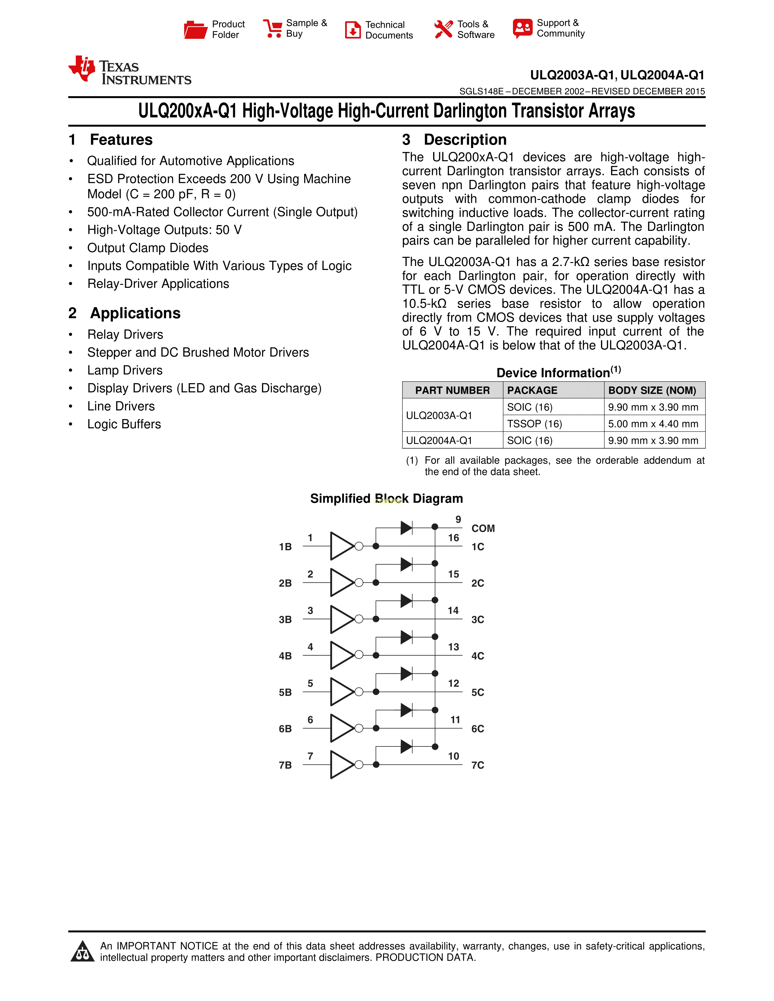 ULQ2003ATDRQ1数据手册SOIC-16封装TI(德州仪器)PDF规格书,中英文下载