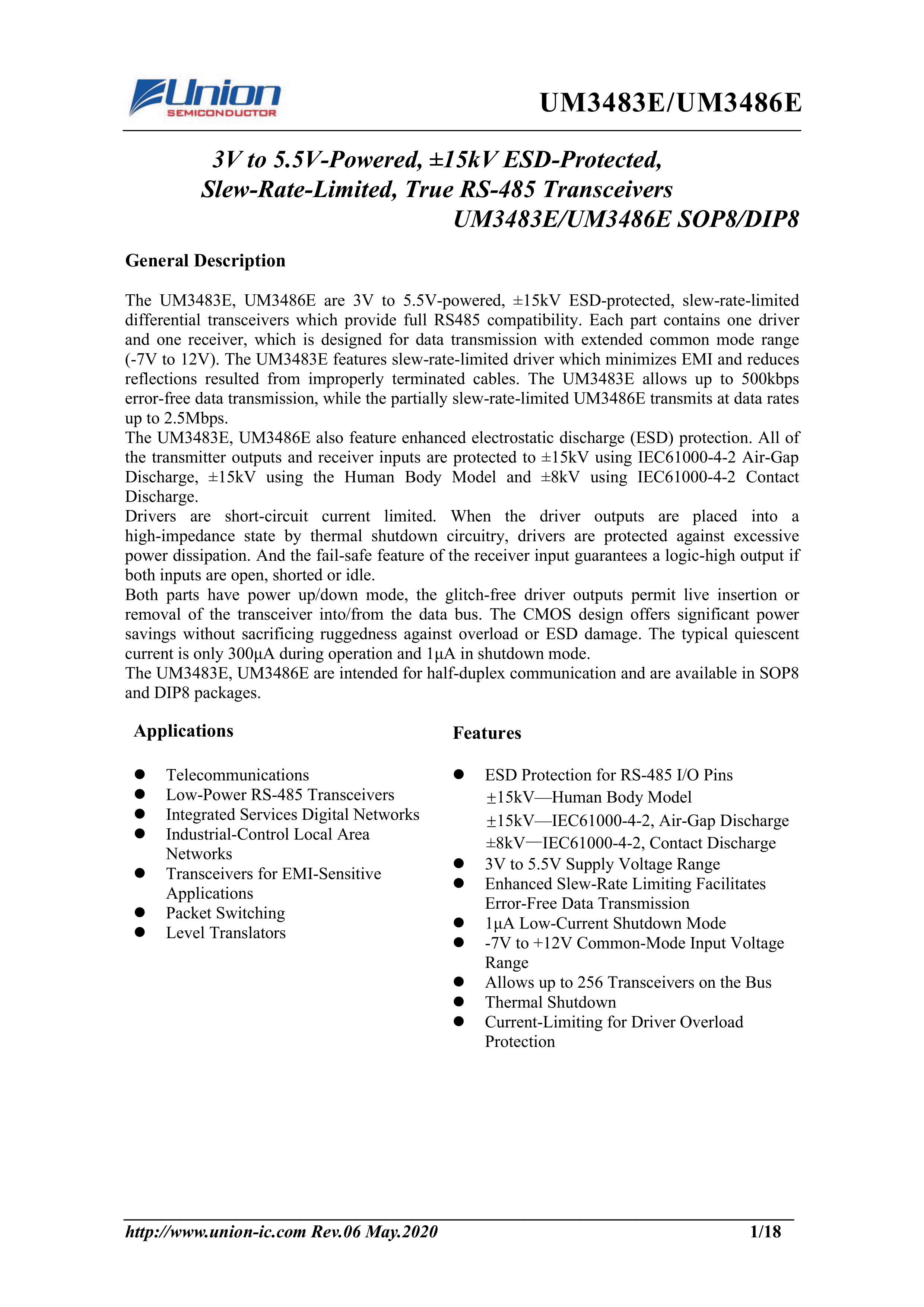 UM3483EESA数据手册SOP-8封装Union(英联)PDF规格书,中英文下载