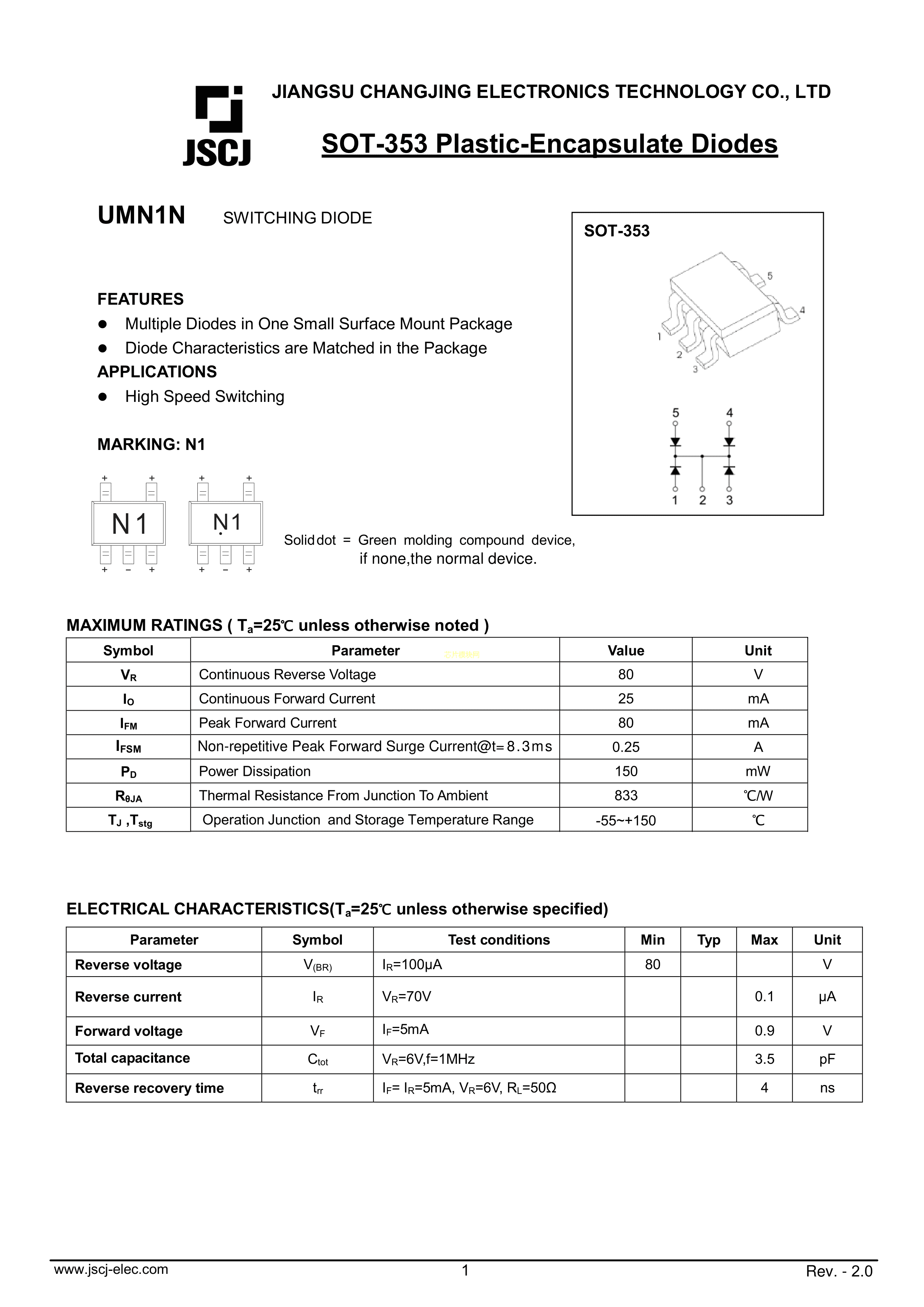 UMN1N数据手册SOT-353封装CJ(江苏长电-长晶)PDF规格书,中英文下载