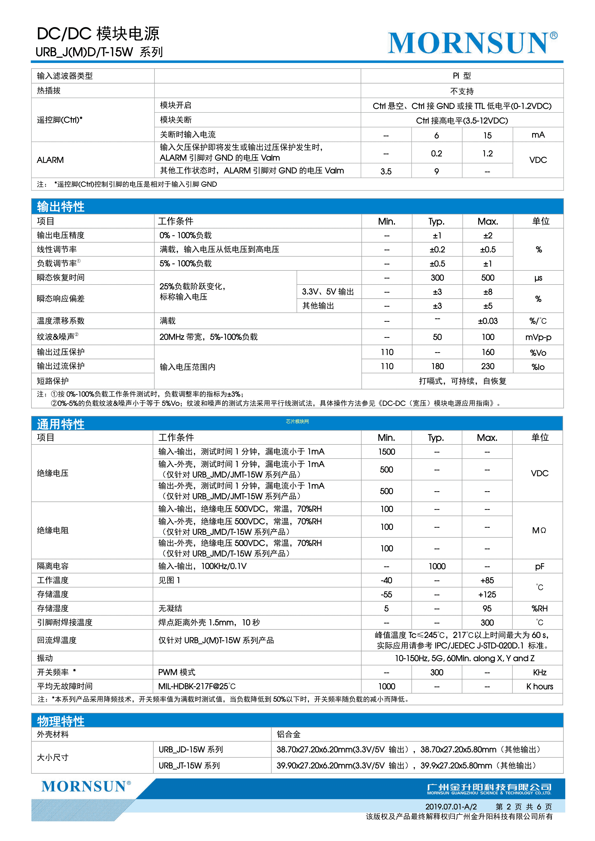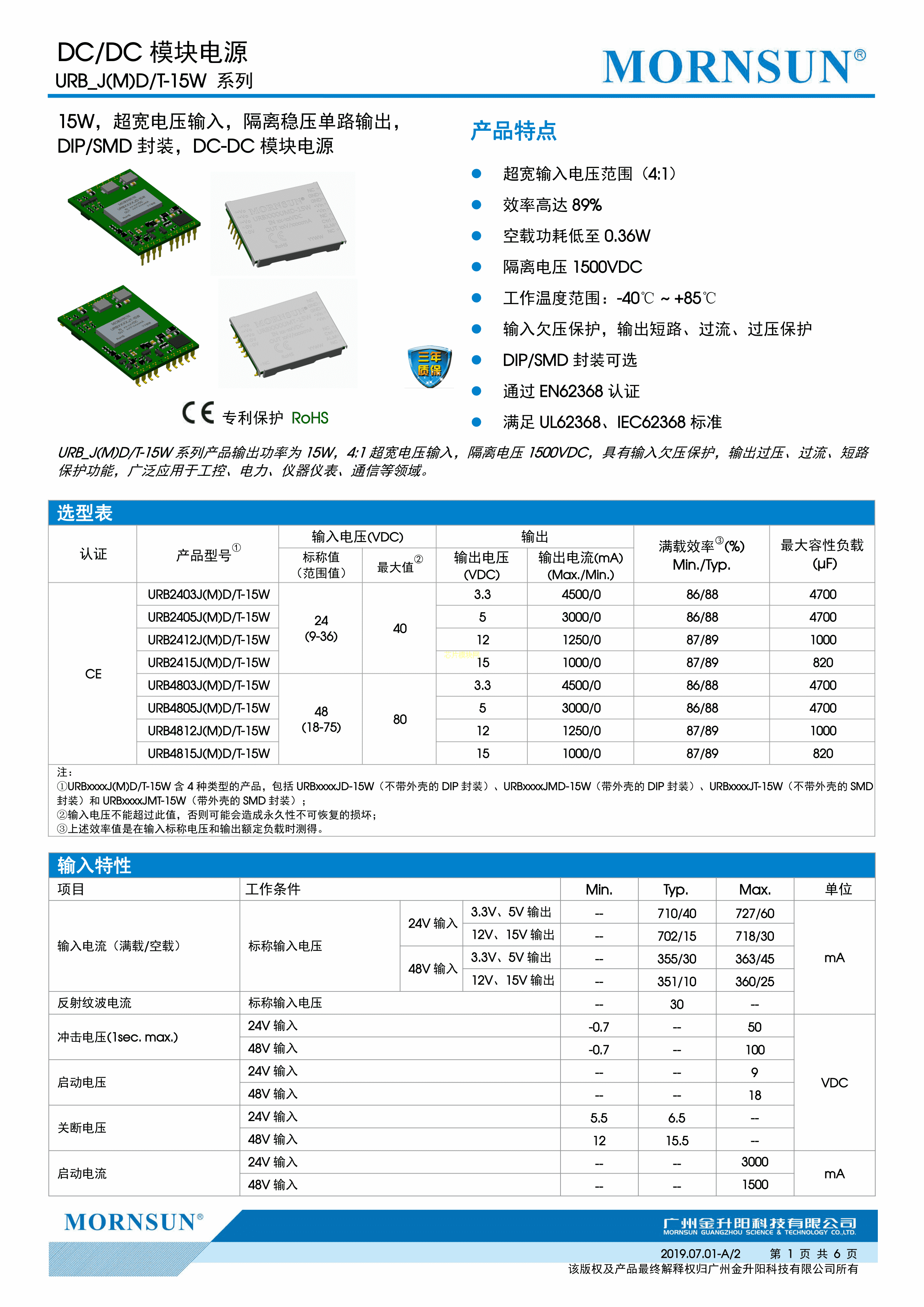 URB2405JMT-15W数据手册SMD封装MORNSUN(金升阳)PDF规格书,中英文下载