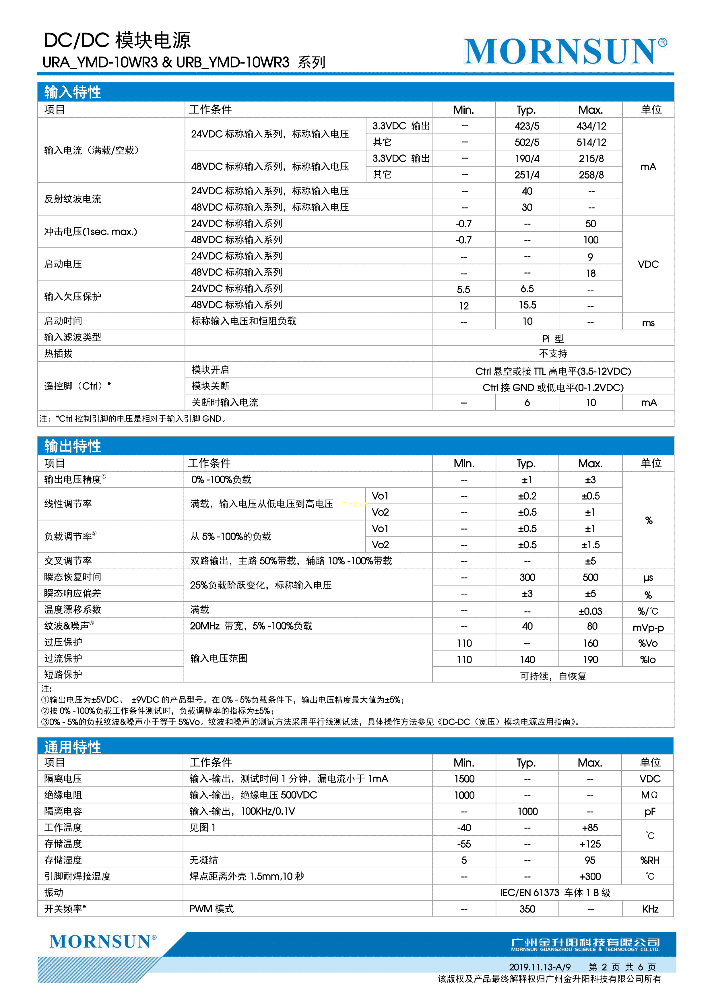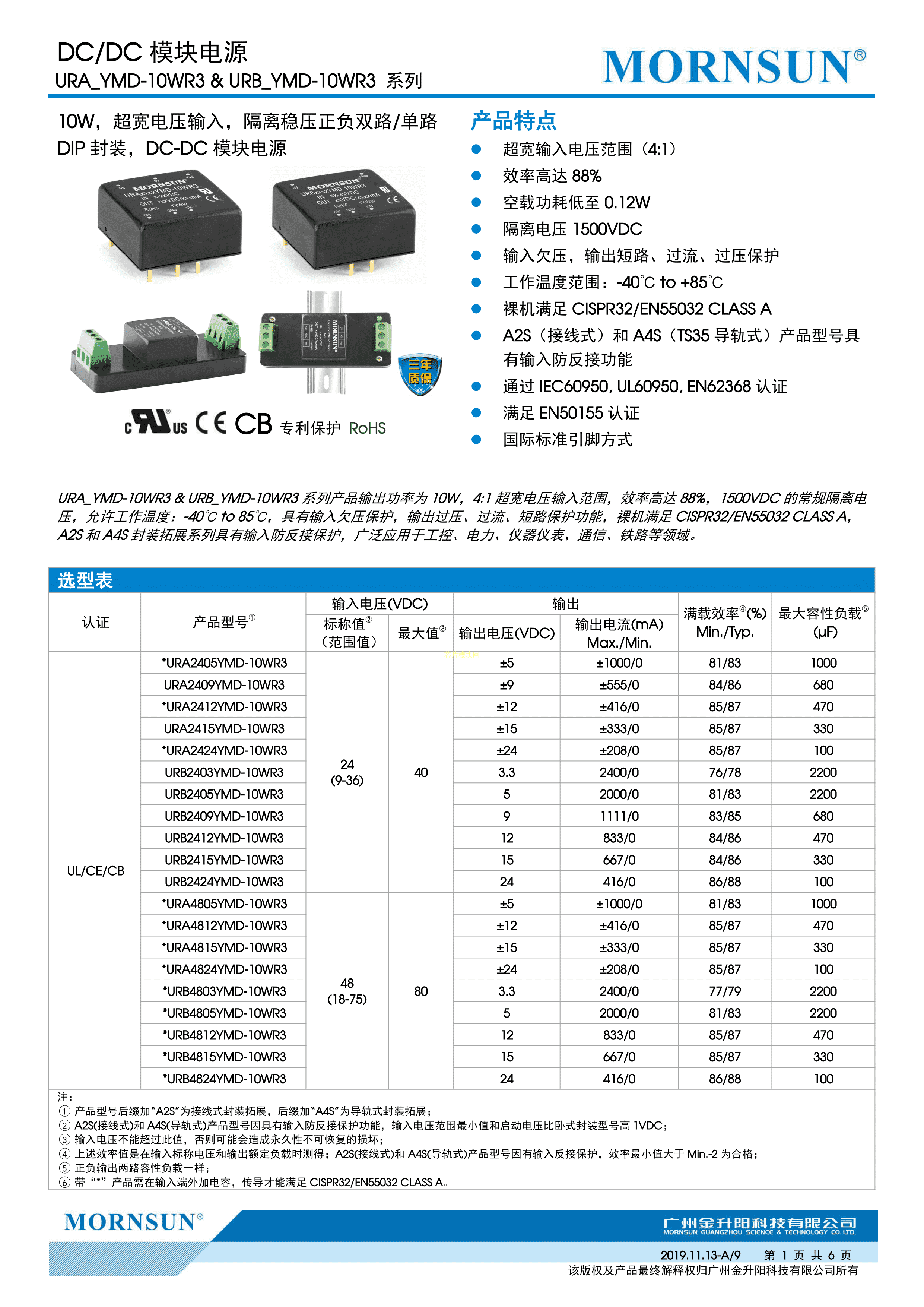 URB4815YMD-10WR3数据手册插件封装MORNSUN(金升阳)PDF规格书,中英文下载
