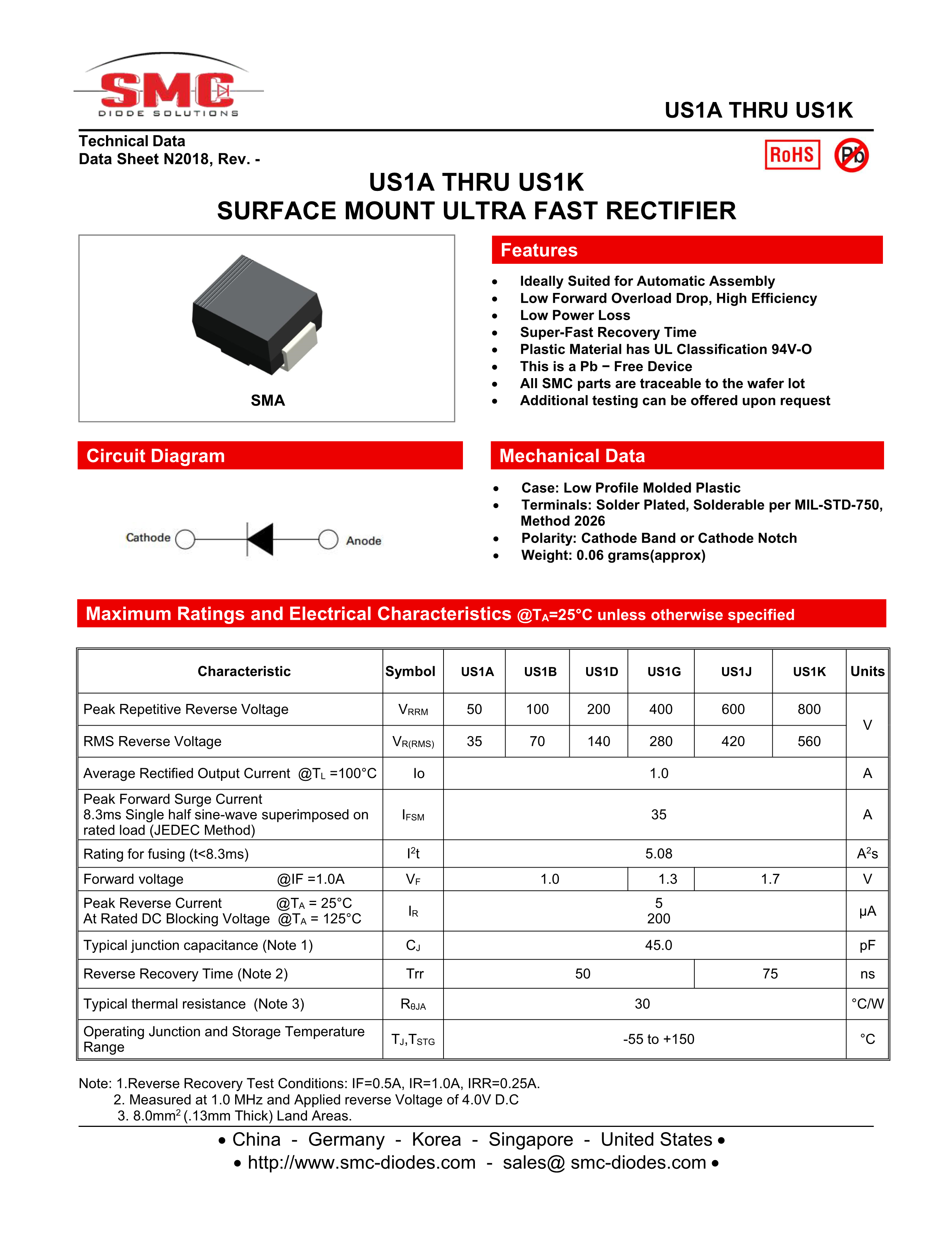 US1D数据手册SMA封装SMC(桑德斯)PDF规格书,中英文下载