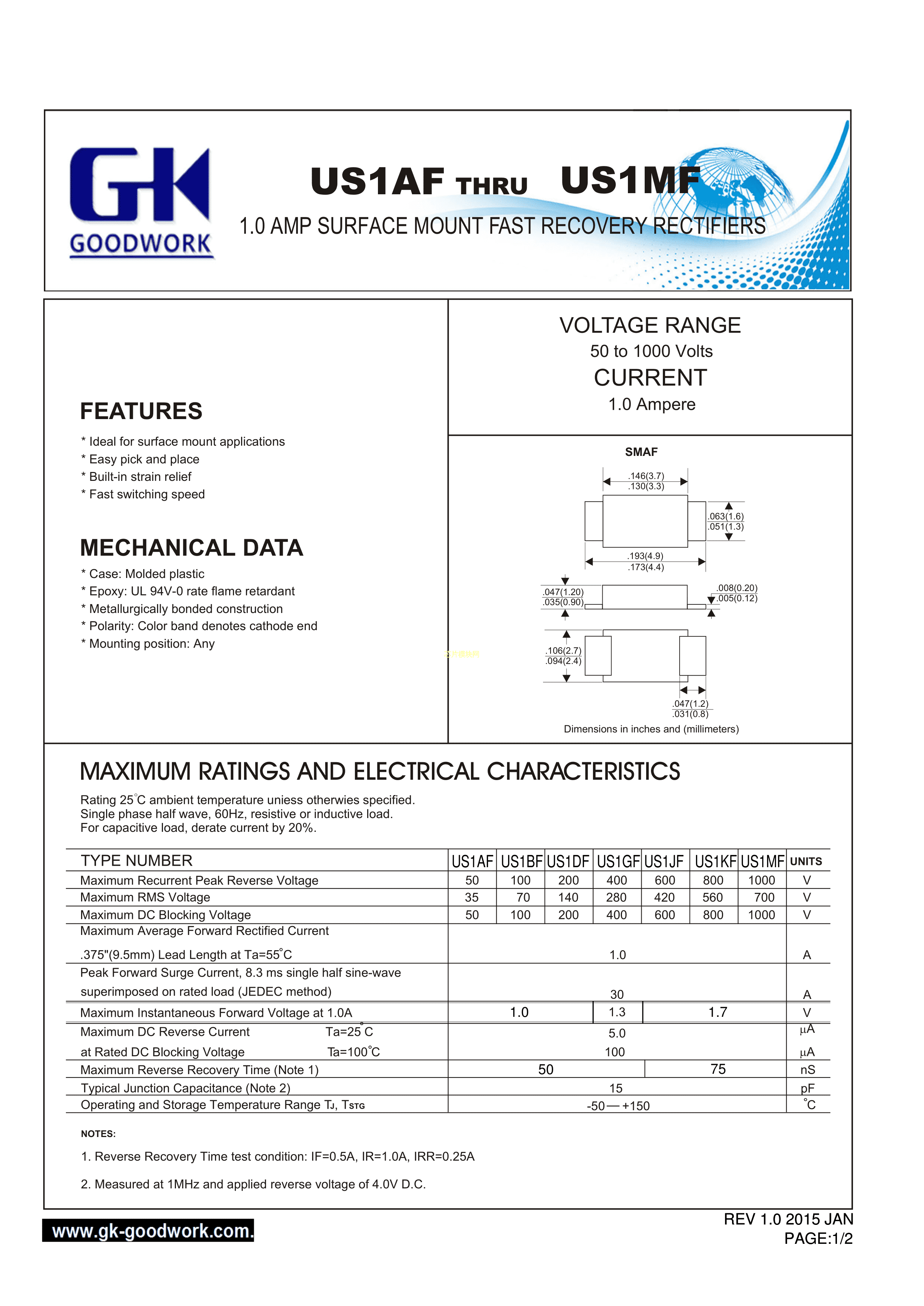 US1DF数据手册SMAF封装GOODWORK(固得沃克)PDF规格书,中英文下载