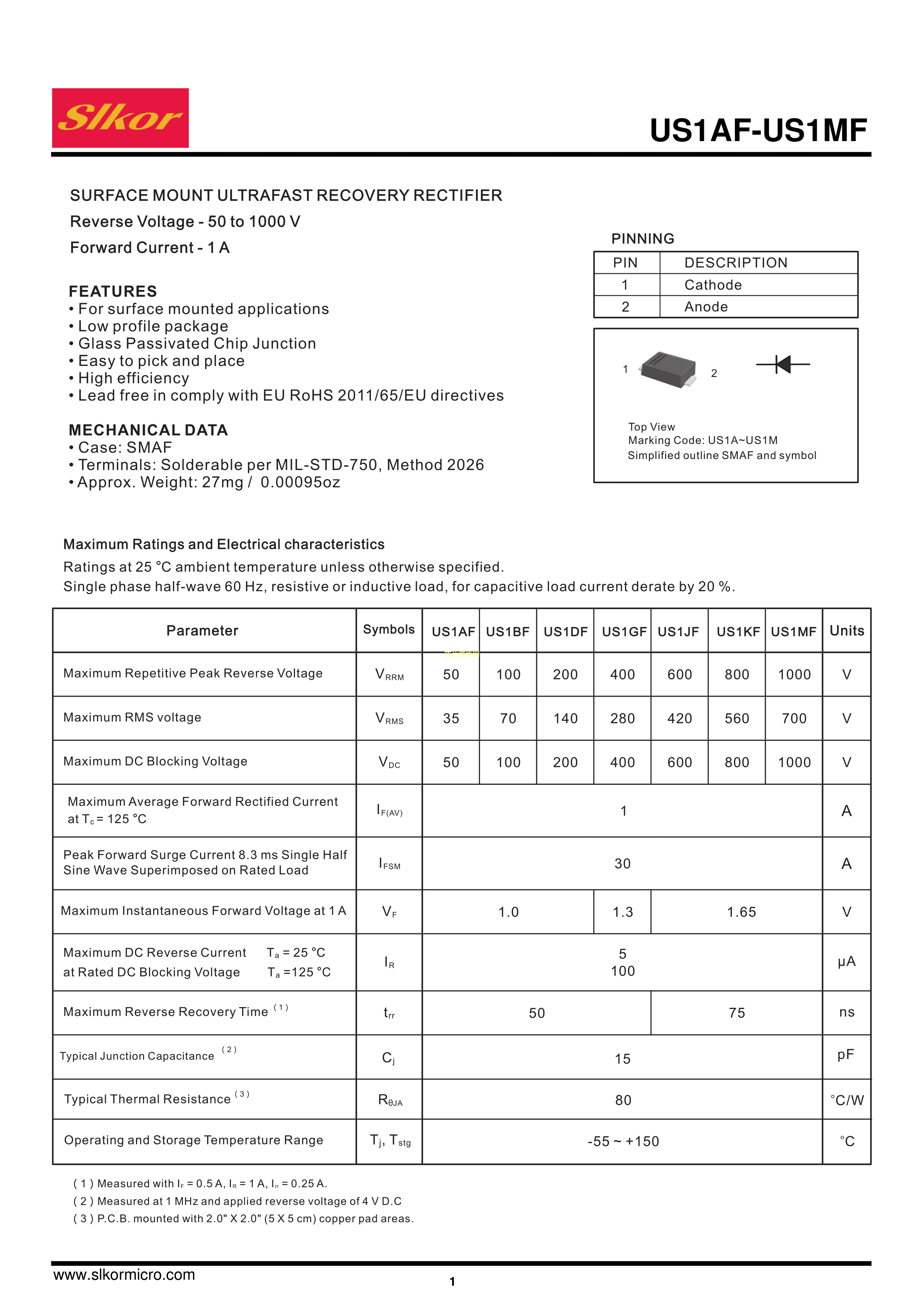 US1GF数据手册SMAF封装Slkor(萨科微)PDF规格书,中英文下载