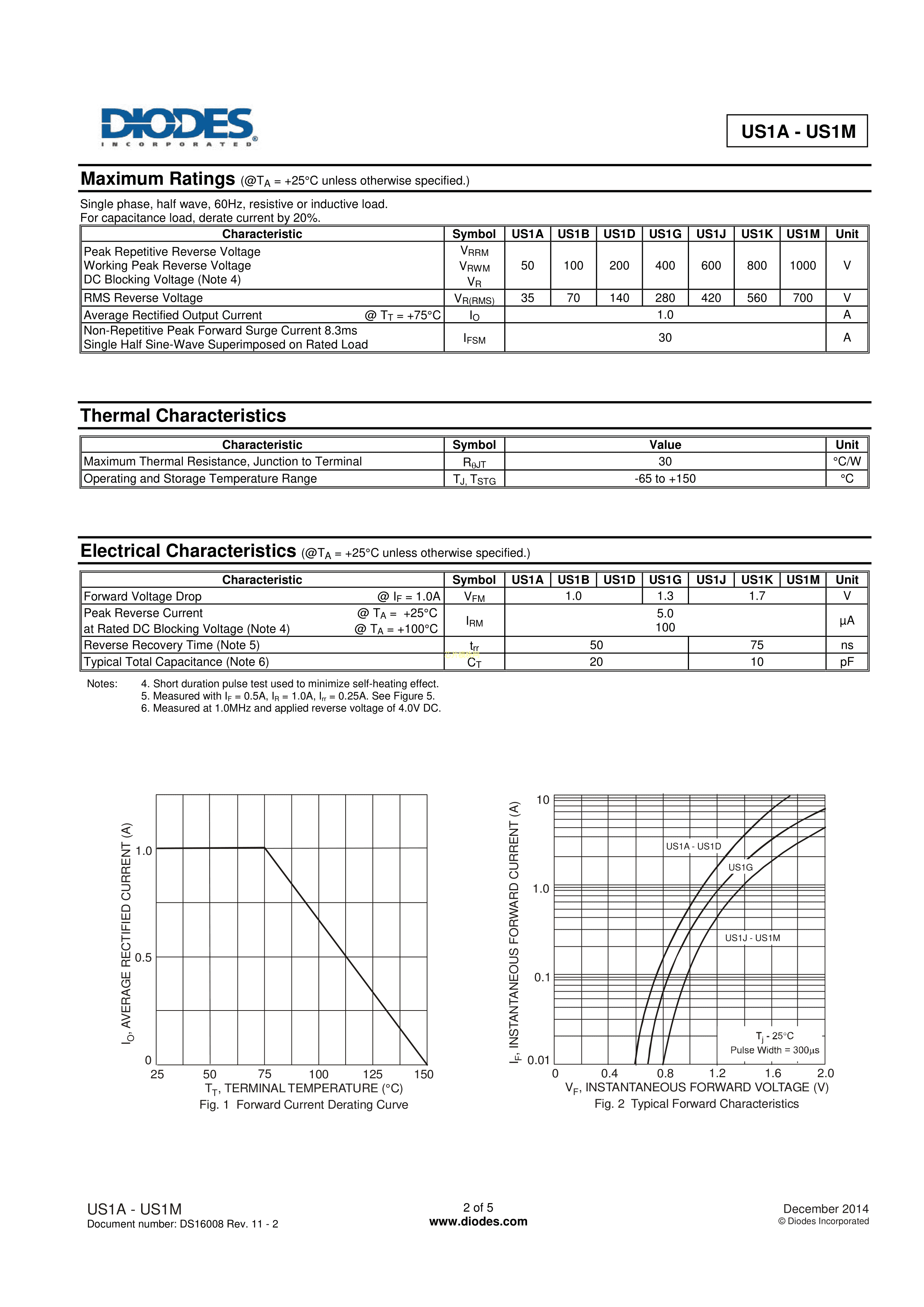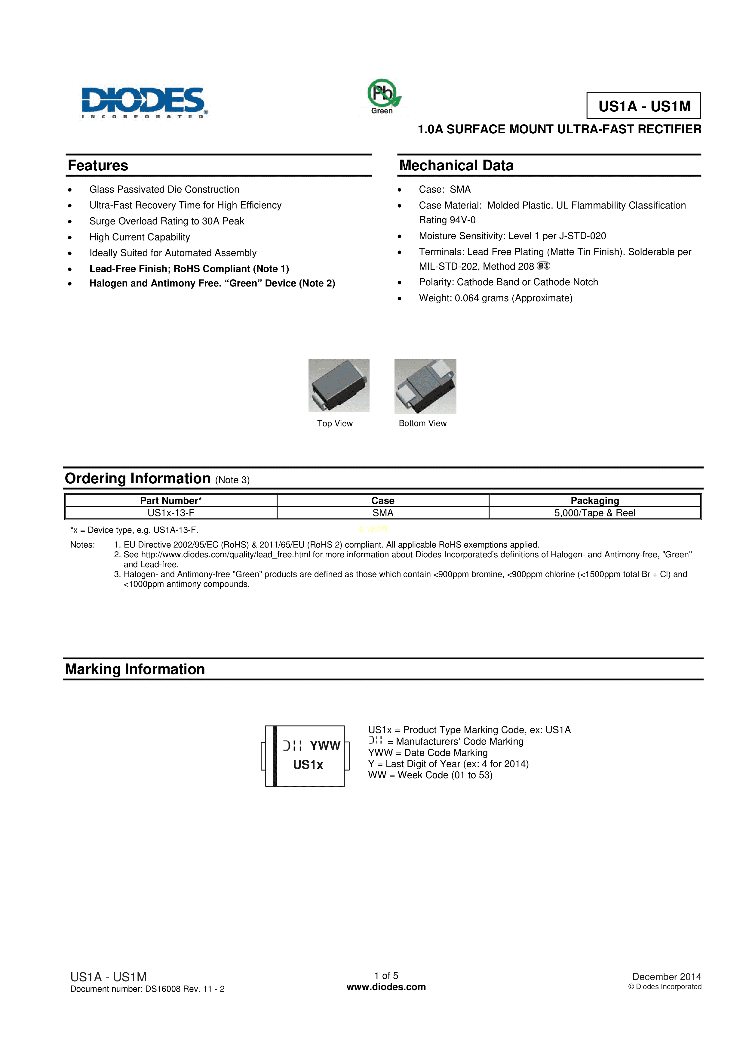 US1J-13-F数据手册SMA封装DIODES(美台)PDF规格书,中英文下载