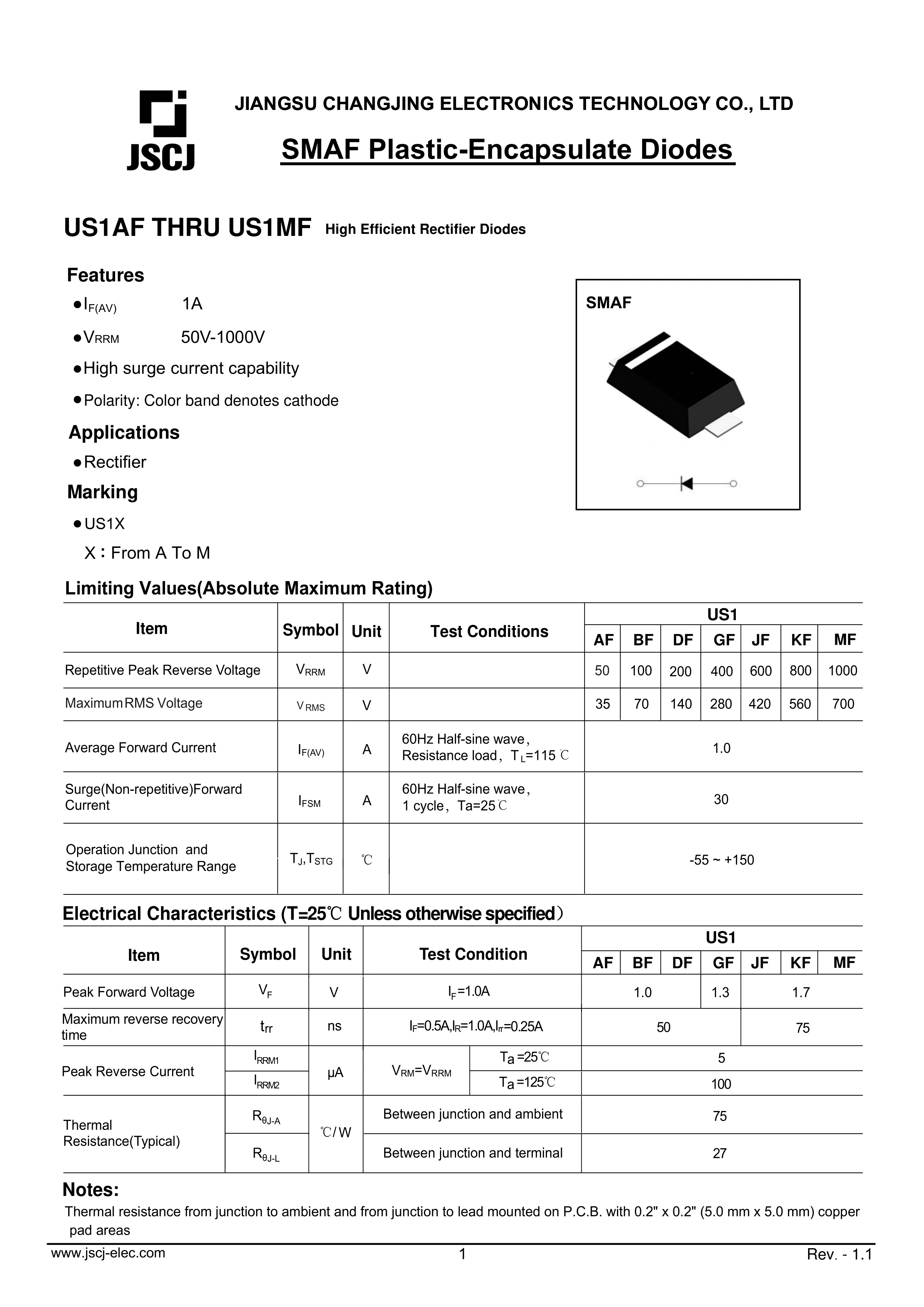 US1JF数据手册SMAF封装CJ(江苏长电-长晶)PDF规格书,中英文下载
