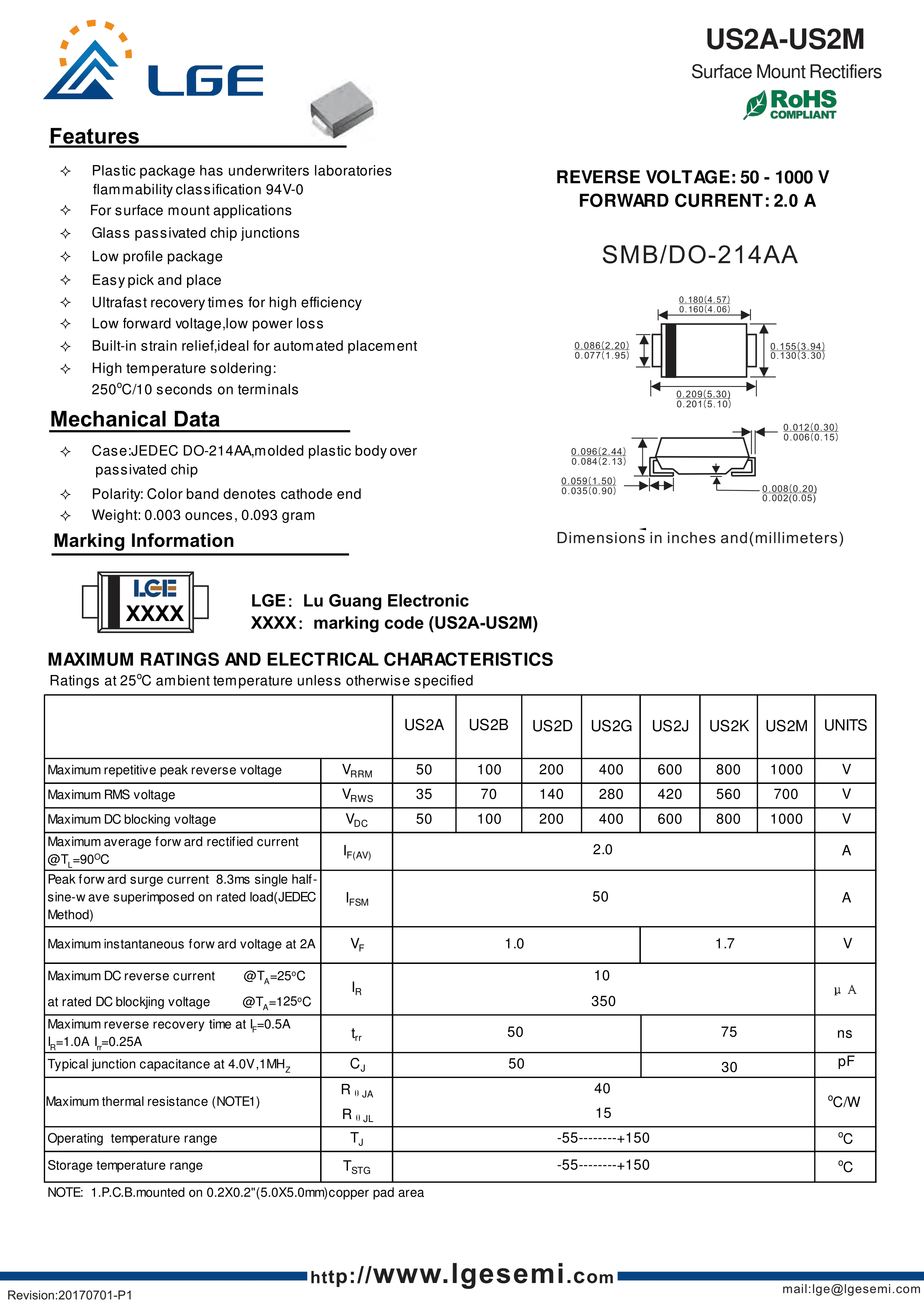 US2M数据手册SMB封装LGE(鲁光)PDF规格书,中英文下载