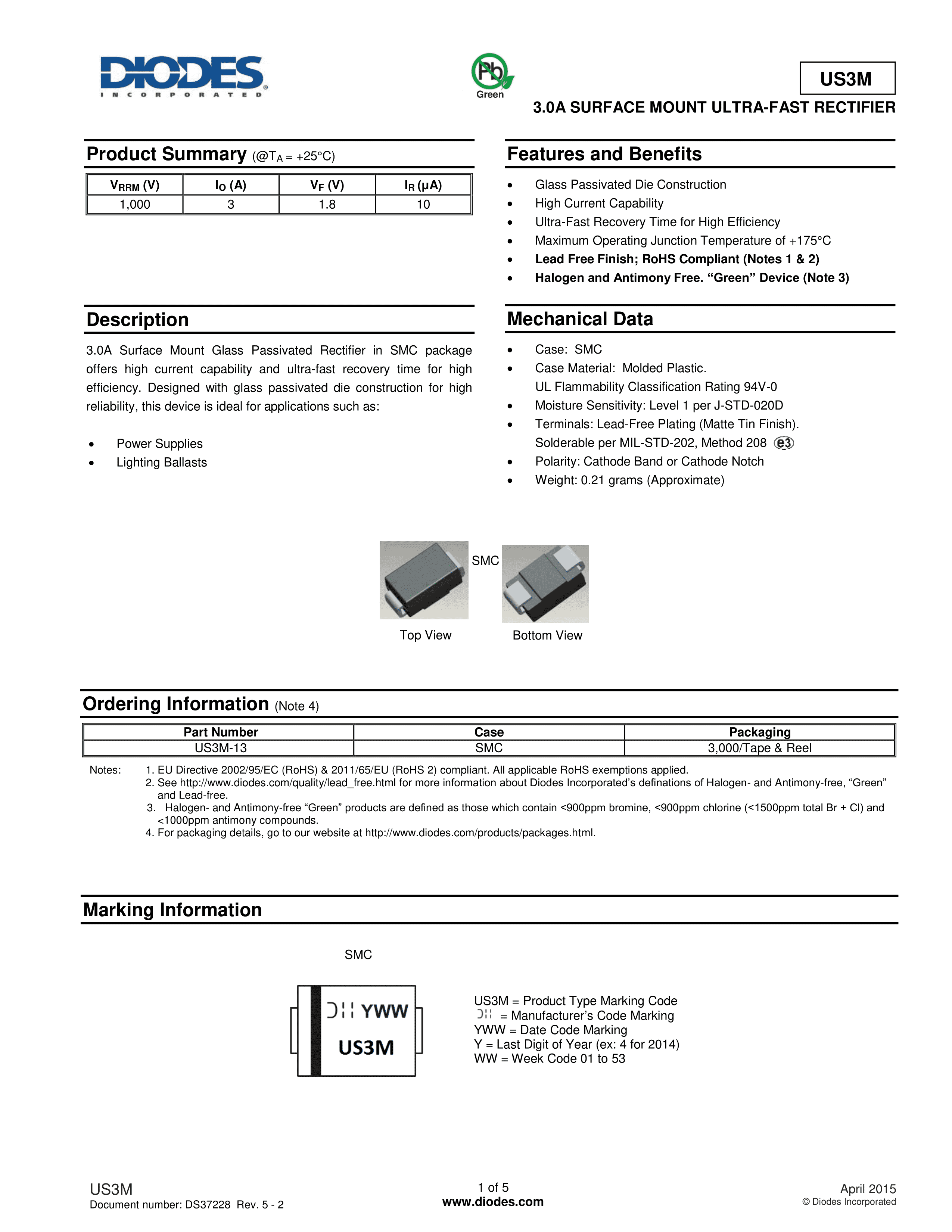 US3M-13数据手册SMC封装DIODES(美台)PDF规格书,中英文下载