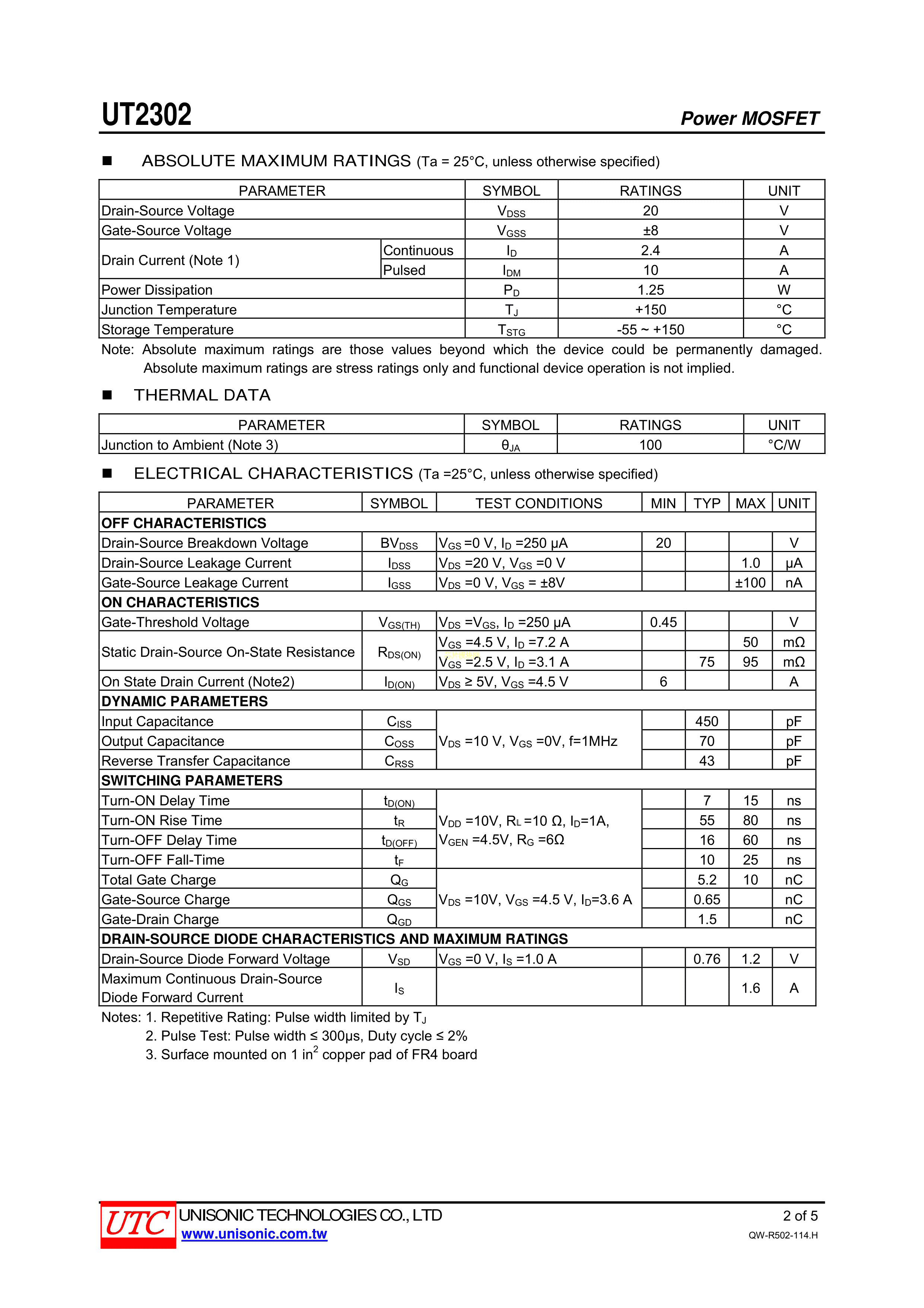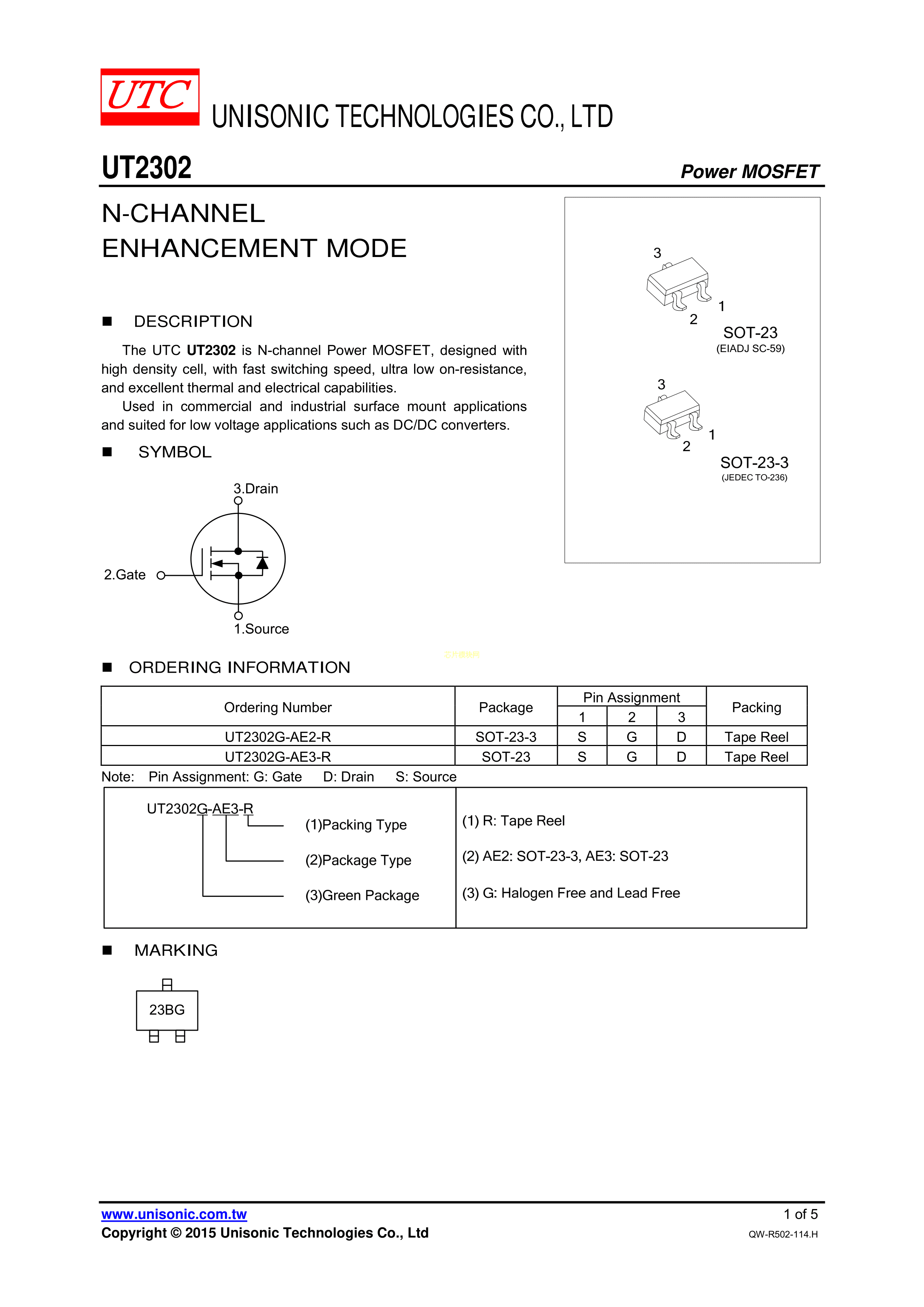 UT2302G-AE2-R数据手册SOT-23-3封装UTC(友顺)PDF规格书,中英文下载