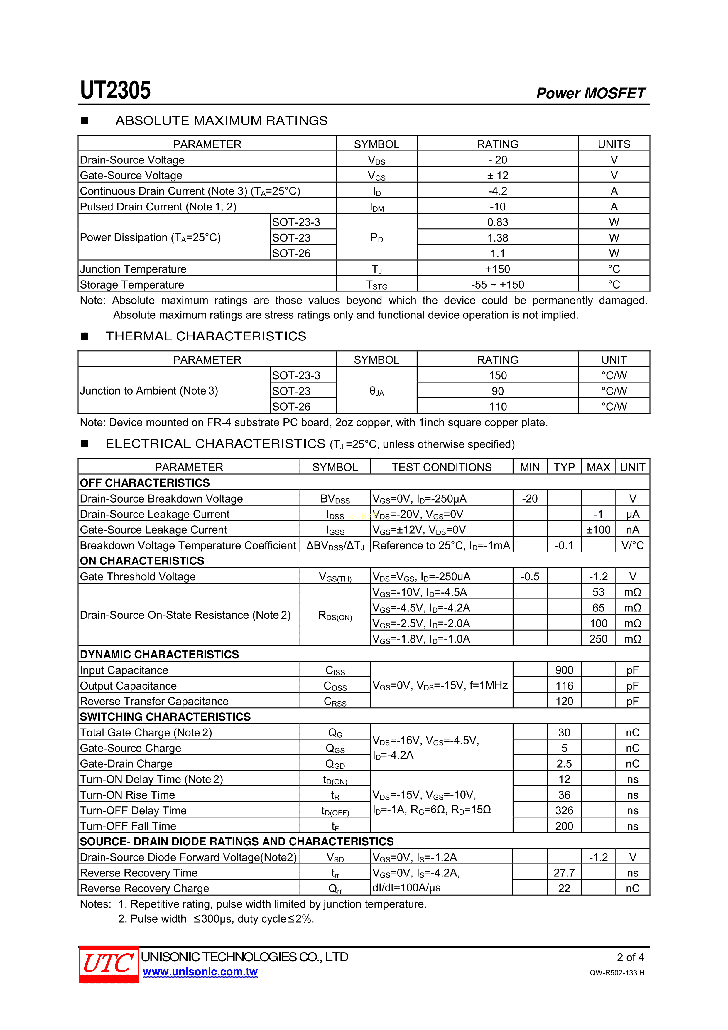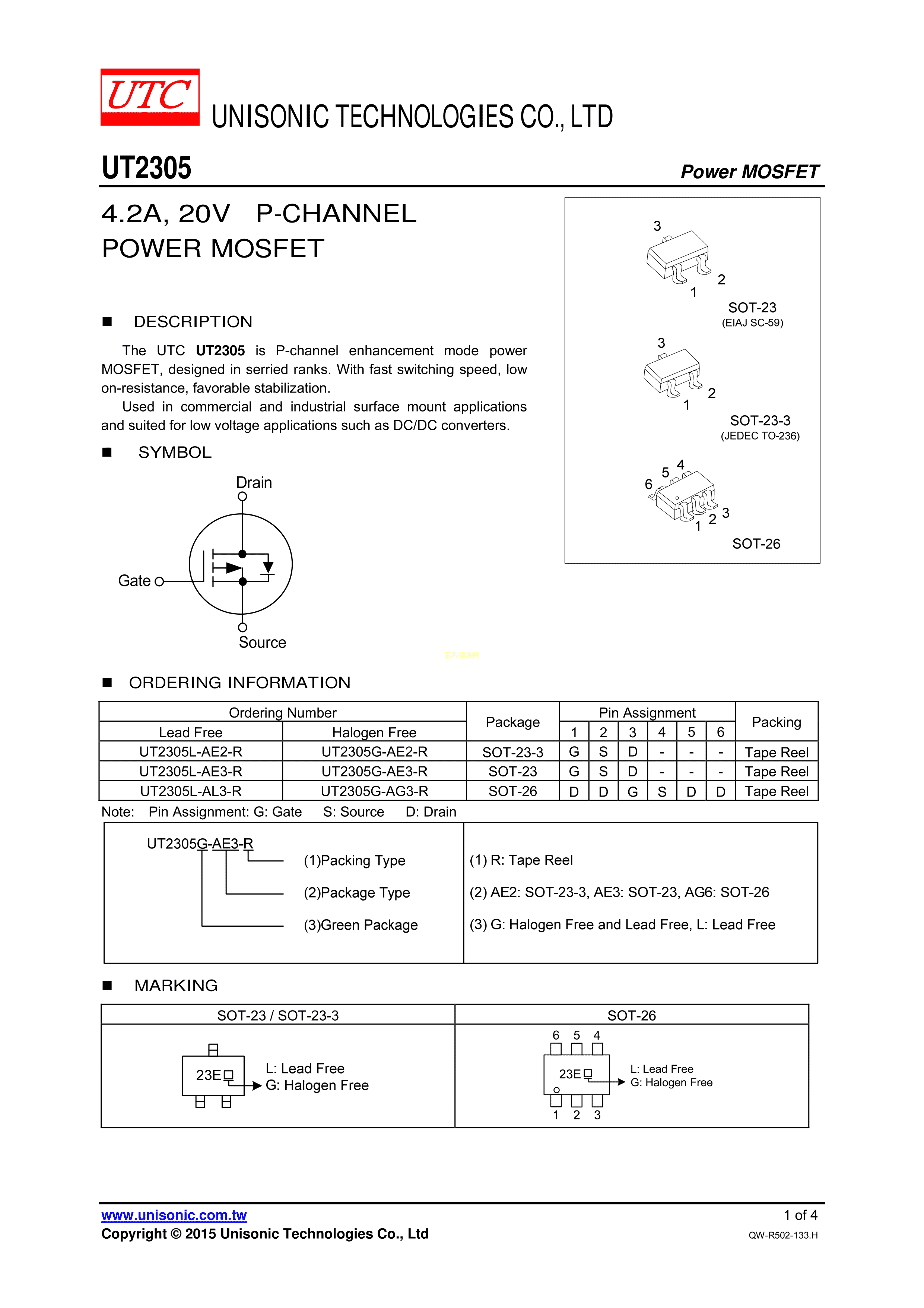 UT2305G-AE2-R数据手册SOT-23-3封装UTC(友顺)PDF规格书,中英文下载