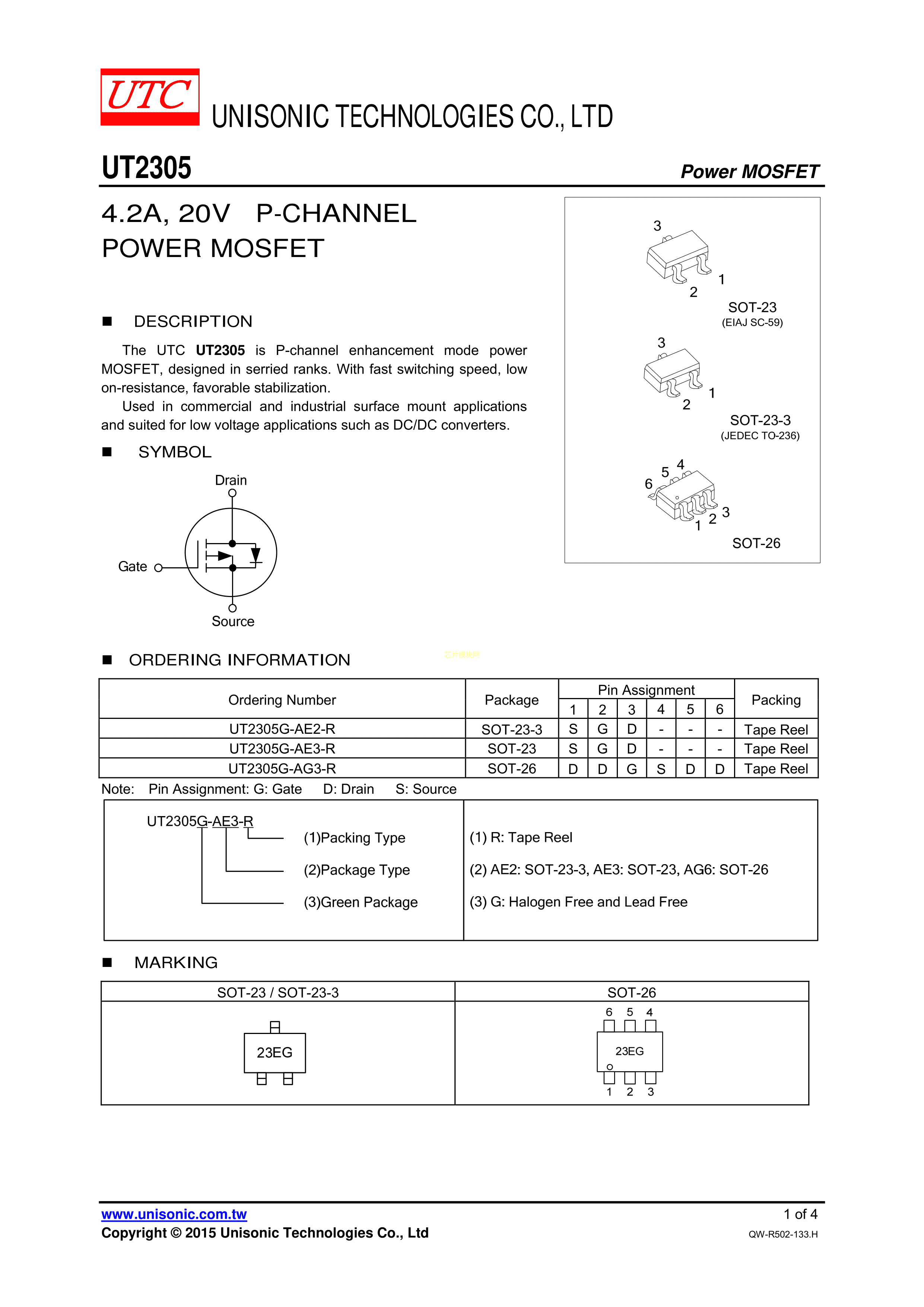 UT2305G-AE3-R数据手册SOT-23-3L封装UTC(友顺)PDF规格书,中英文下载