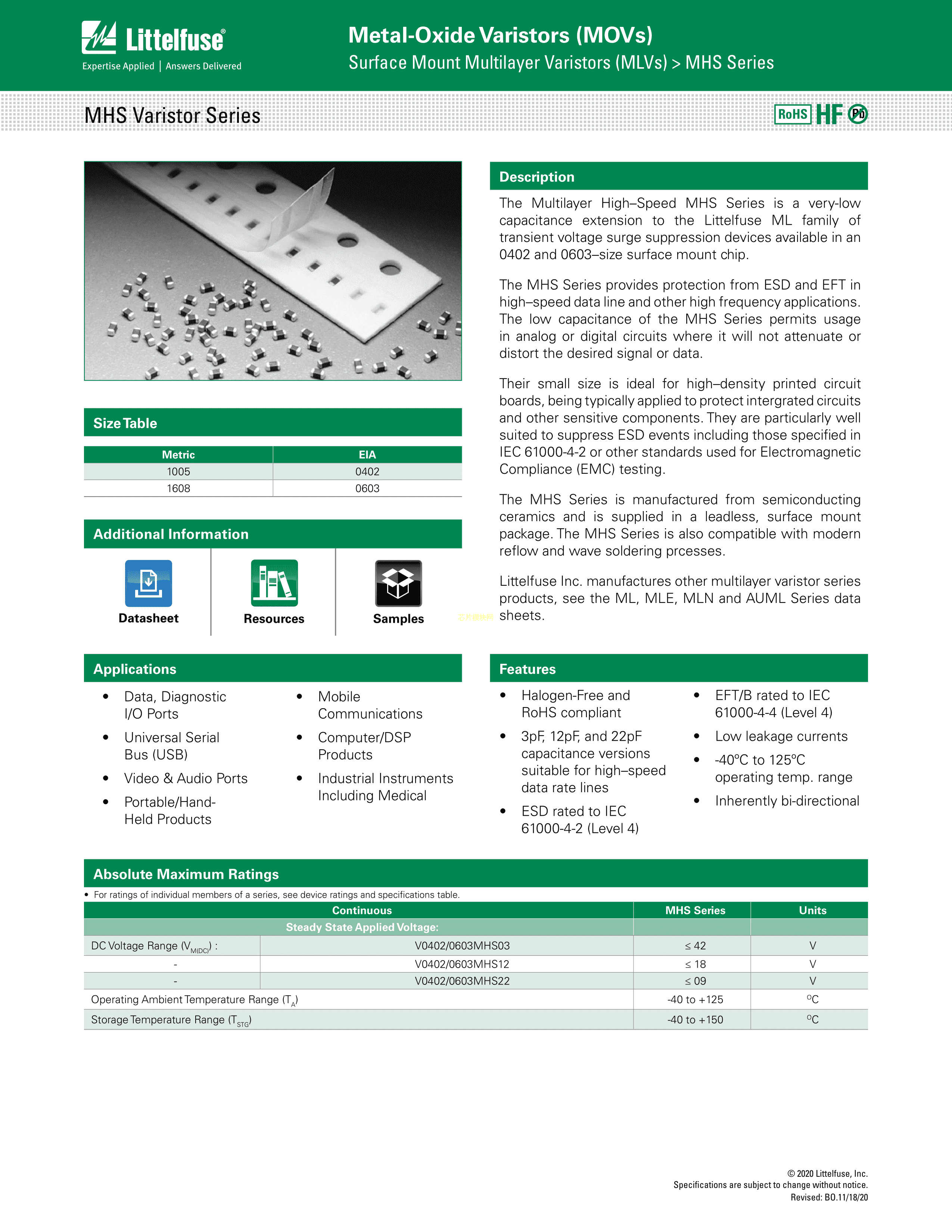V0603MHS03T数据手册0603封装Littelfuse(美国力特)PDF规格书,中英文下载