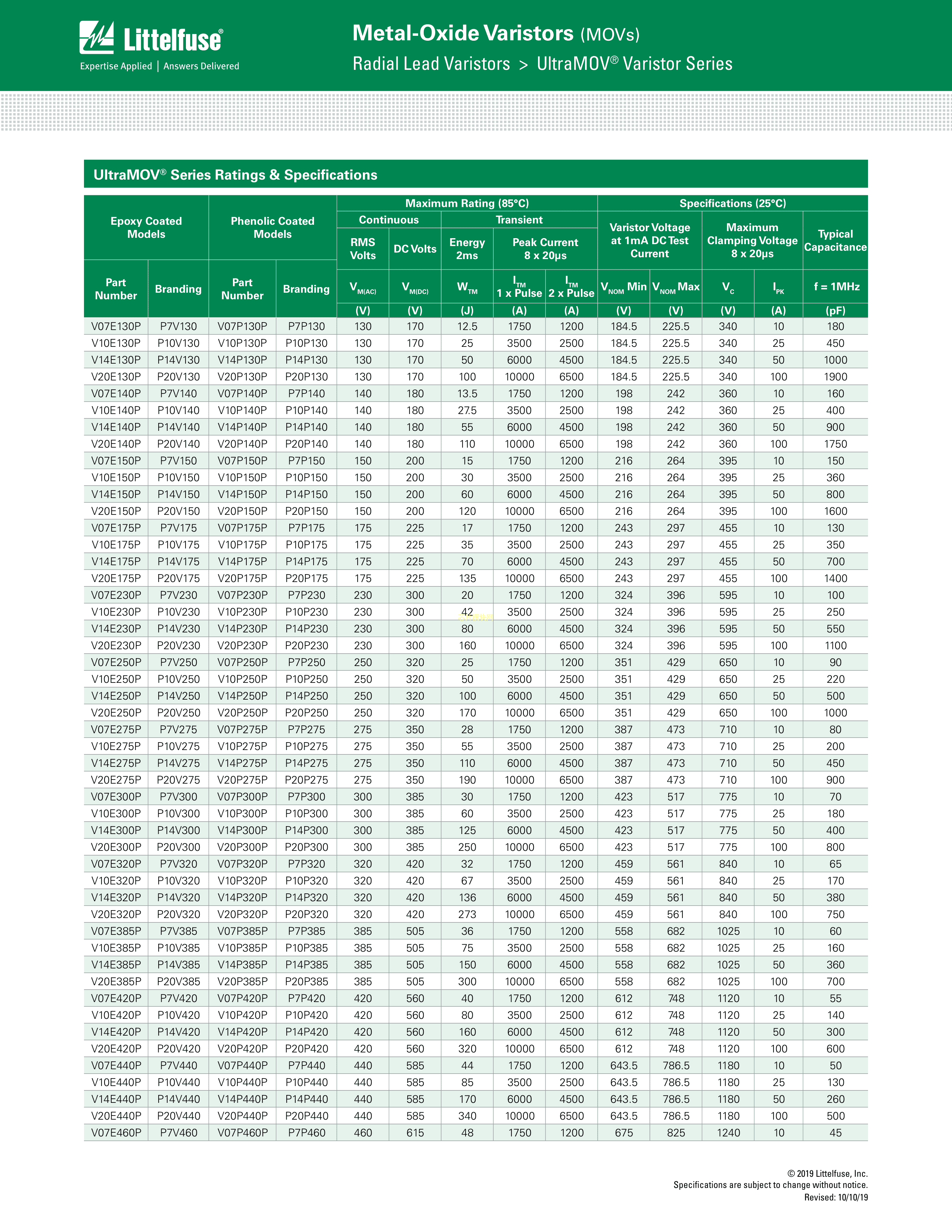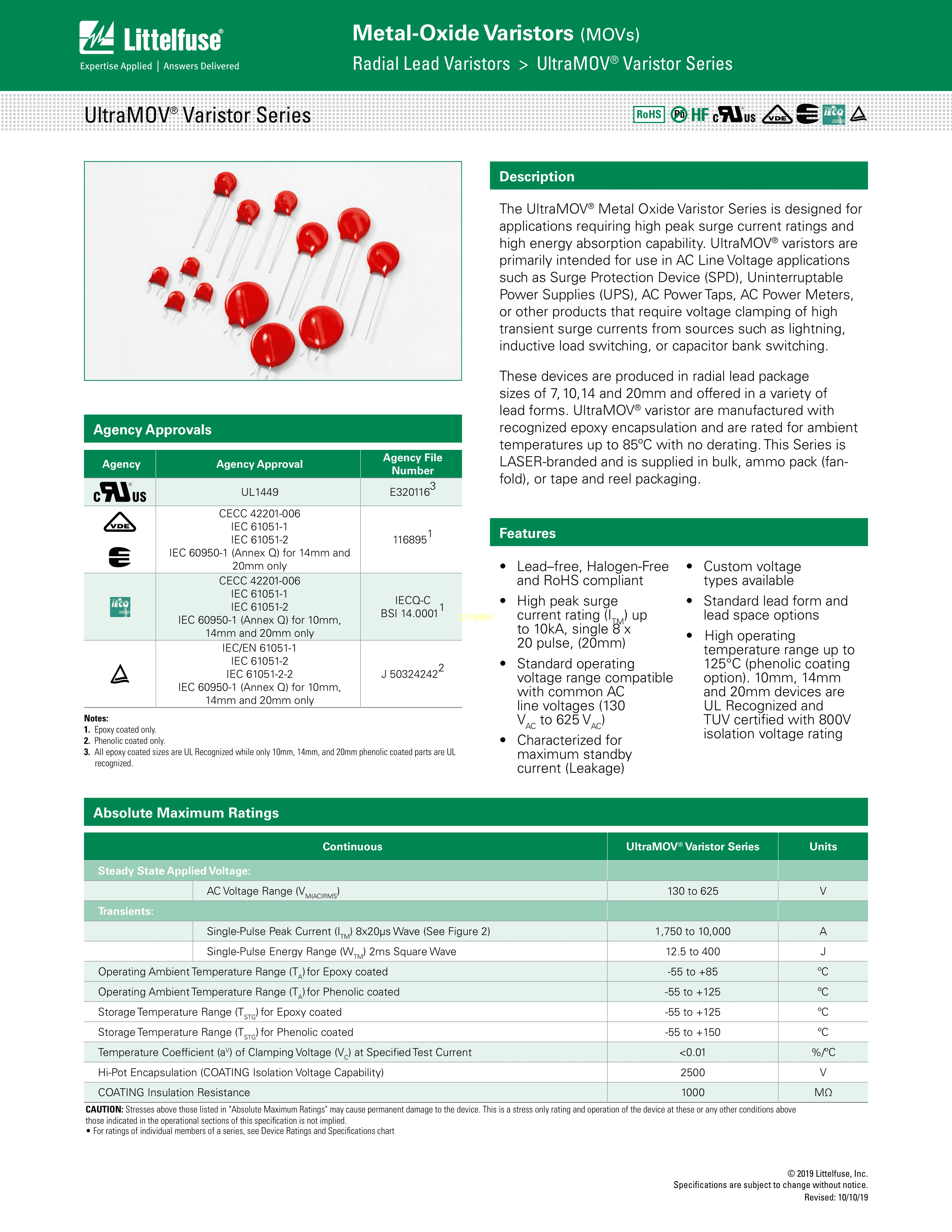 V07P460PL1T5数据手册径向引线封装Littelfuse(美国力特)PDF规格书,中英文下载