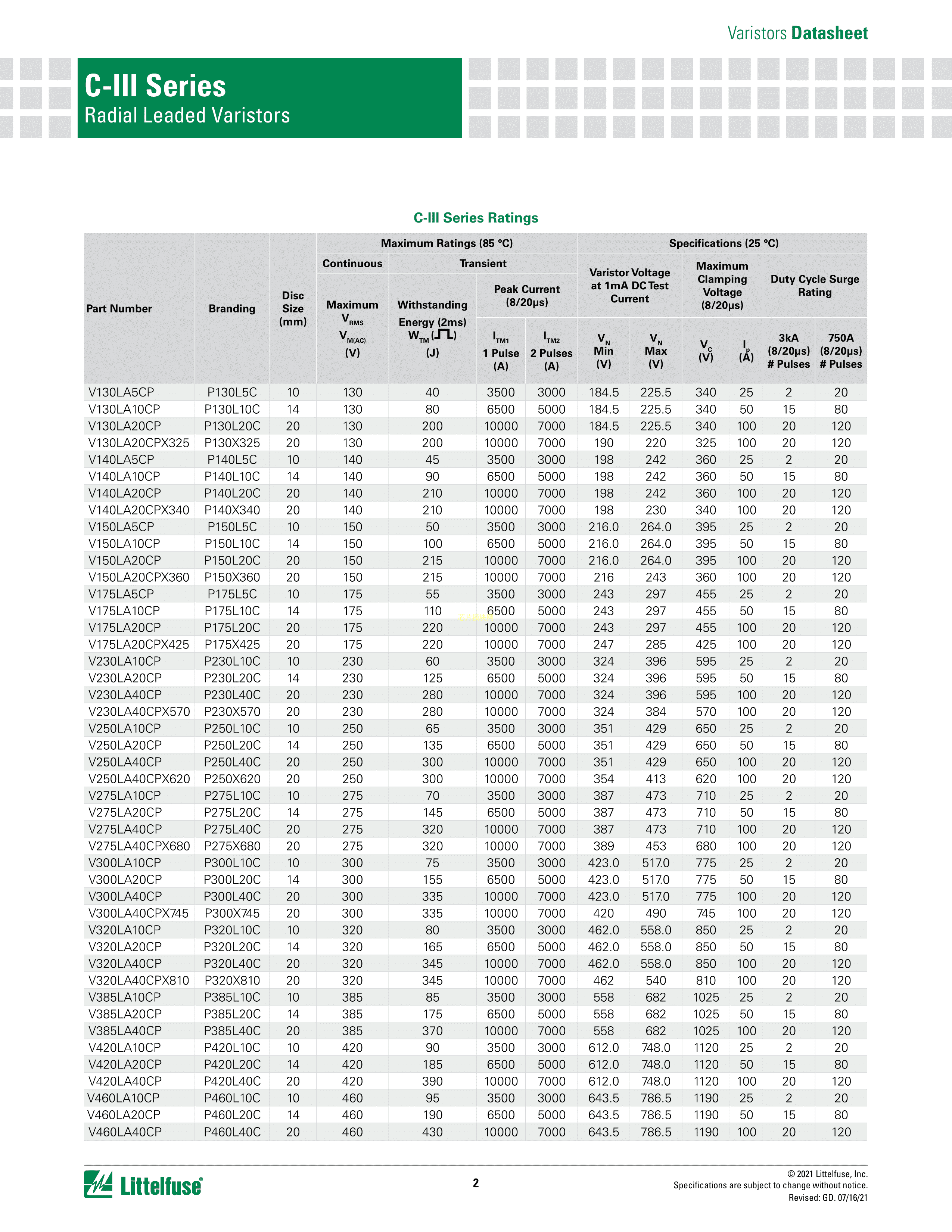 V140LU10CP数据手册径向引线封装Littelfuse(美国力特)PDF规格书,中英文下载