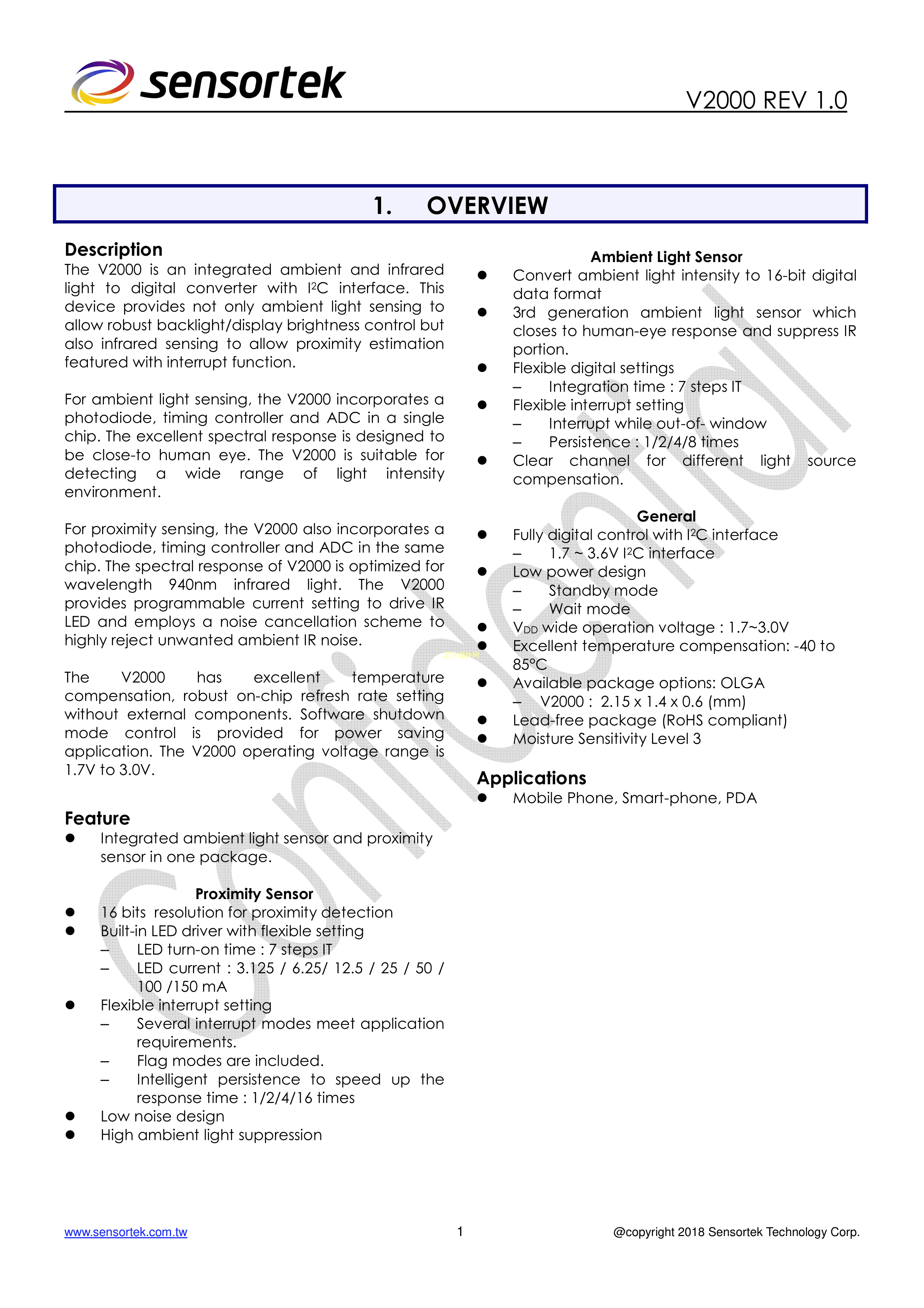 V2000数据手册OLGA-6封装SENSORTEK(昇佳)PDF规格书,中英文下载