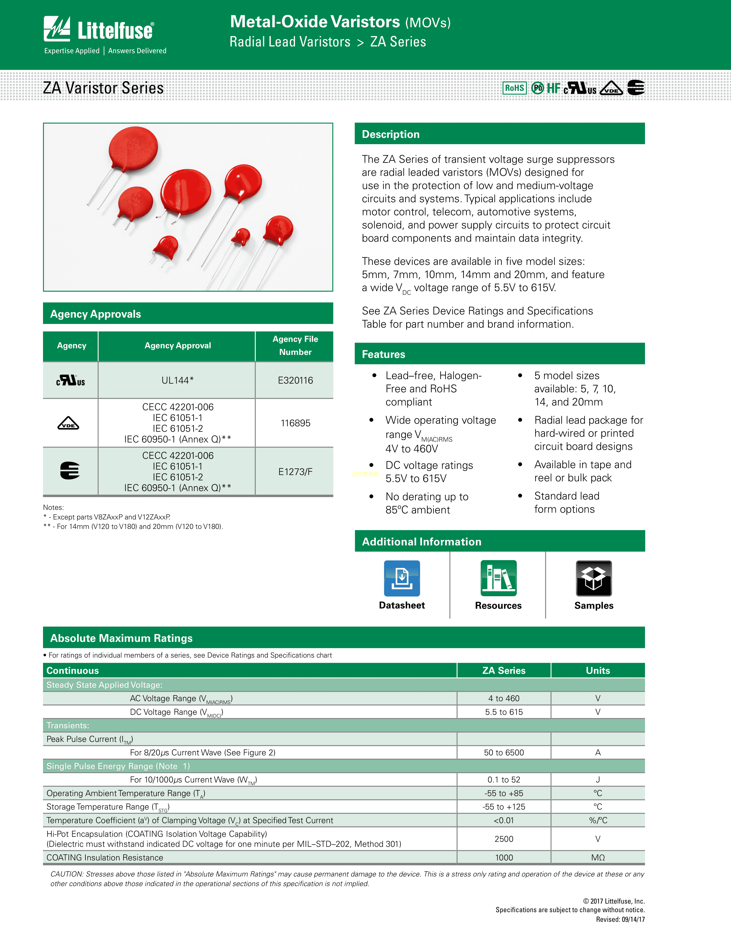 V36ZA80P数据手册径向引线封装Littelfuse(美国力特)PDF规格书,中英文下载