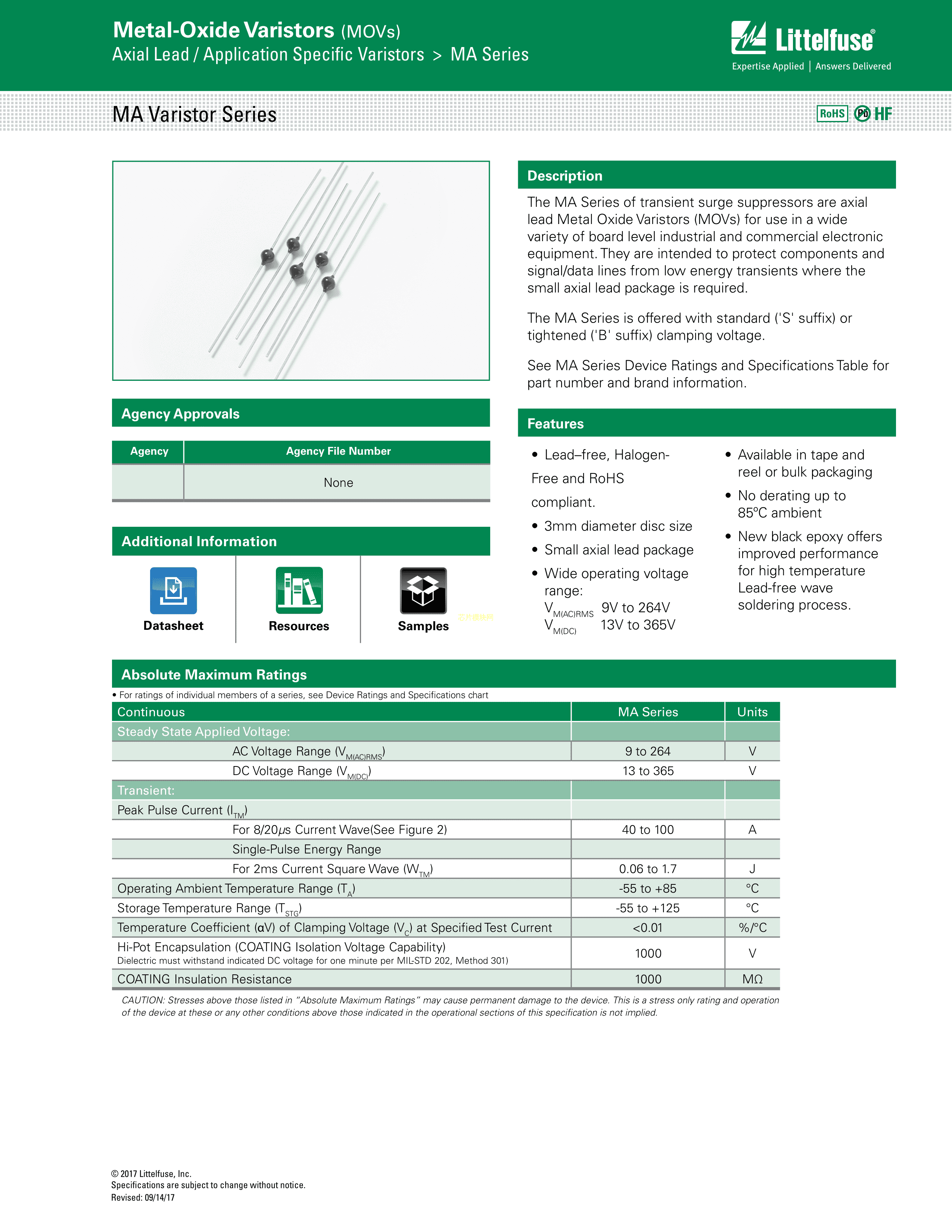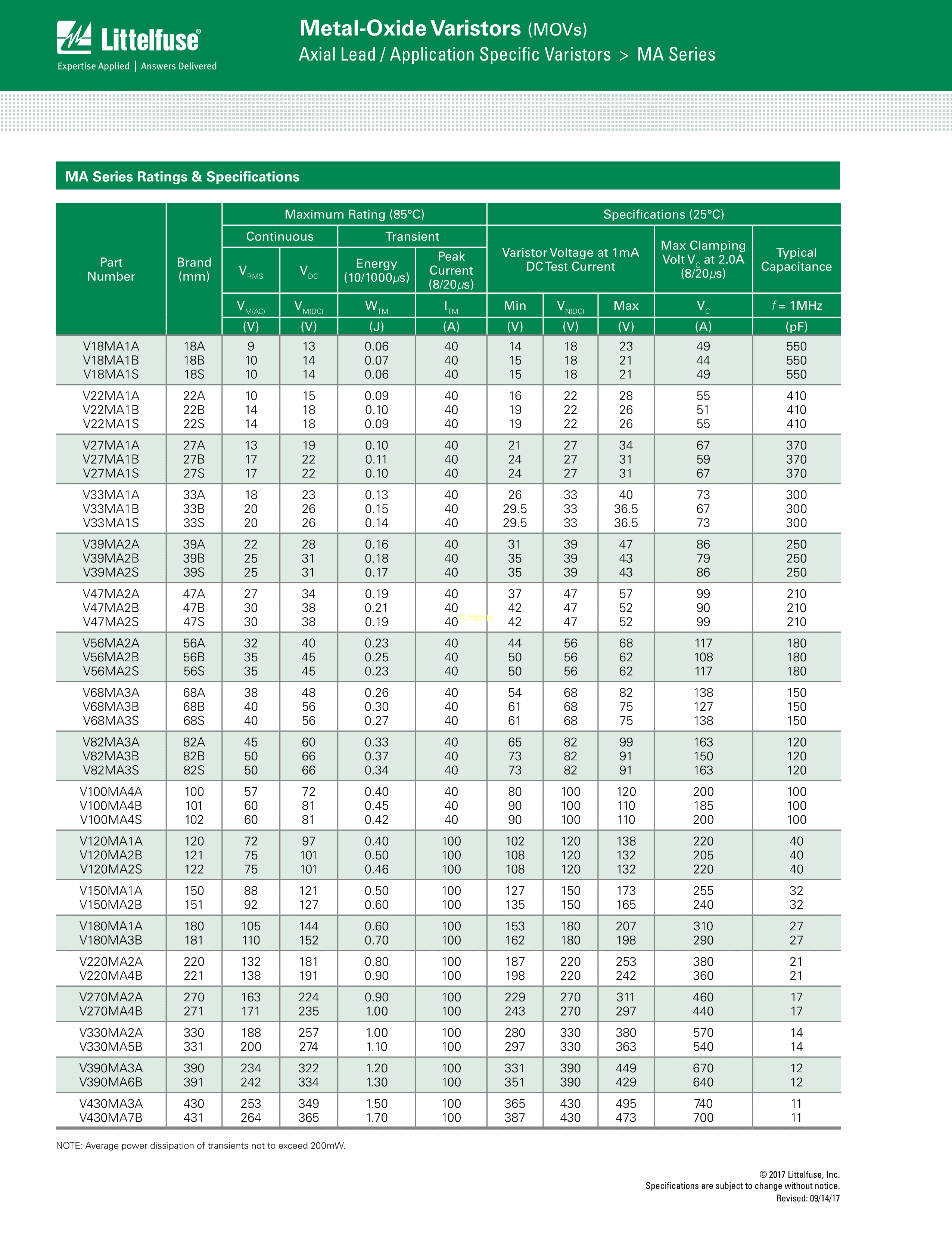V39MA2A数据手册轴向引线封装Littelfuse(美国力特)PDF规格书,中英文下载