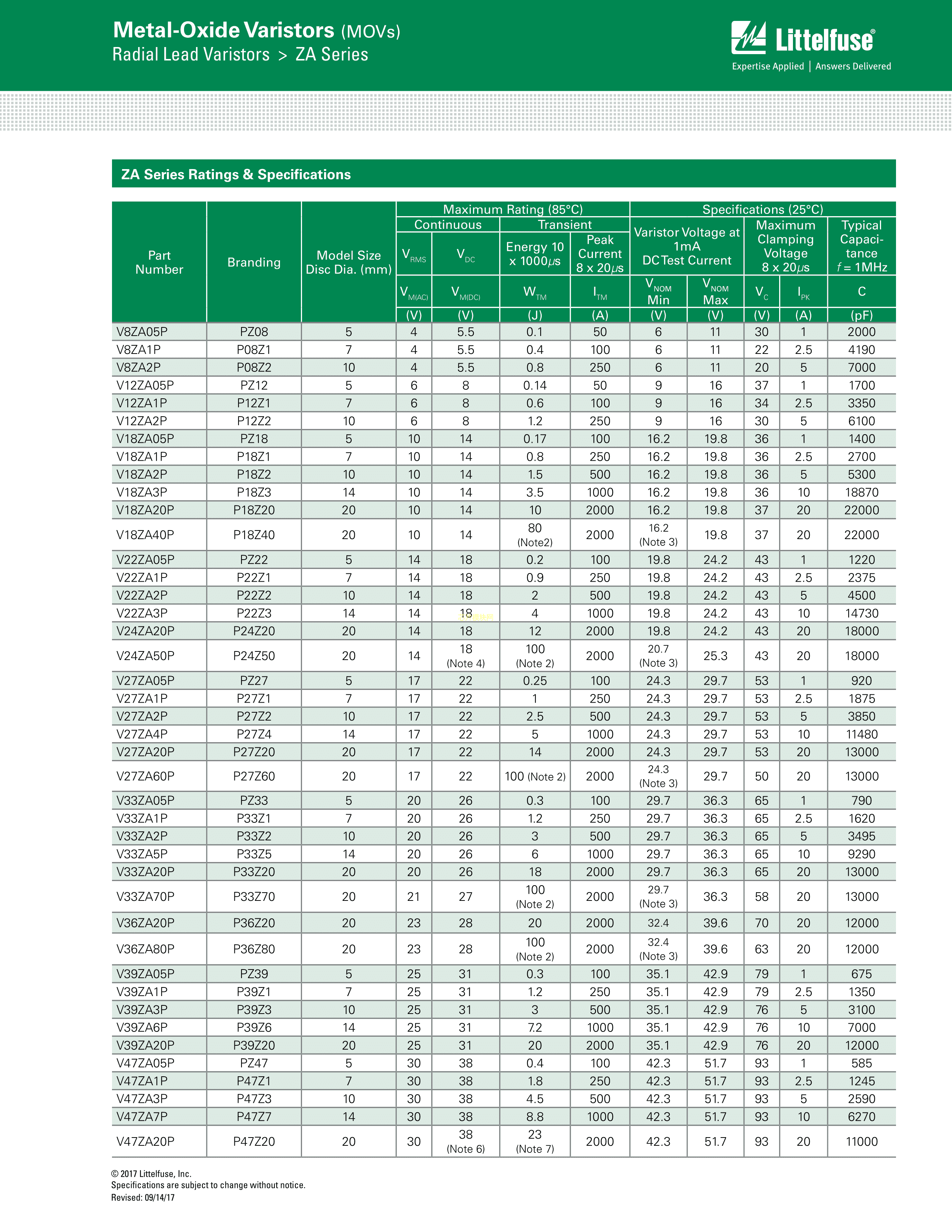 V39ZA05P数据手册径向引线封装Littelfuse(美国力特)PDF规格书,中英文下载