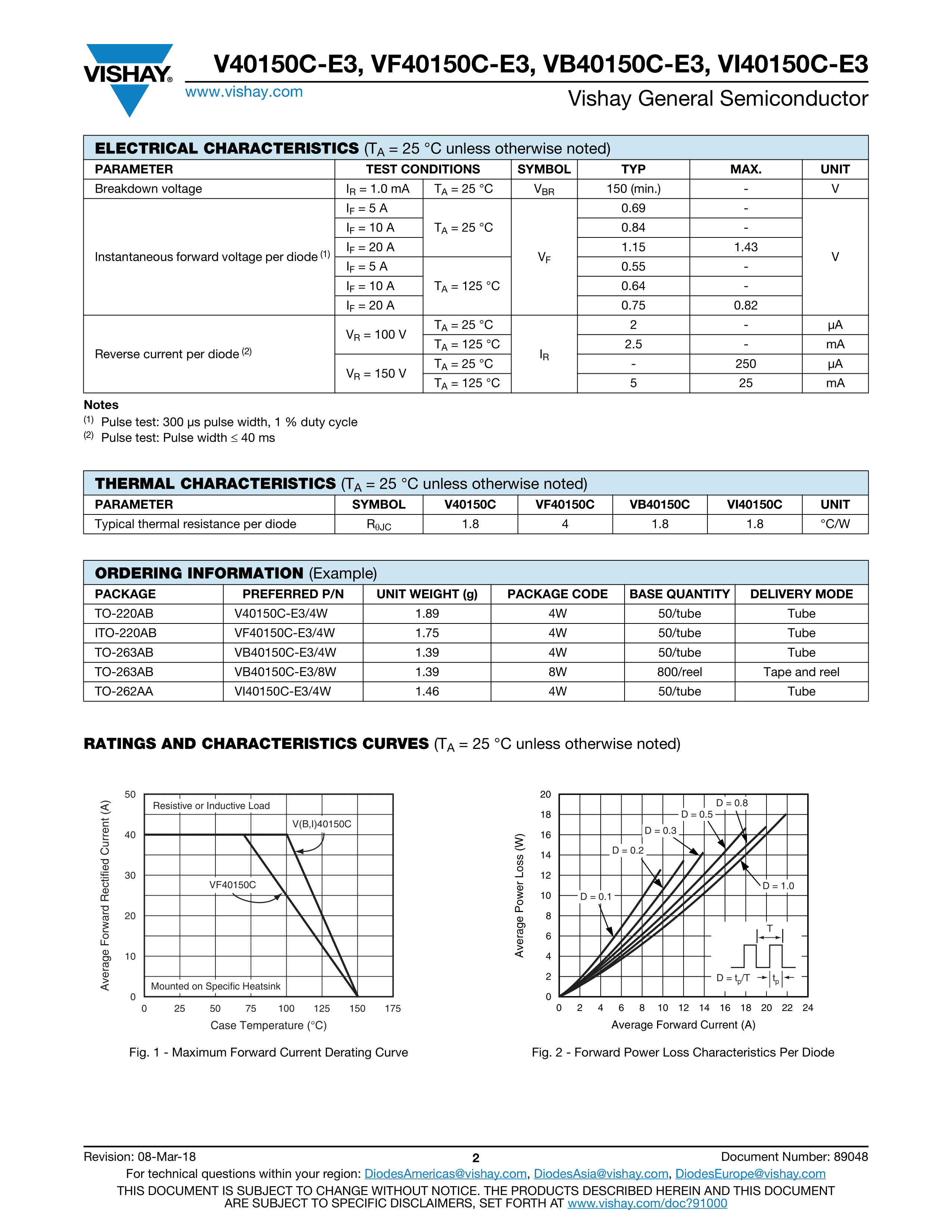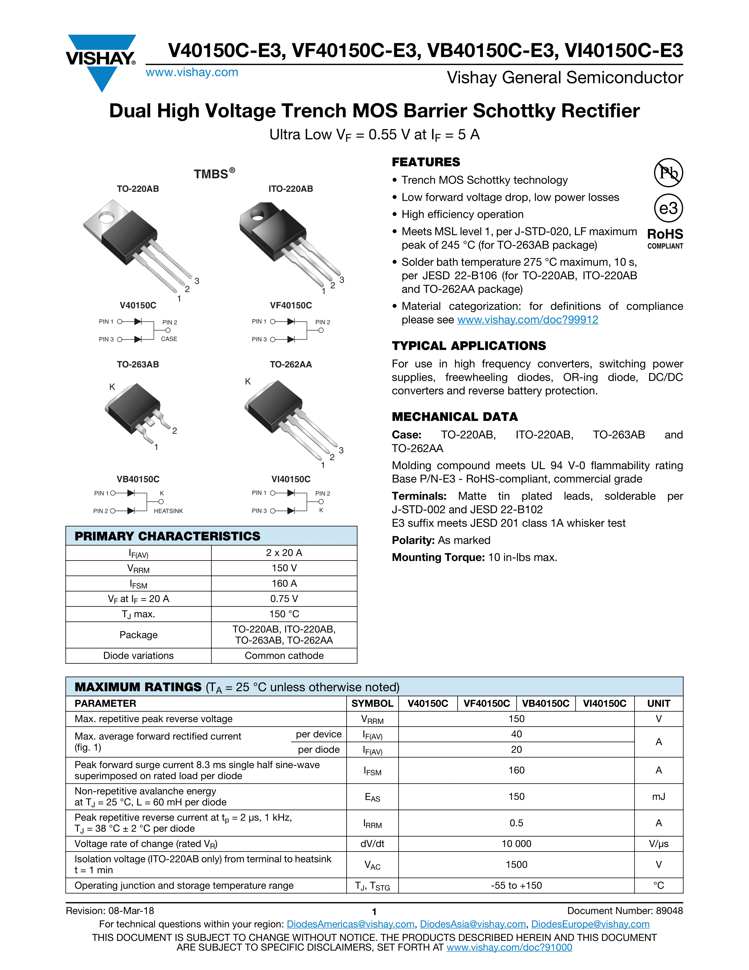 V40150C-E3-4W数据手册TO-220AB封装VISHAY(威世)PDF规格书,中英文下载