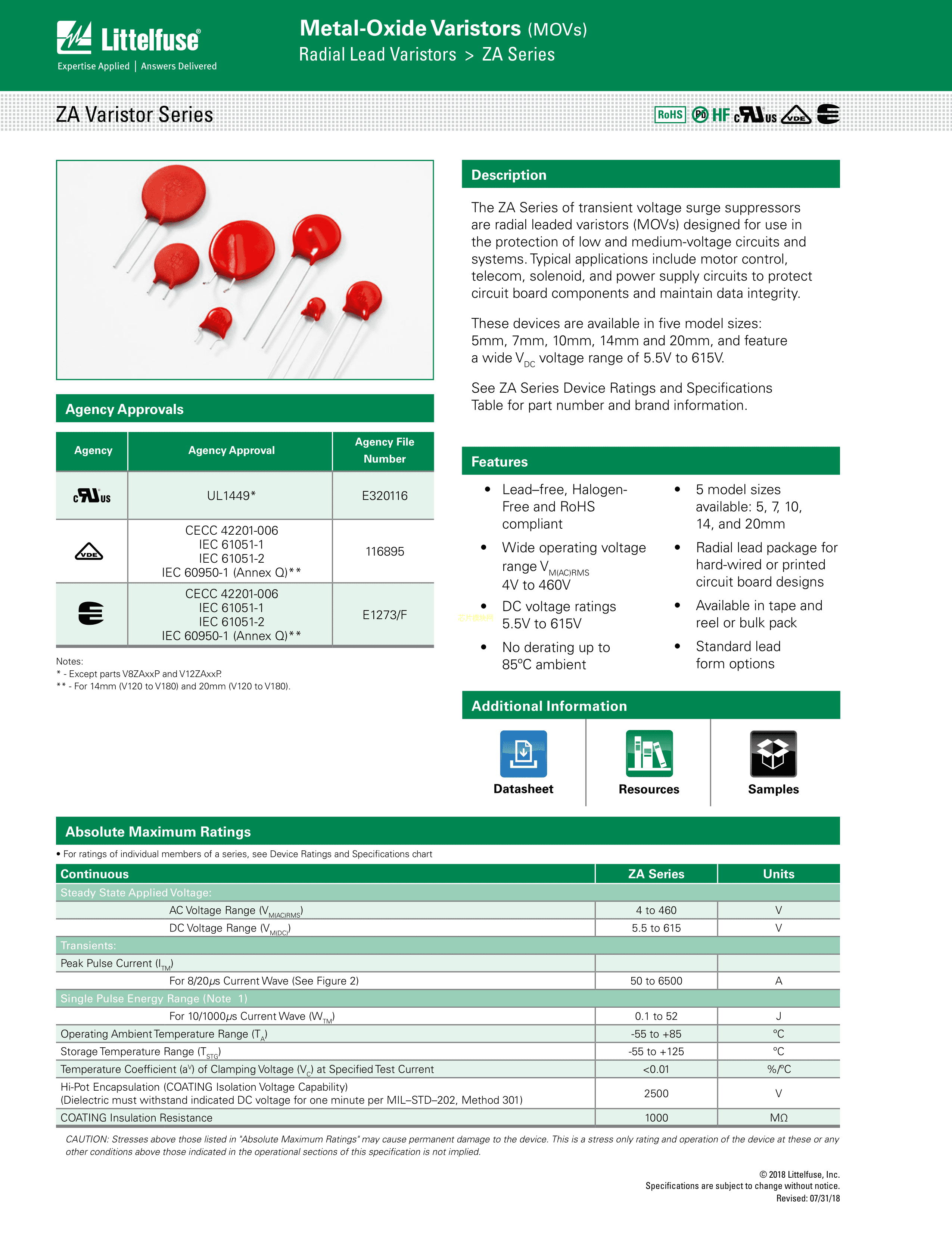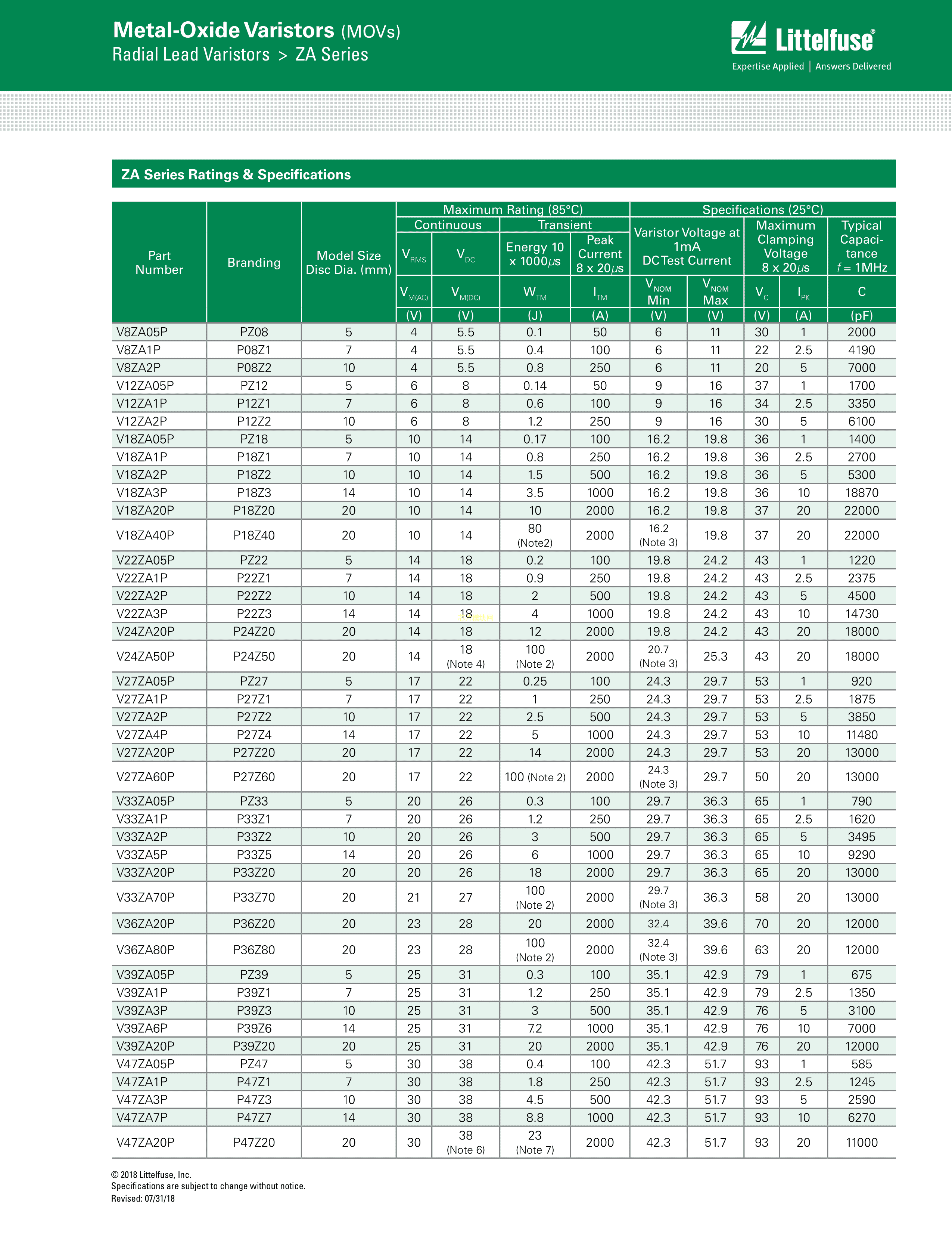 V8ZA1P数据手册径向引线封装Littelfuse(美国力特)PDF规格书,中英文下载