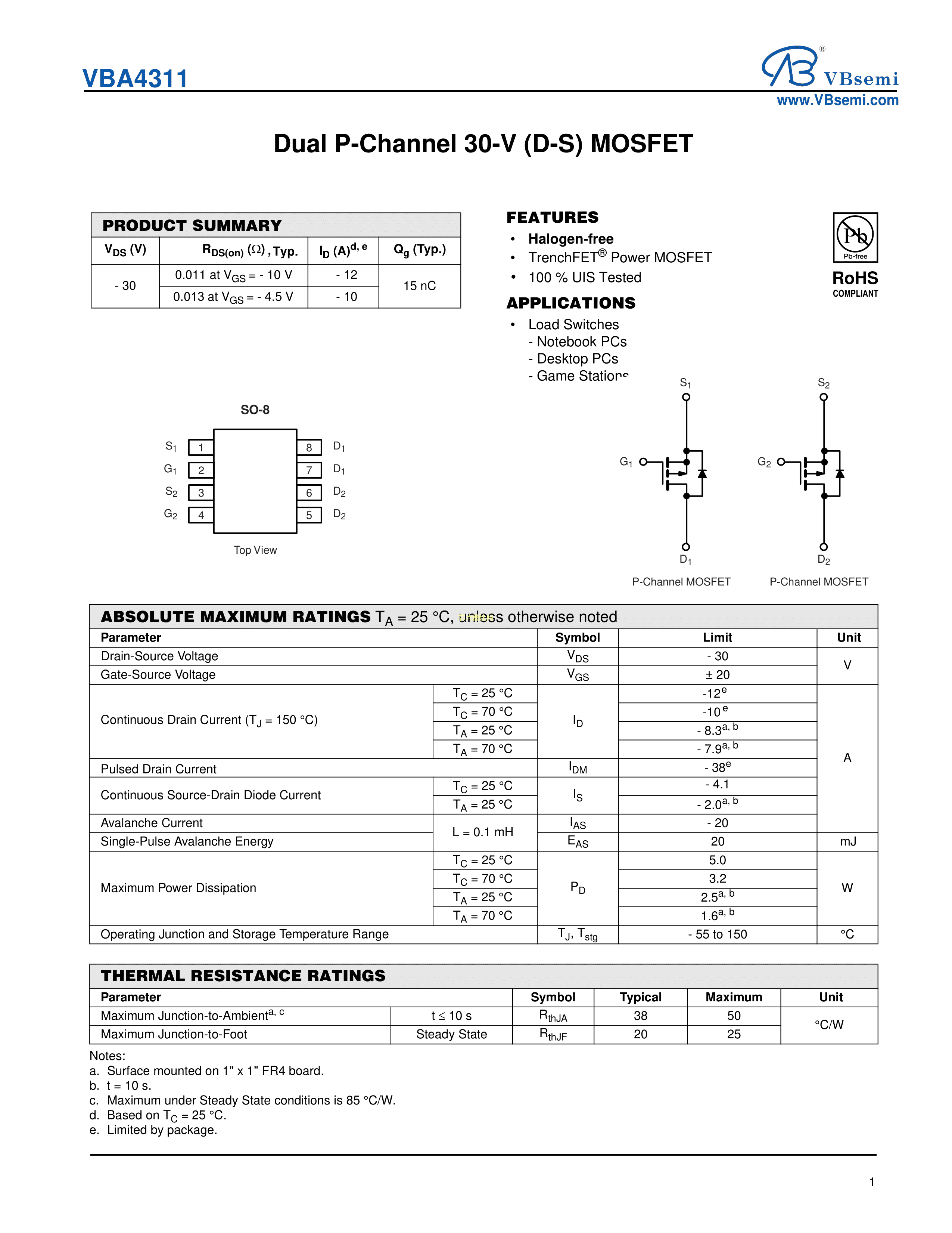VBA4311数据手册SO-8封装VBsemi(台湾微碧)PDF规格书,中英文下载