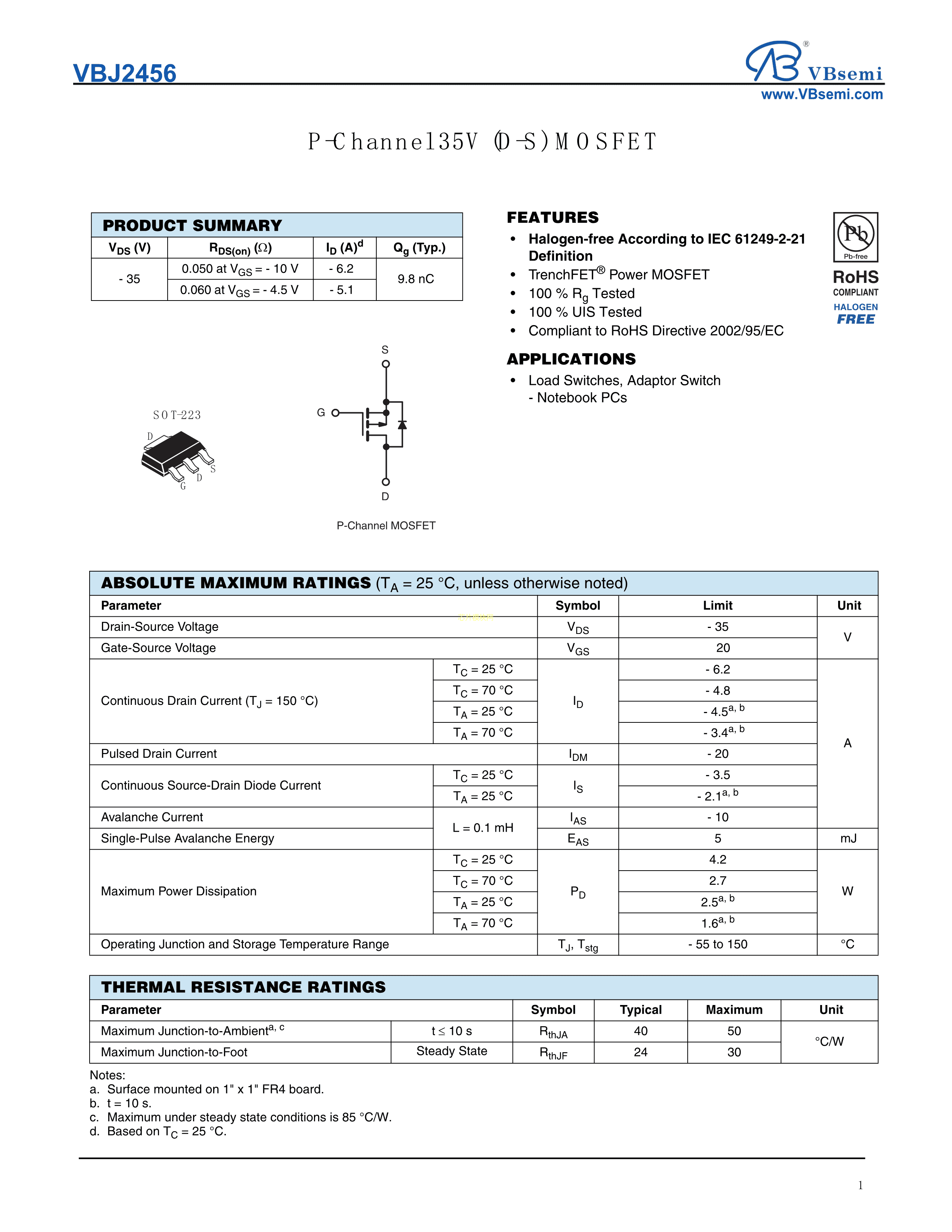 VBJ2456数据手册SOT-223封装VBsemi(台湾微碧)PDF规格书,中英文下载