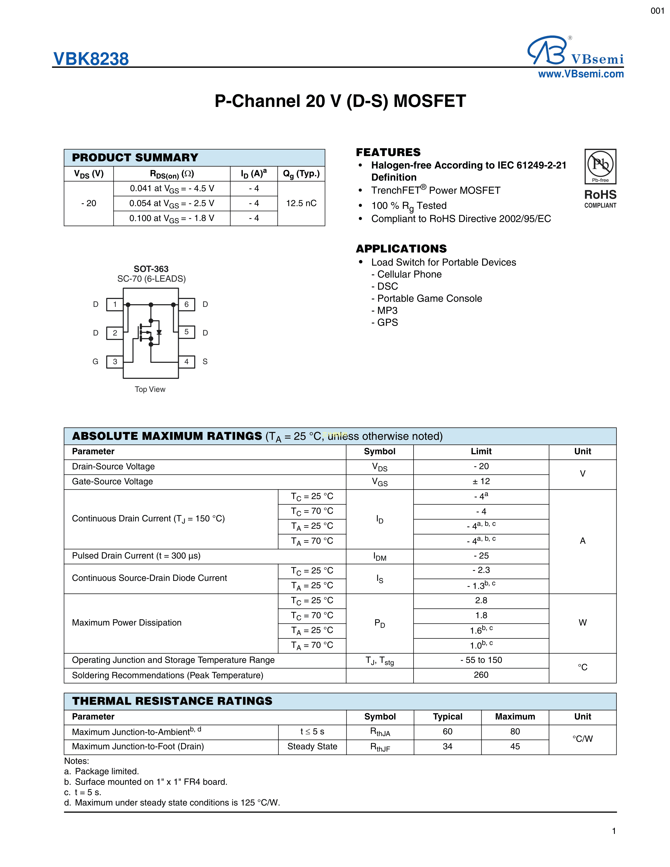 VBK8238数据手册SC-70-6封装VBsemi(台湾微碧)PDF规格书,中英文下载