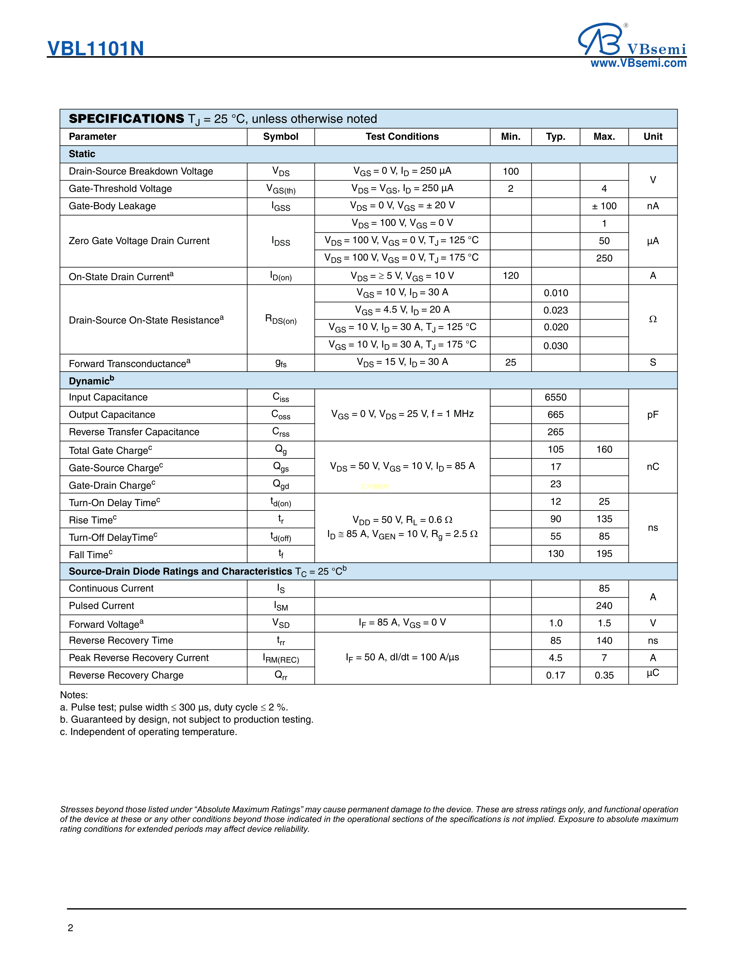 VBL1101N数据手册TO-263封装VBsemi(台湾微碧)PDF规格书,中英文下载