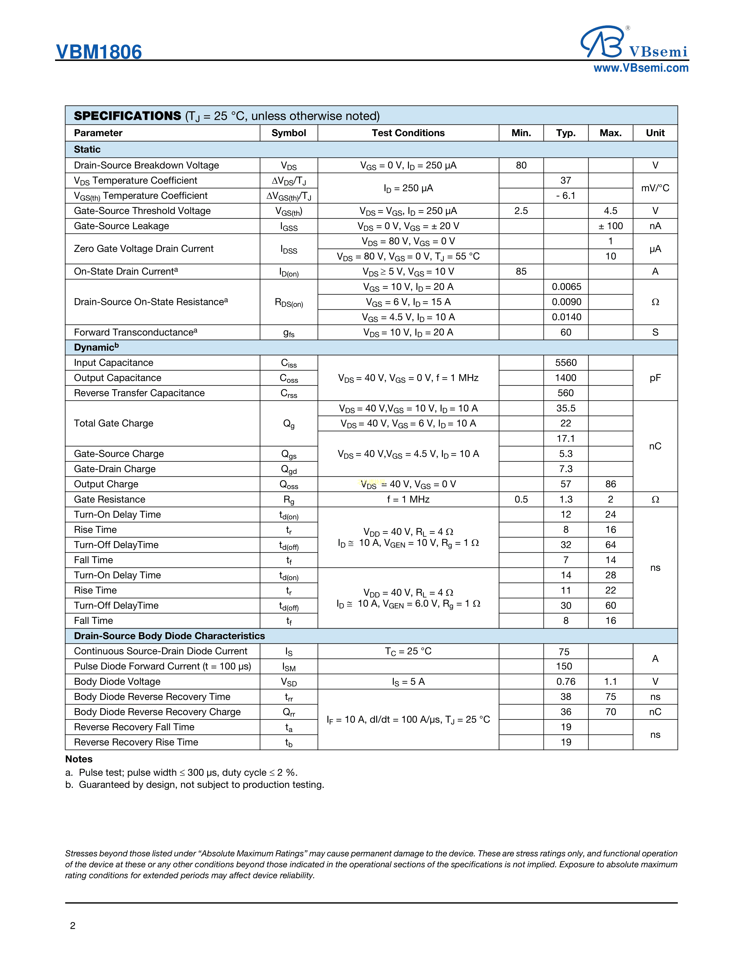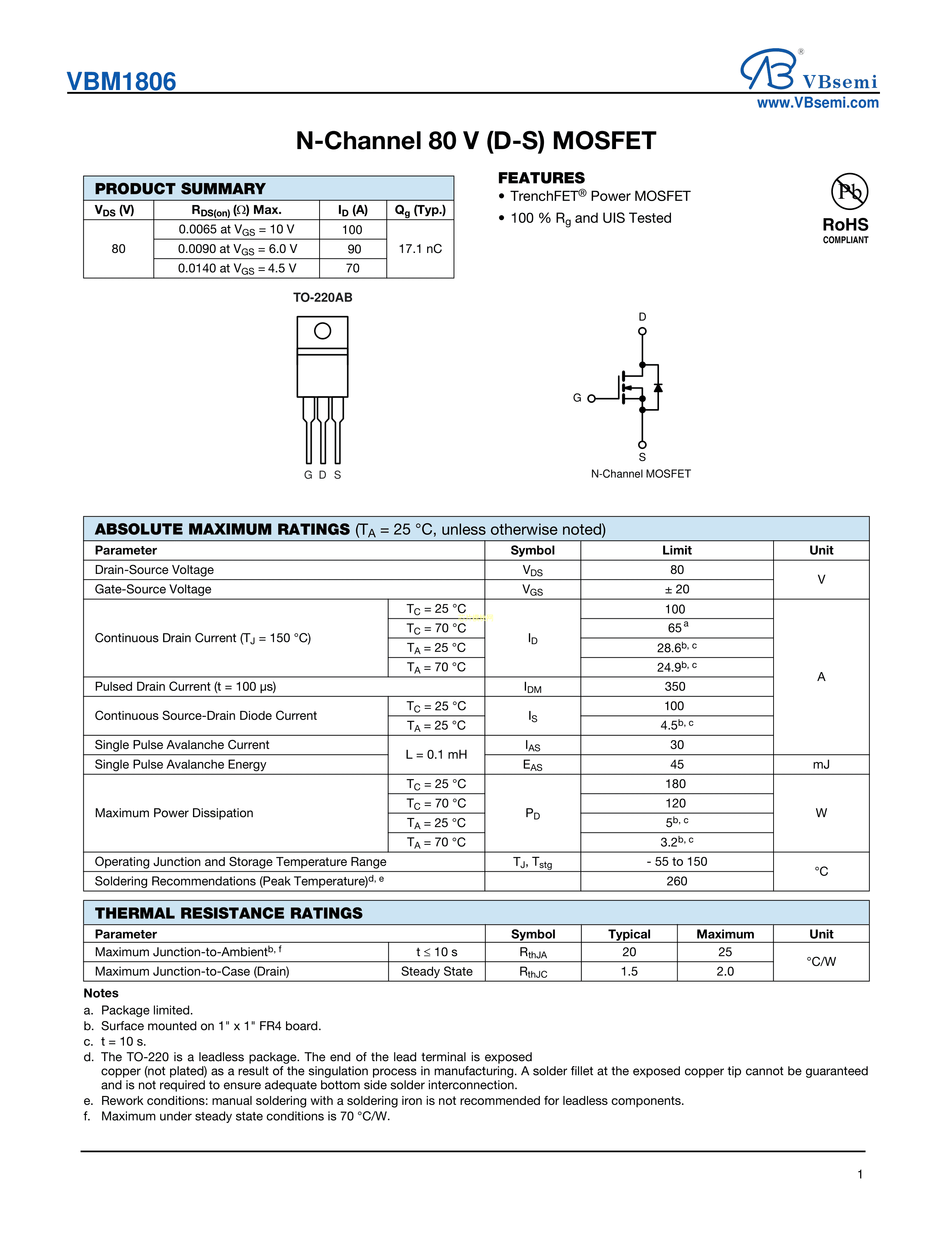 VBM1806数据手册TO-220AB封装VBsemi(台湾微碧)PDF规格书,中英文下载
