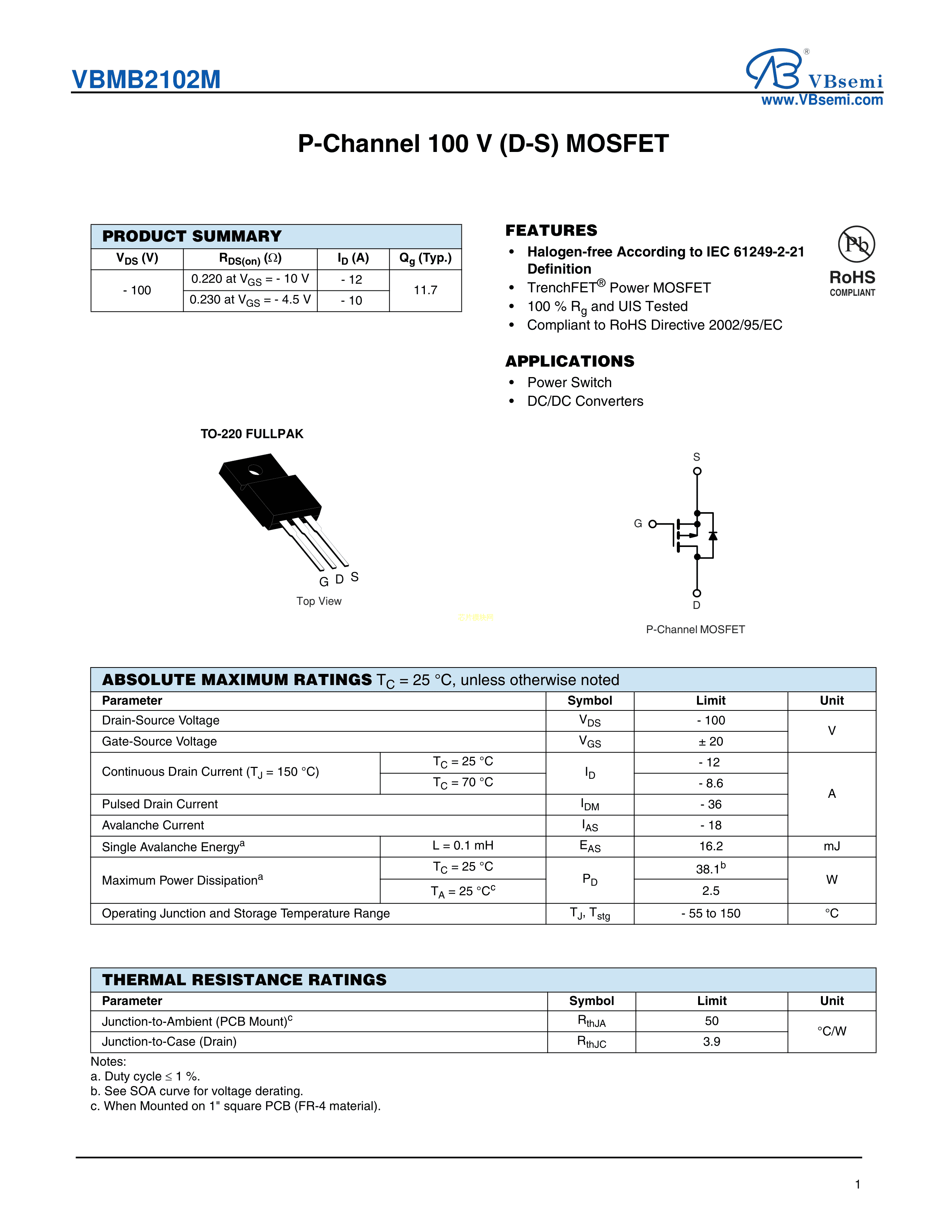 VBMB2102M数据手册TO-220F封装VBsemi(台湾微碧)PDF规格书,中英文下载