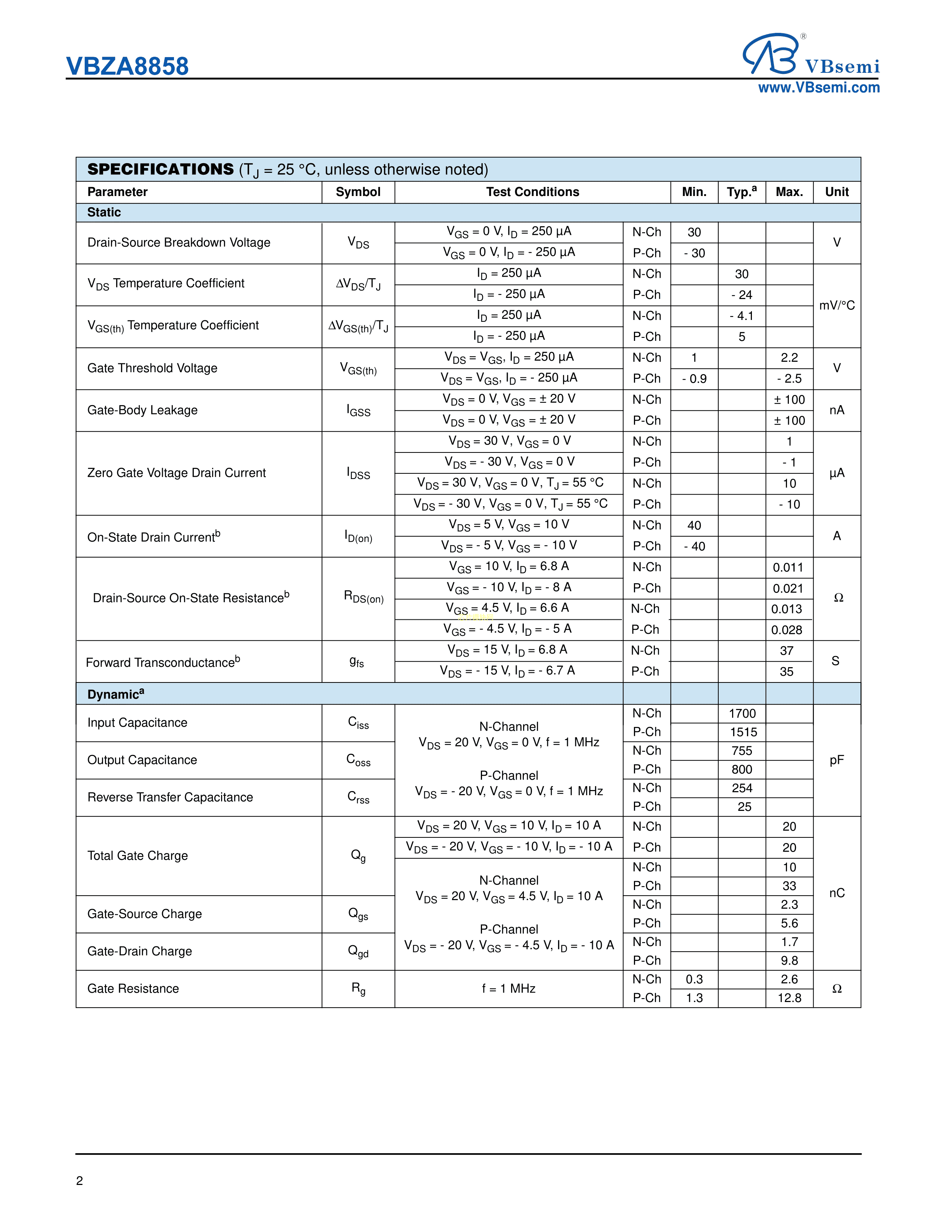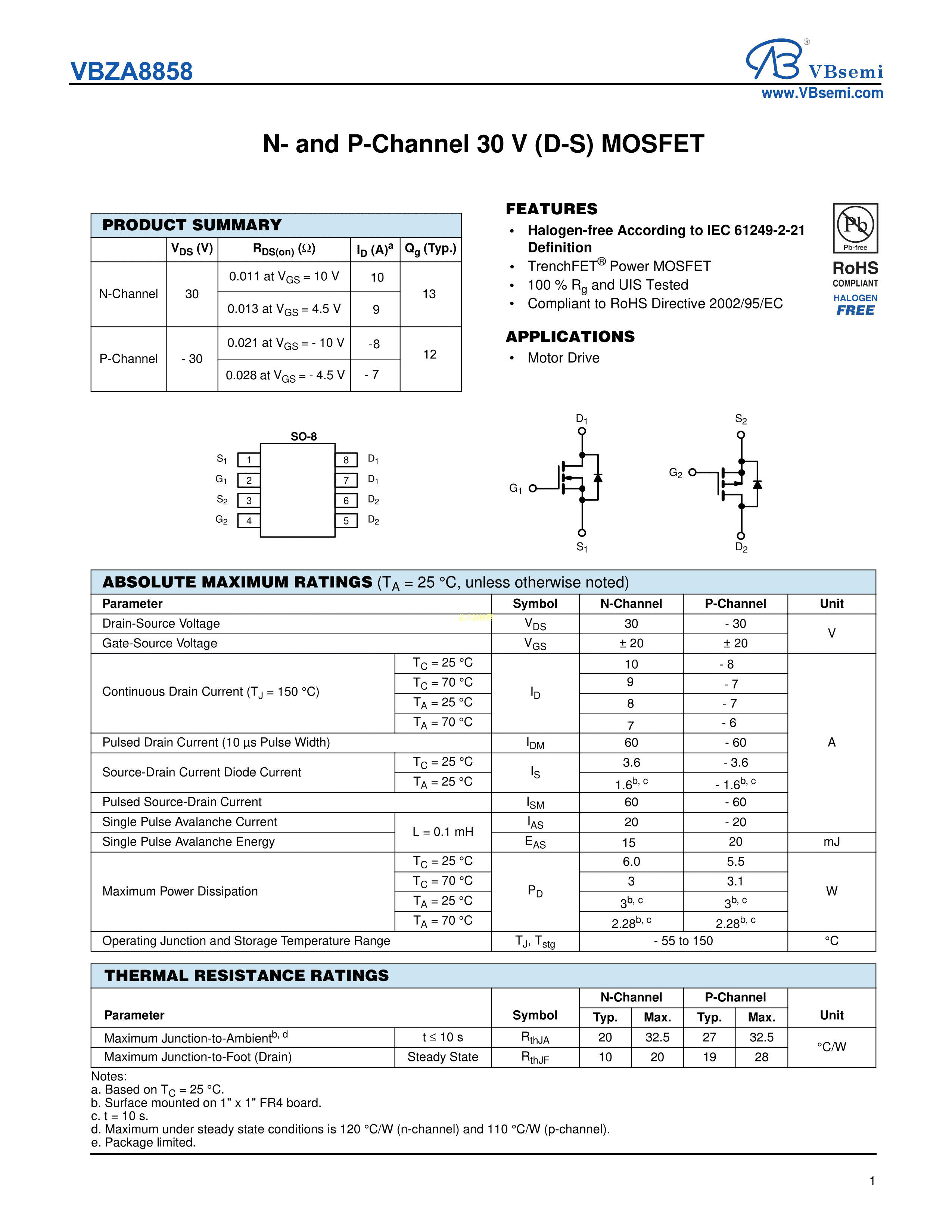 VBZA8858数据手册SO-8封装VBsemi(台湾微碧)PDF规格书,中英文下载