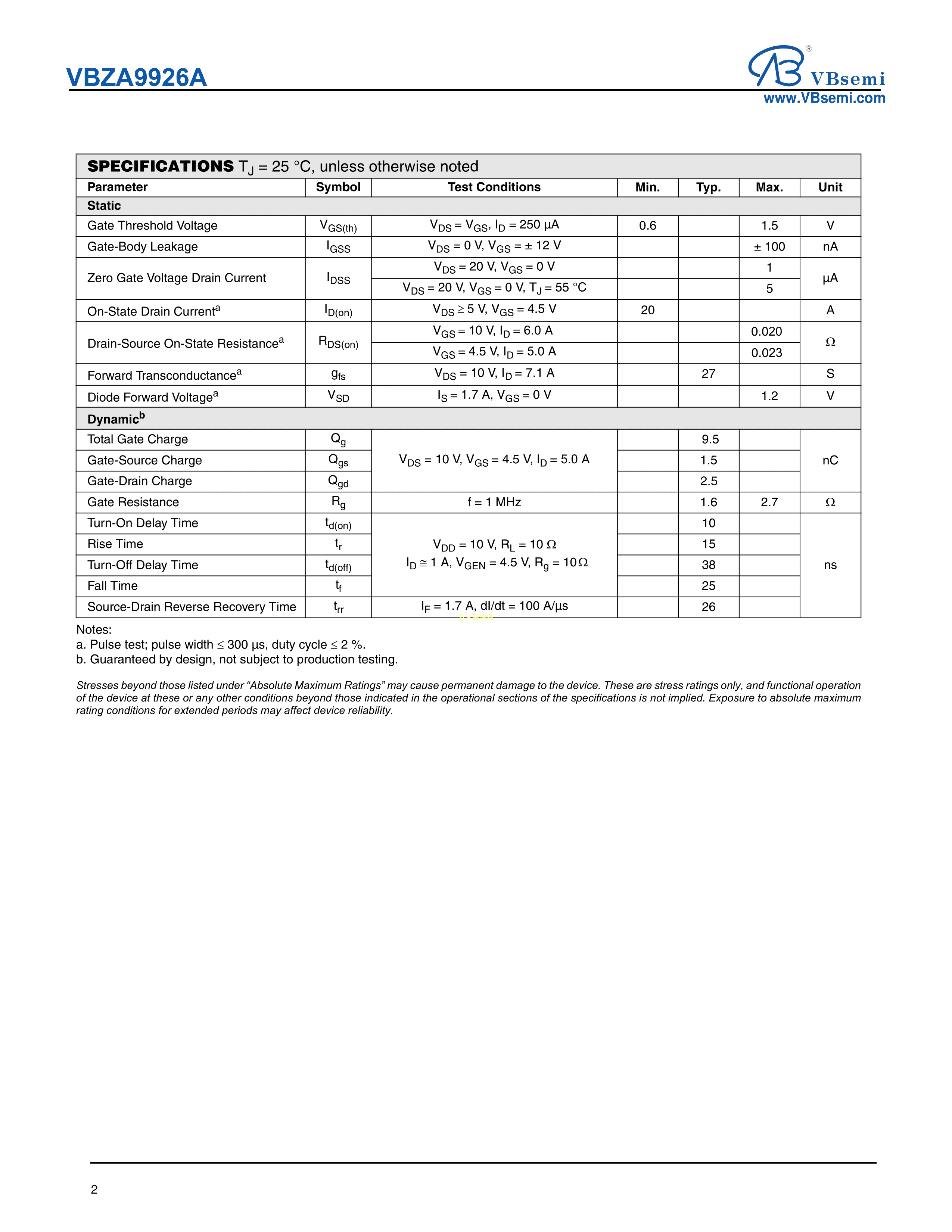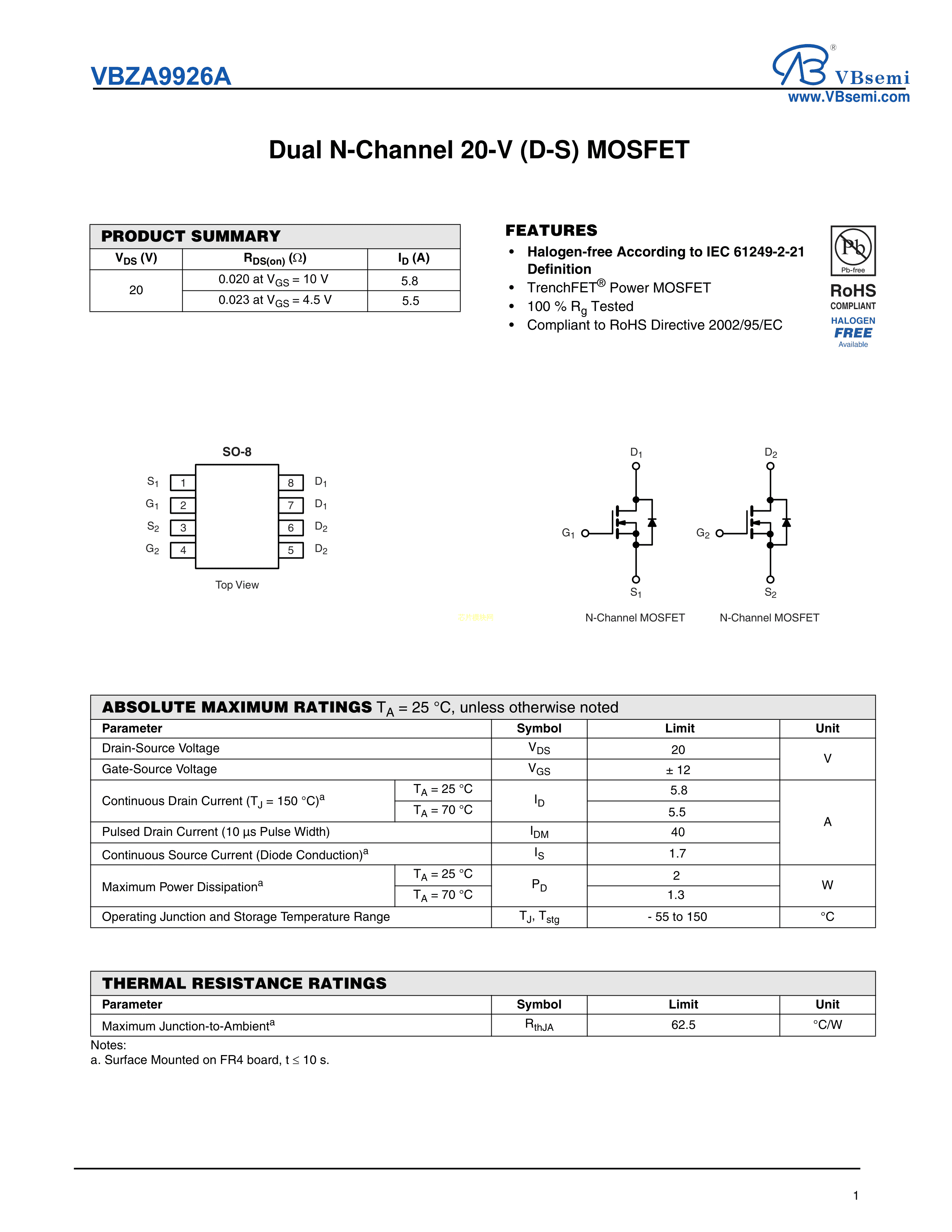 VBZA9926A数据手册SO-8封装VBsemi(台湾微碧)PDF规格书,中英文下载