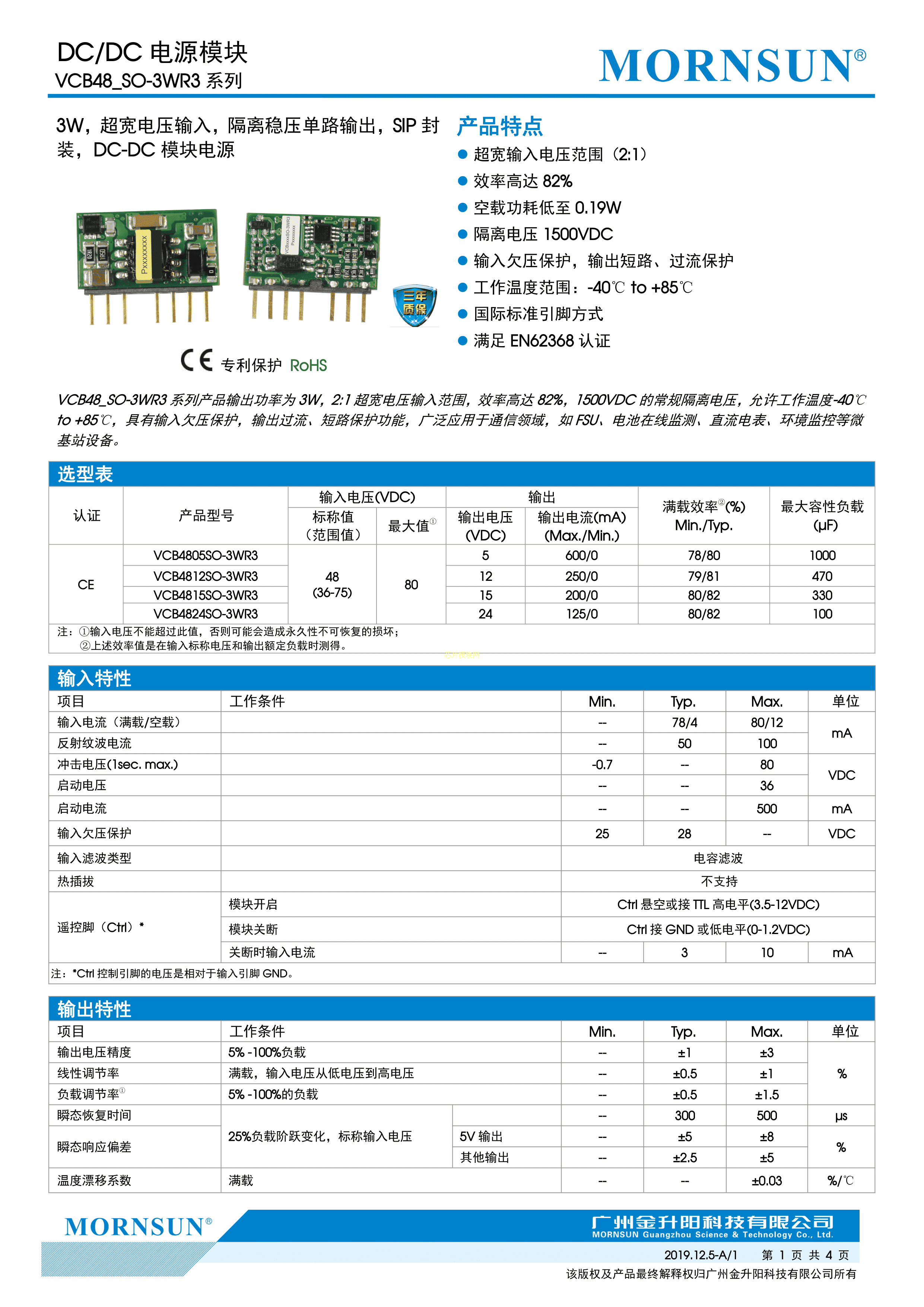 VCB4815SO-3WR3数据手册插件封装MORNSUN(金升阳)PDF规格书,中英文下载