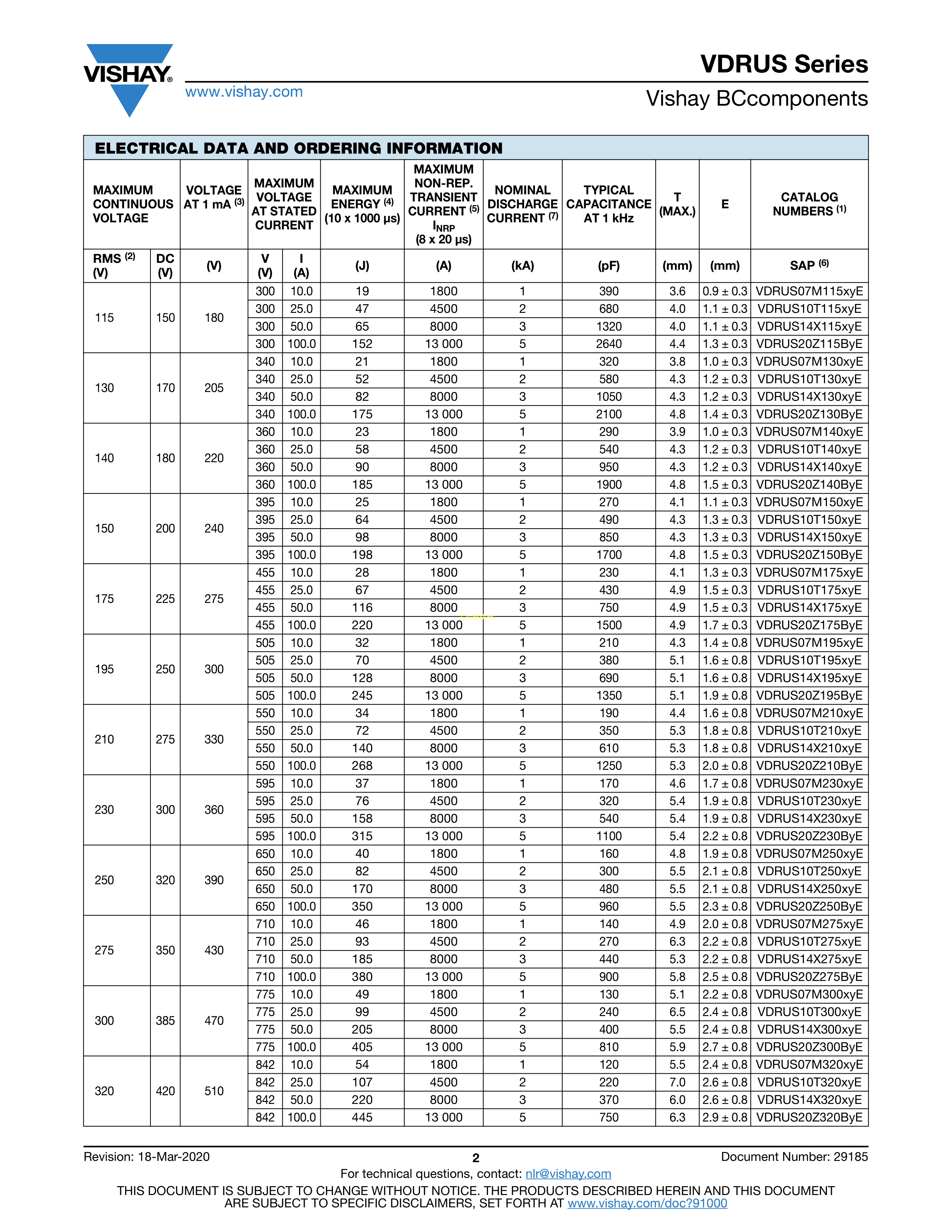 VDRUS14X275BSE数据手册径向引线封装VISHAY(威世)PDF规格书,中英文下载