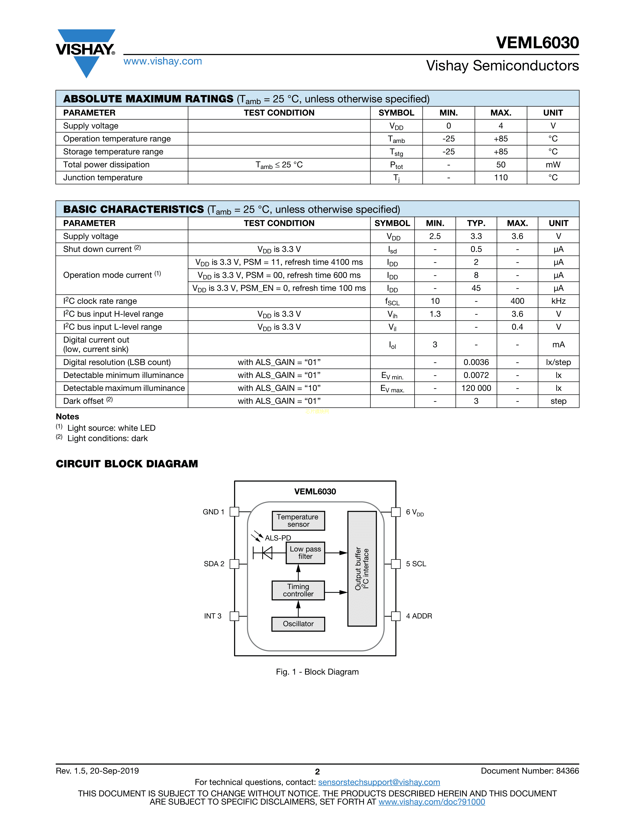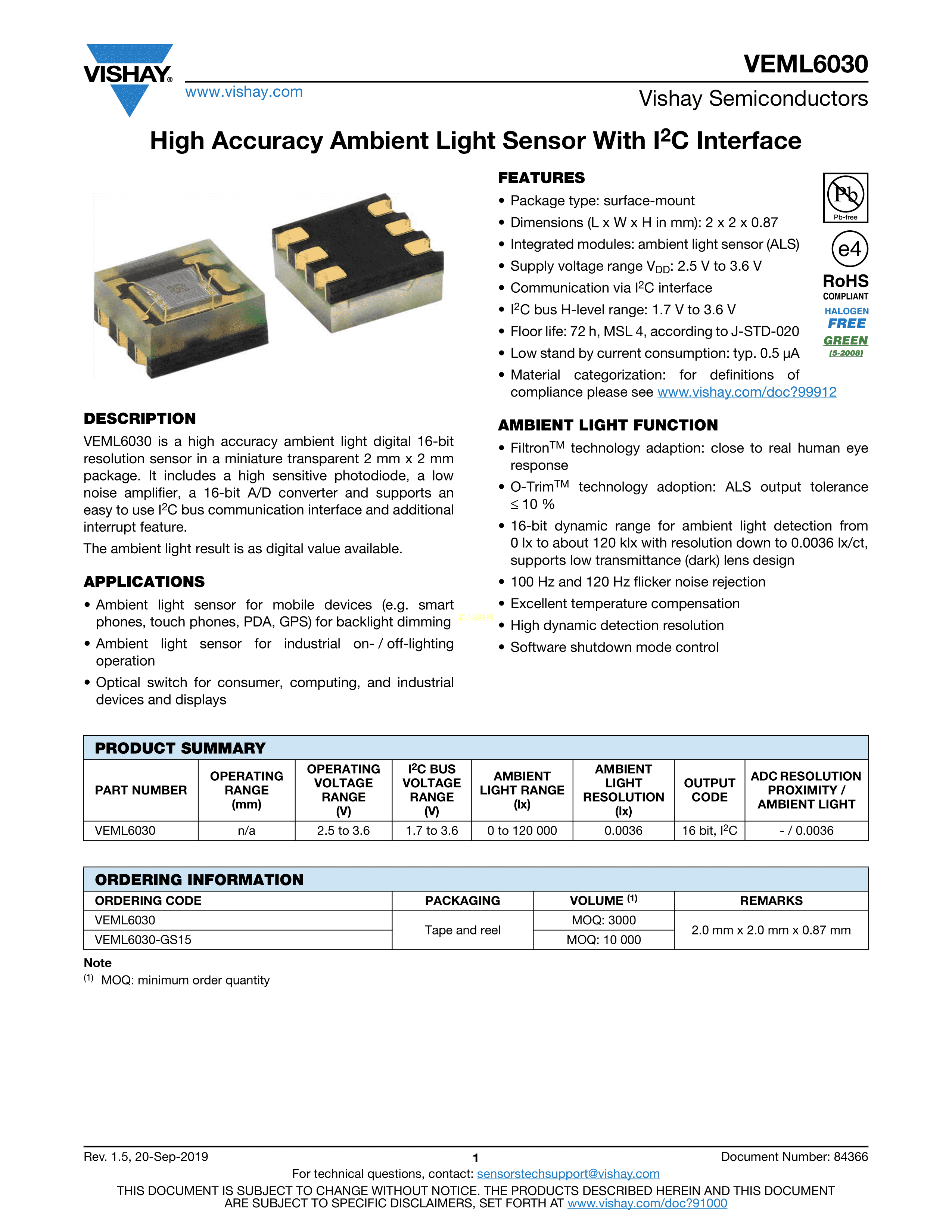 VEML6030-GS15数据手册SMD-6封装VISHAY(威世)PDF规格书,中英文下载